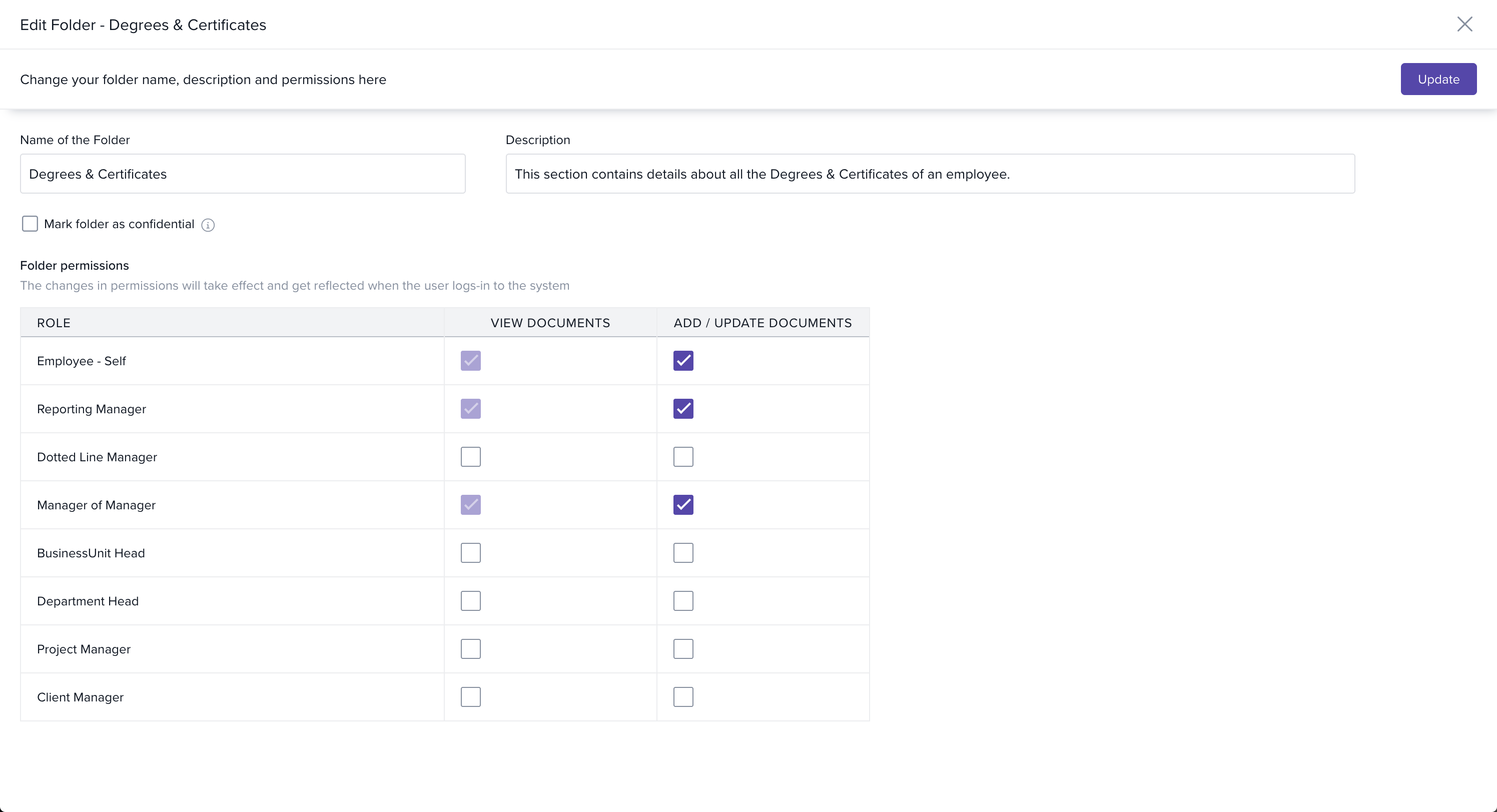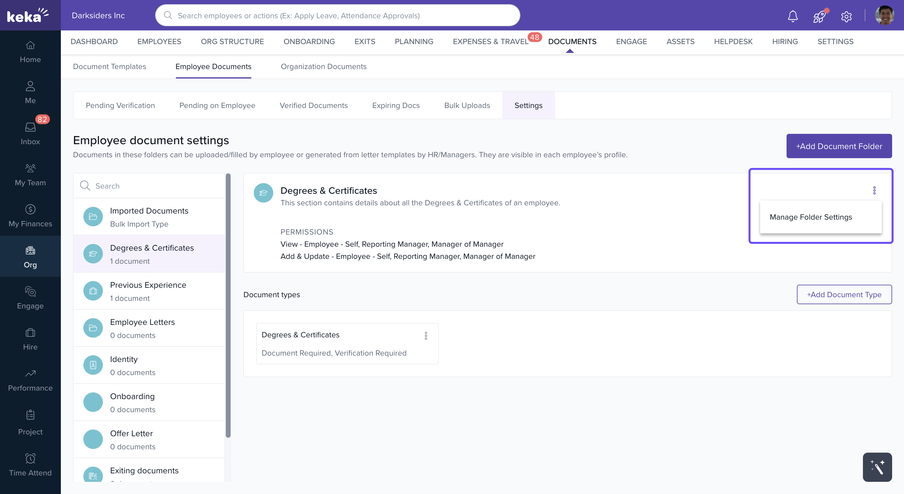 To ensure proper organization, accessibility, and confidentiality, Keka allows you to update both document fields and folder settings as per your company’s requirements.
