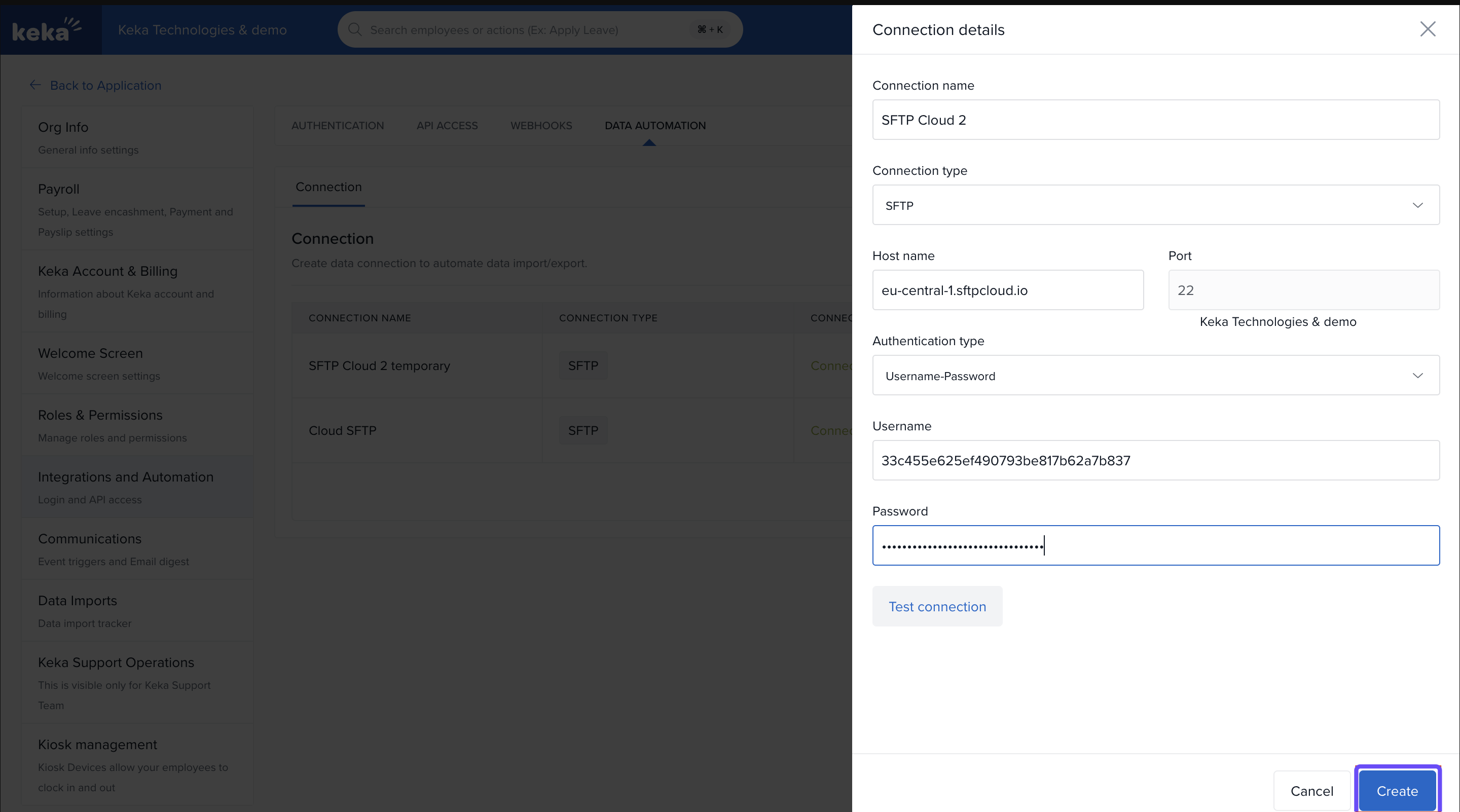- Enter your SFTP credentials (username and password or private key) provided by your IT team. Click Test Connection to verify, and then click Create once successful.