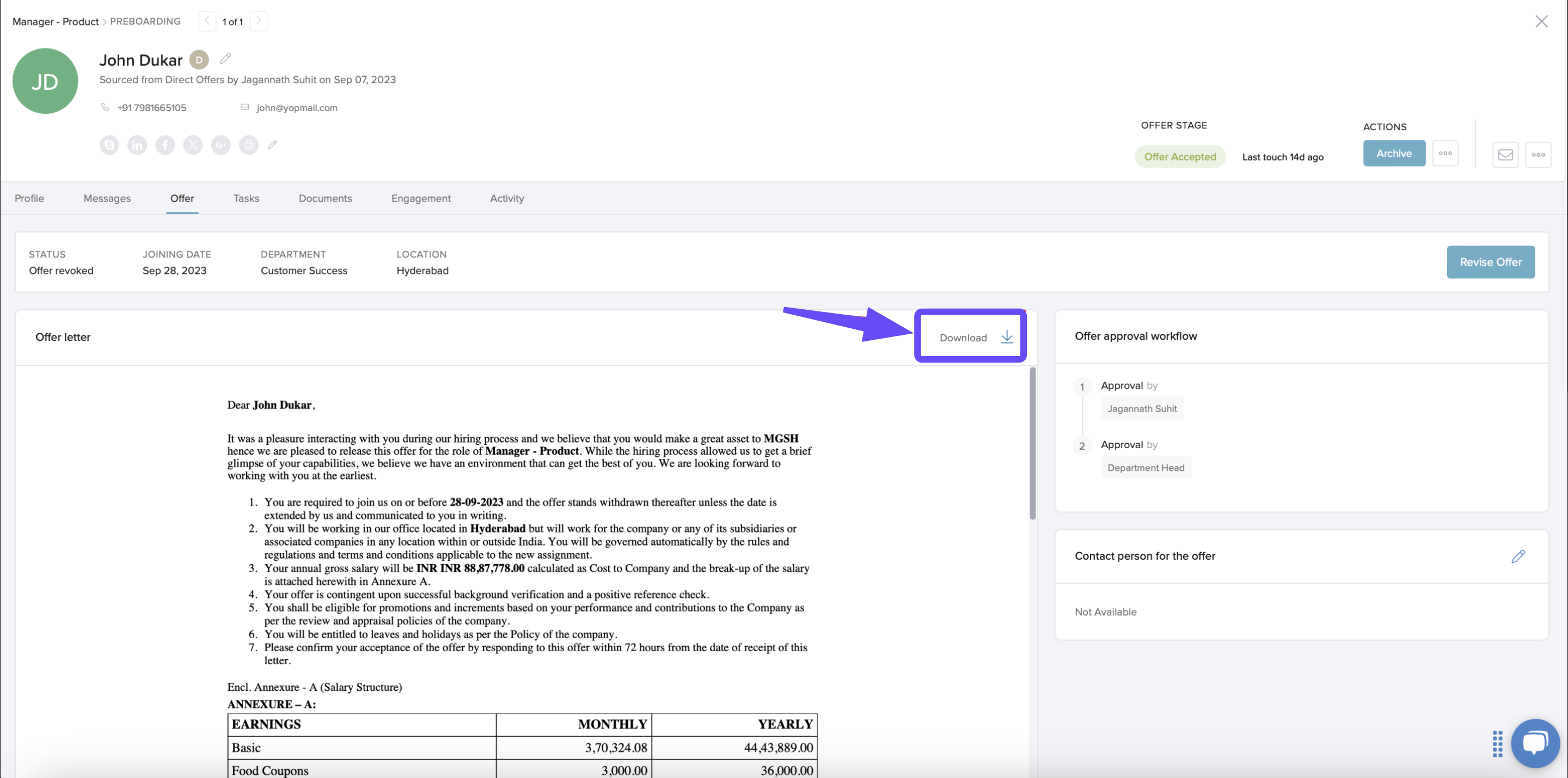 A. Download offer letter can be done from candidate profile currently. We will get this option back soon on the Preboarding page itself.