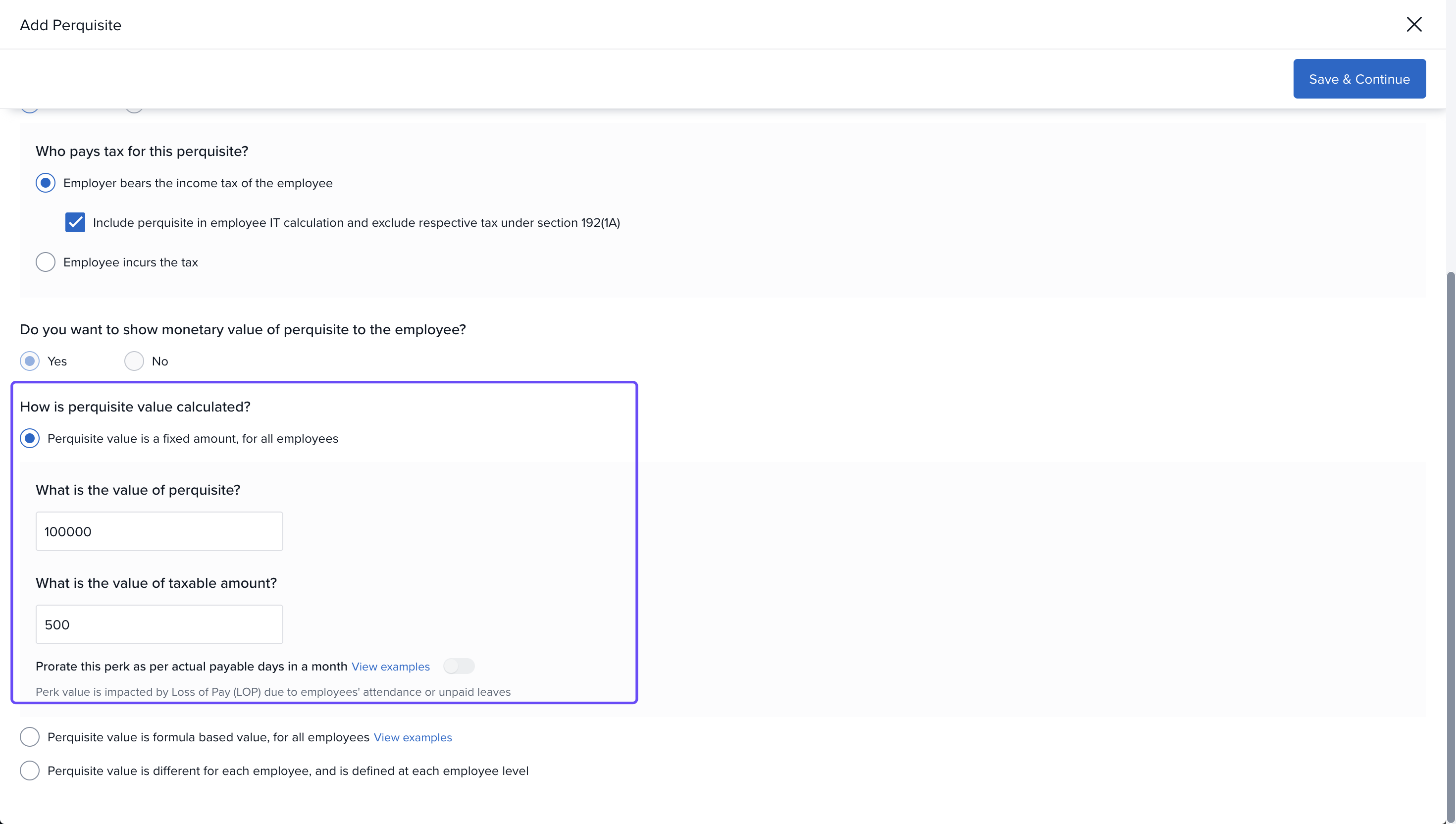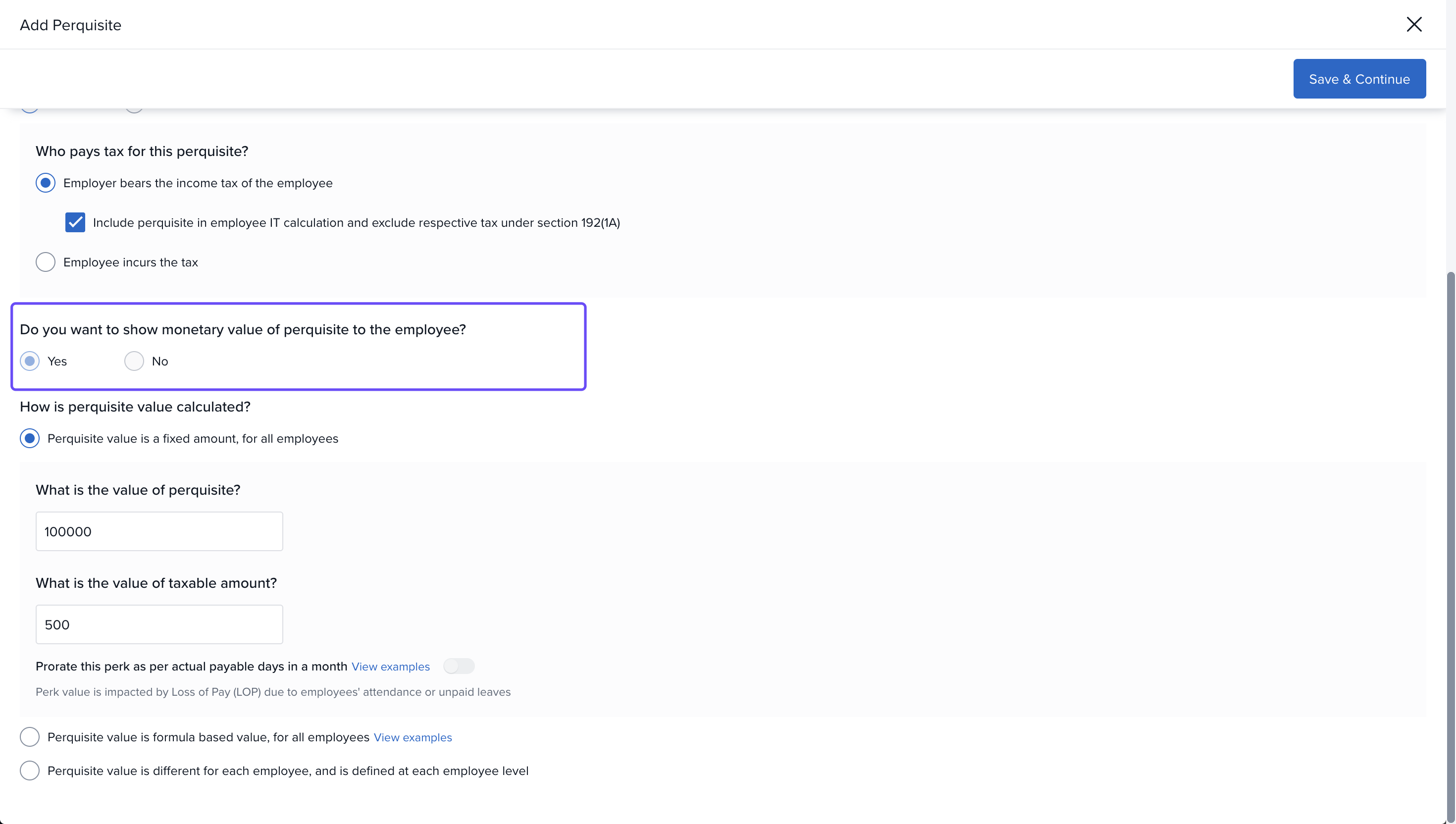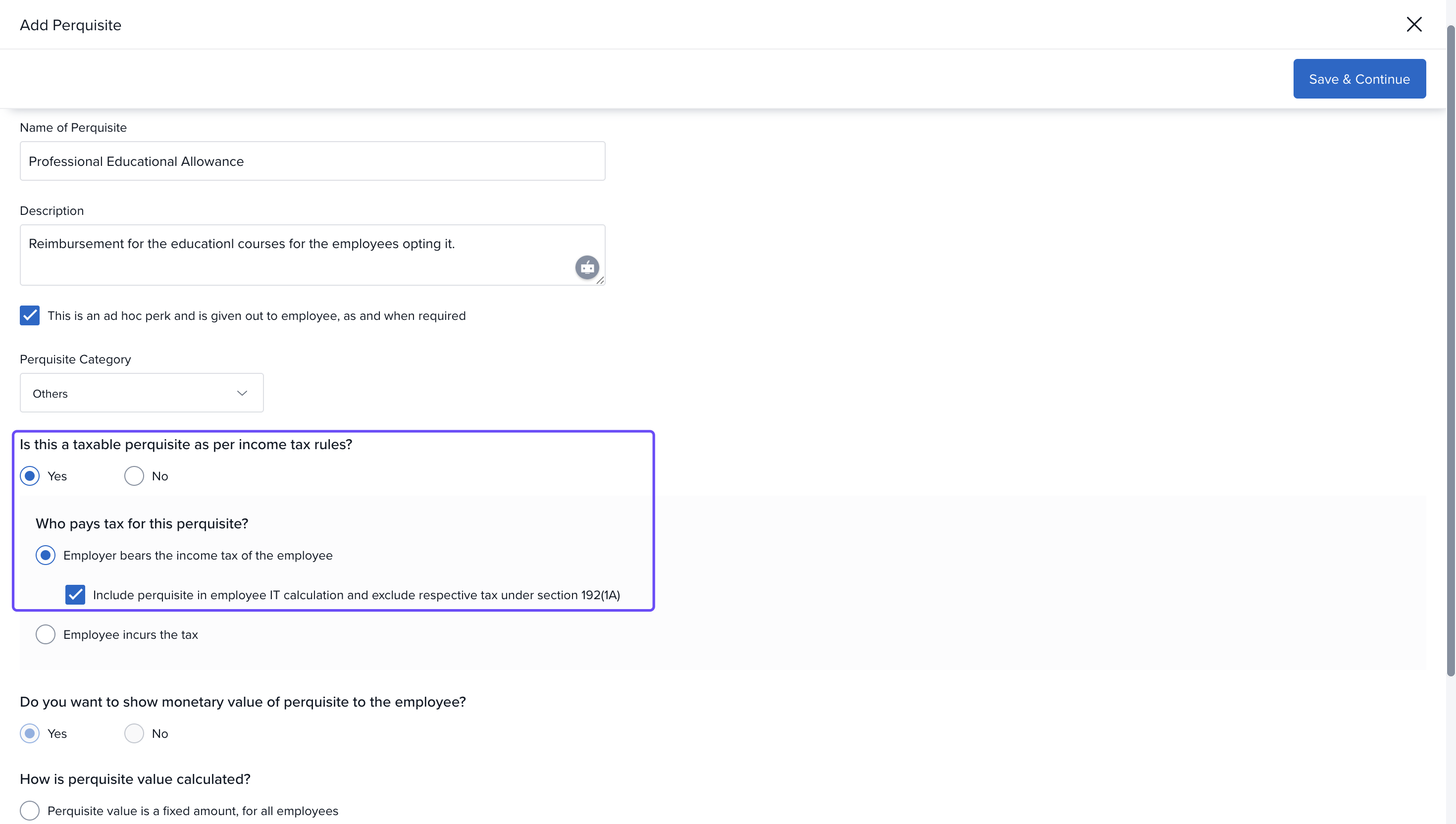 The next set of options determine the tax implications of the perk. You can choose if the perk is taxable or not as per the income tax regulations.