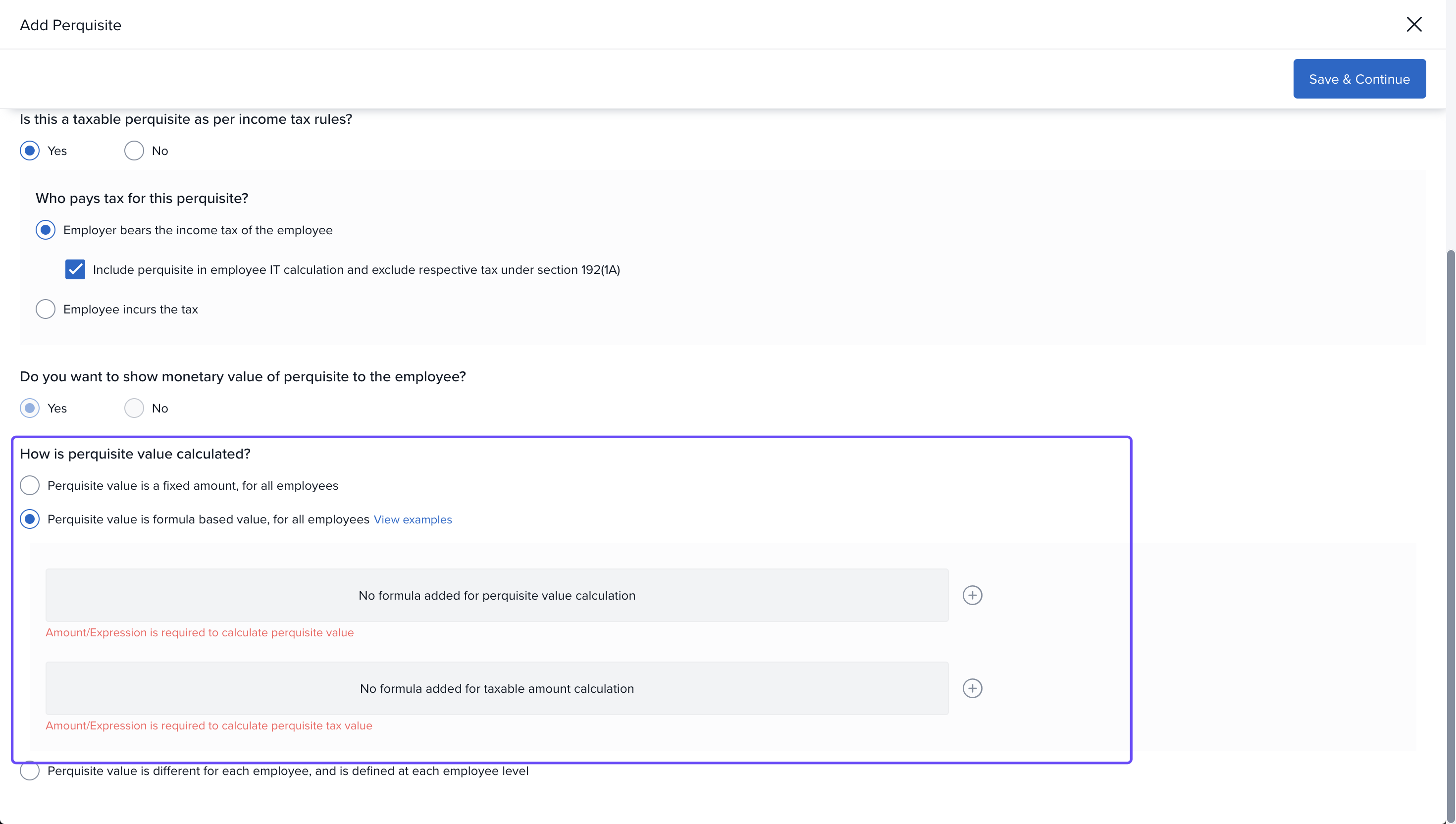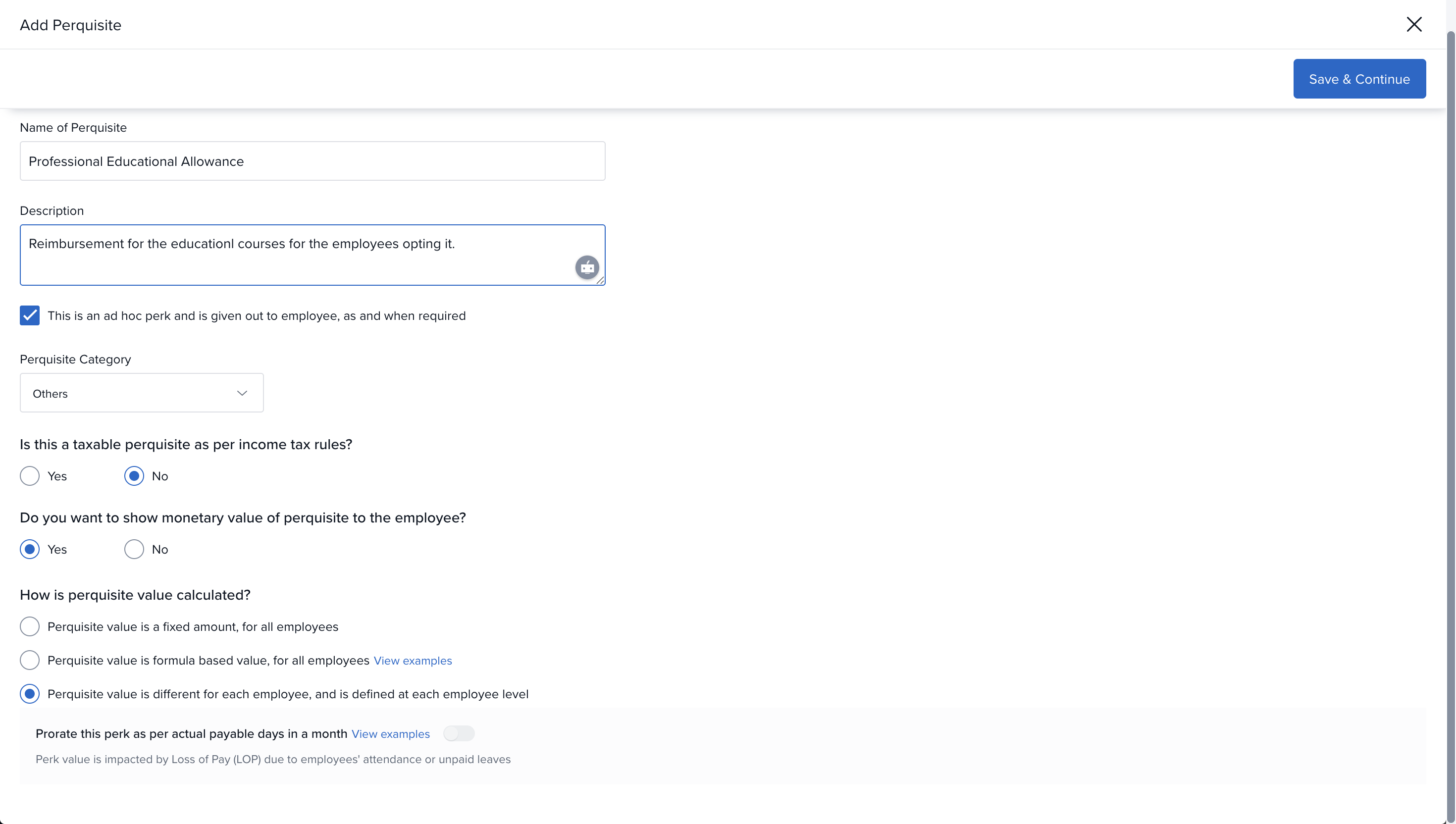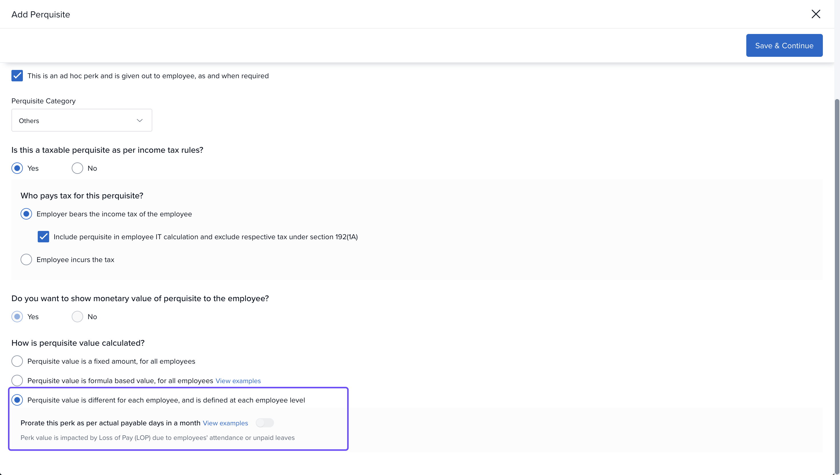 The next set of options determine the tax implications of the perk. You can choose if the perk is taxable or not as per the income tax regulations.