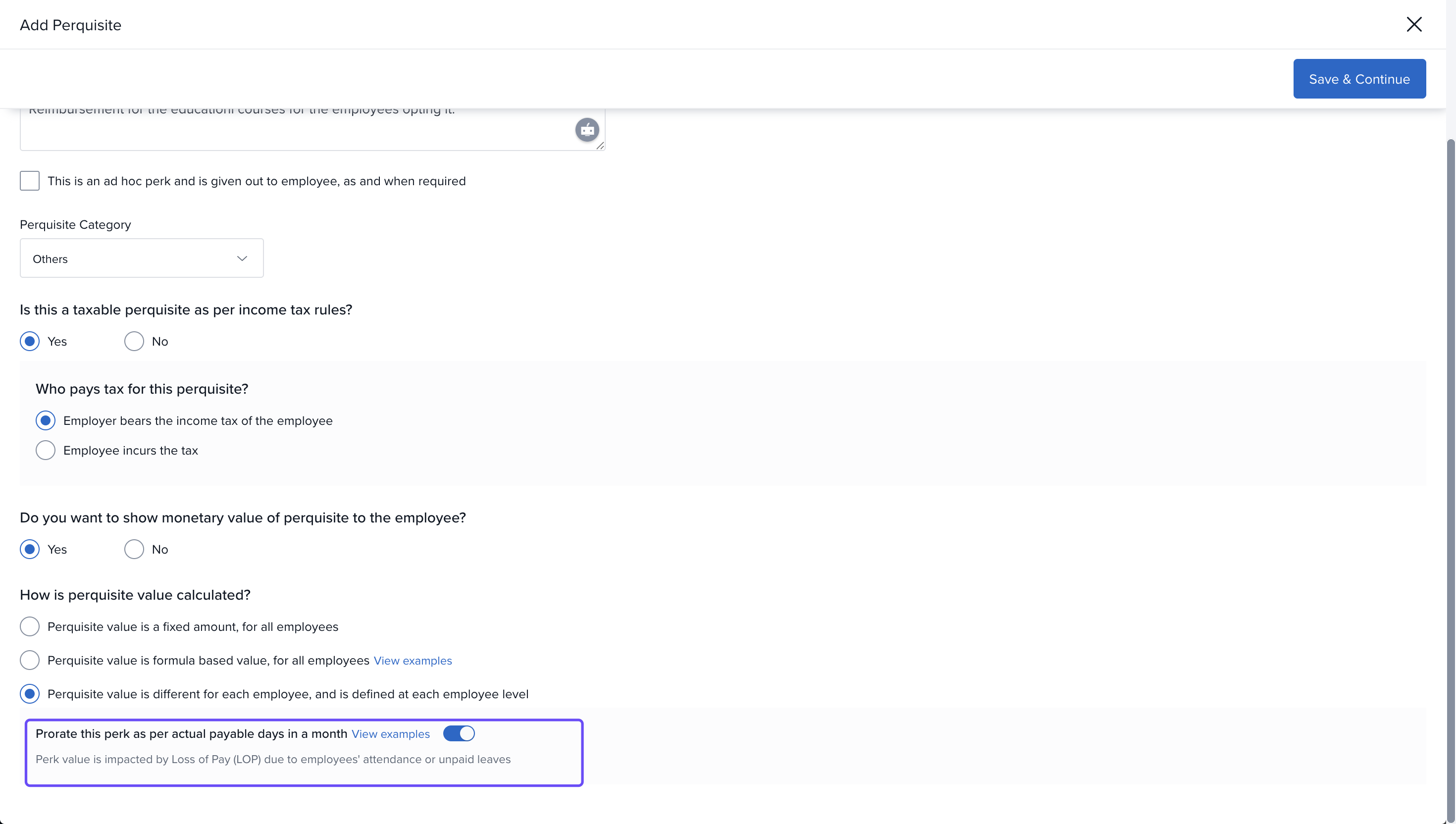 Enable Proration: Adjust the perk value based on actual days worked.