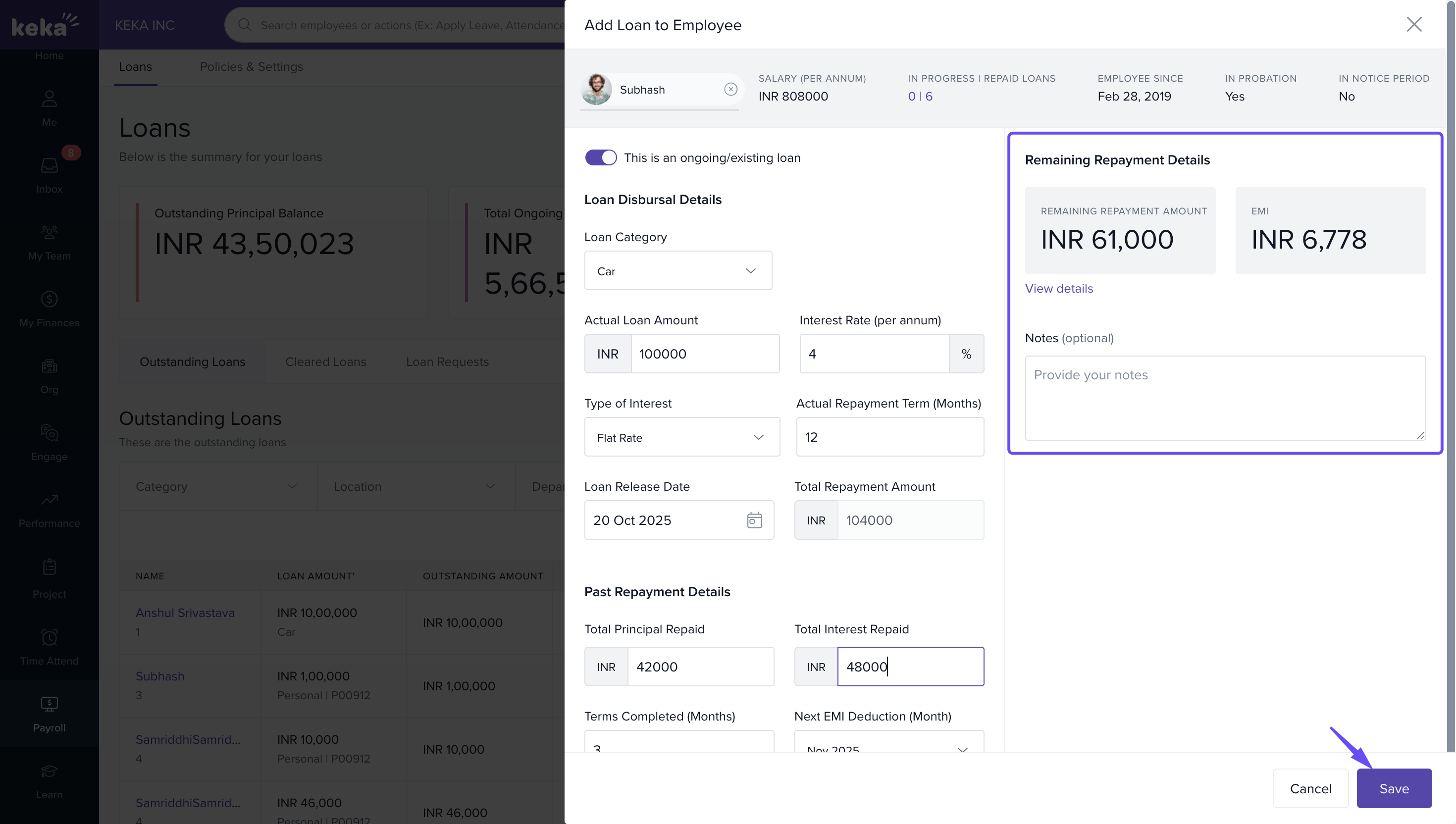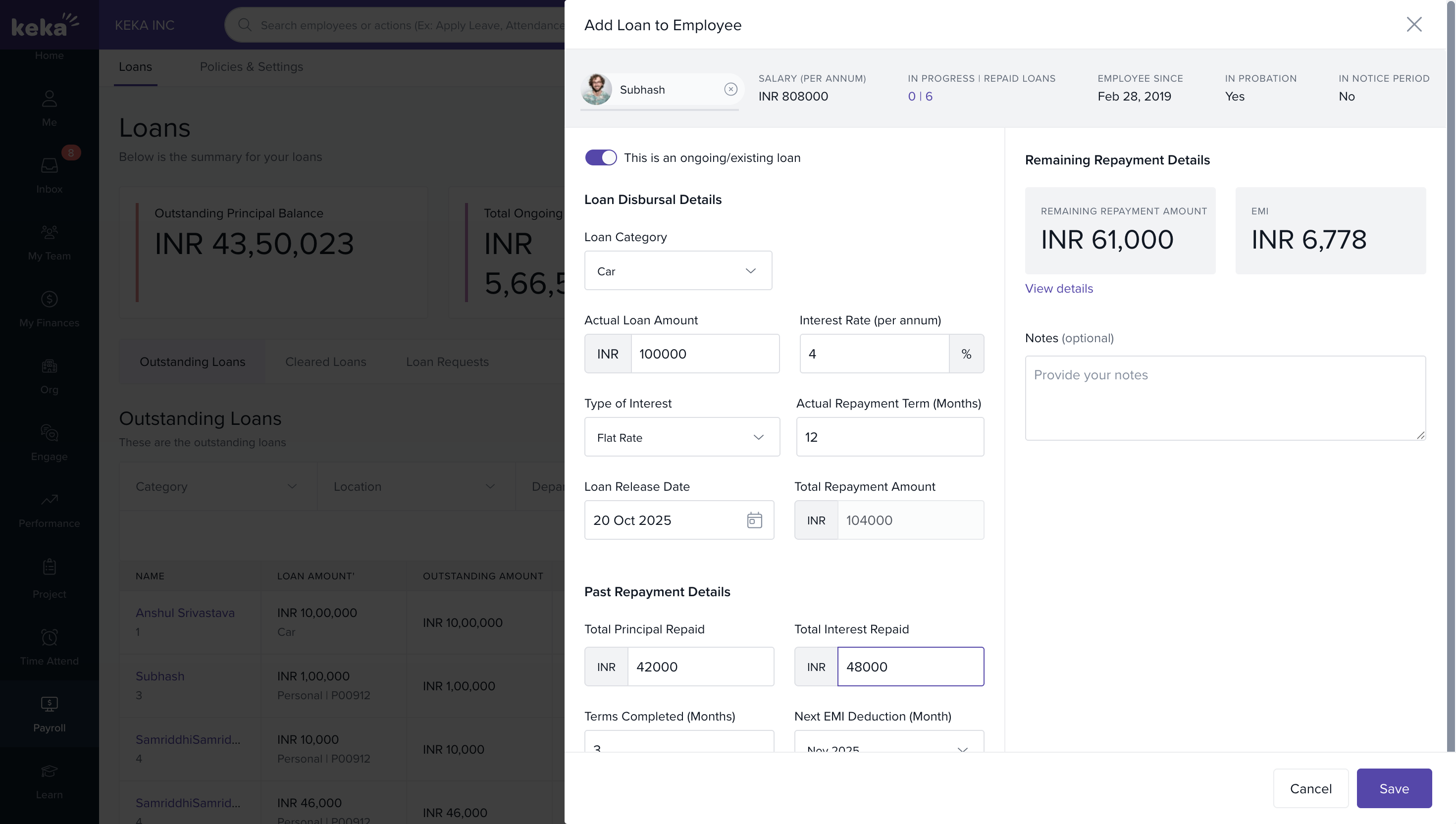 Adding ongoing loans on Keka