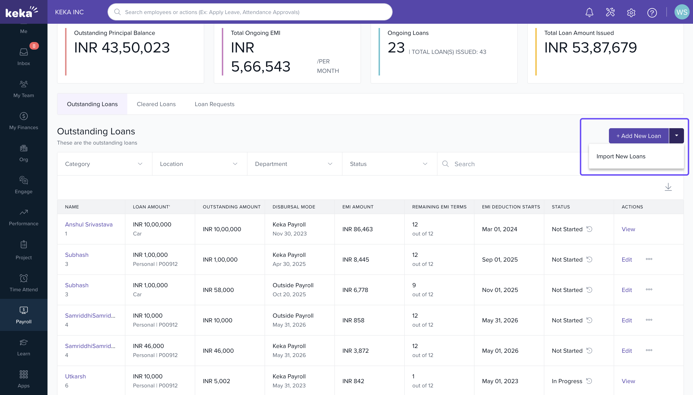 Ongoing loans are loans that have already been disbursed and partially repaid by employees outside of Keka. Using Keka Payroll, these loans can be added, tracked, and managed efficiently, allowing for smooth recovery of the remaining amount directly through payroll.