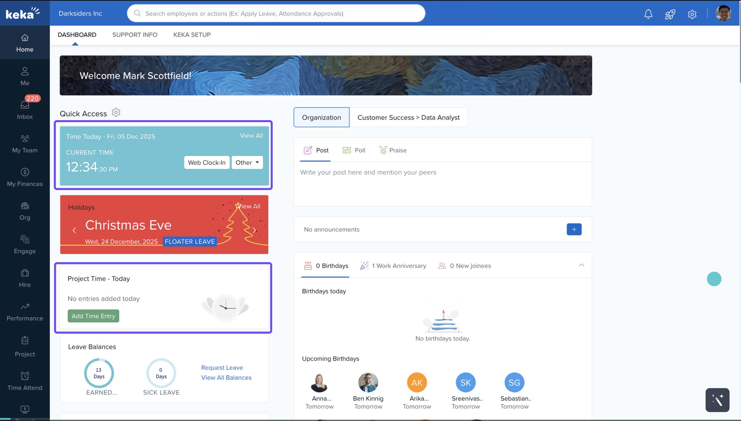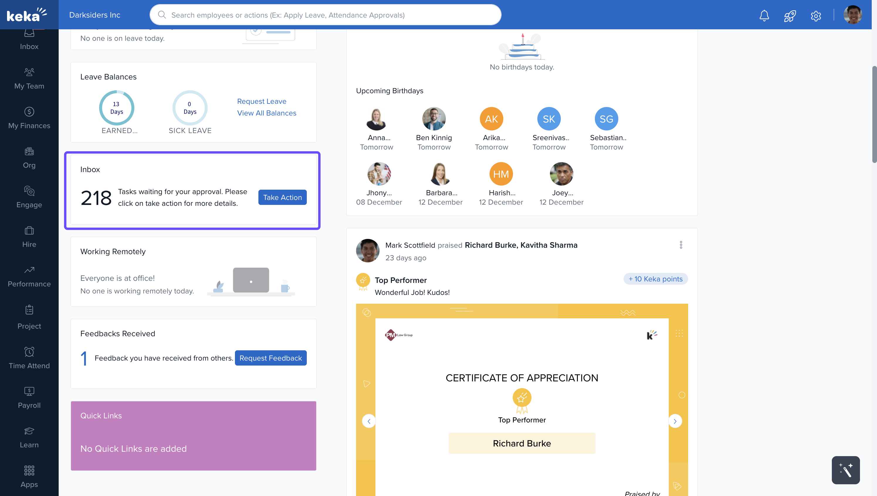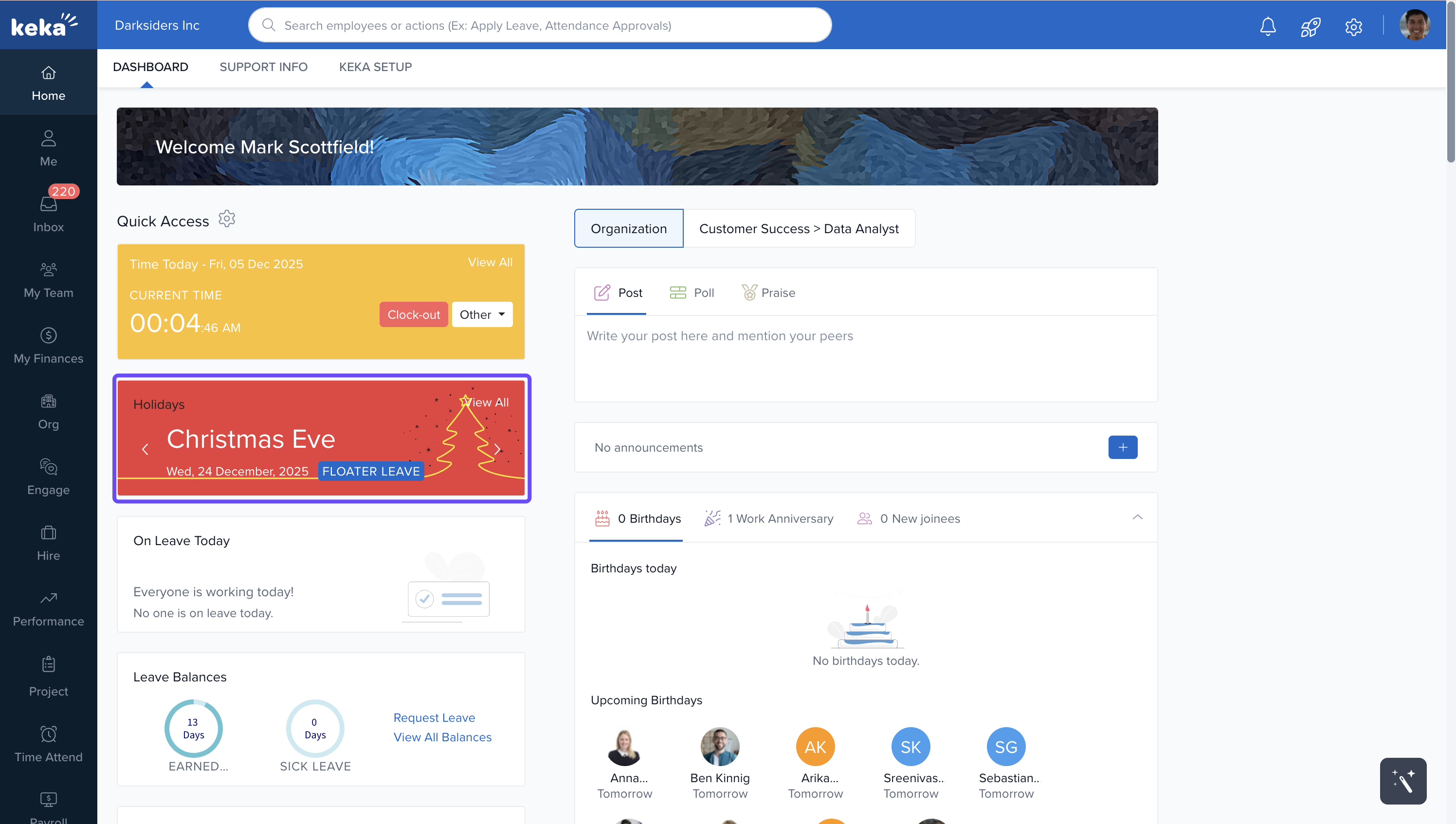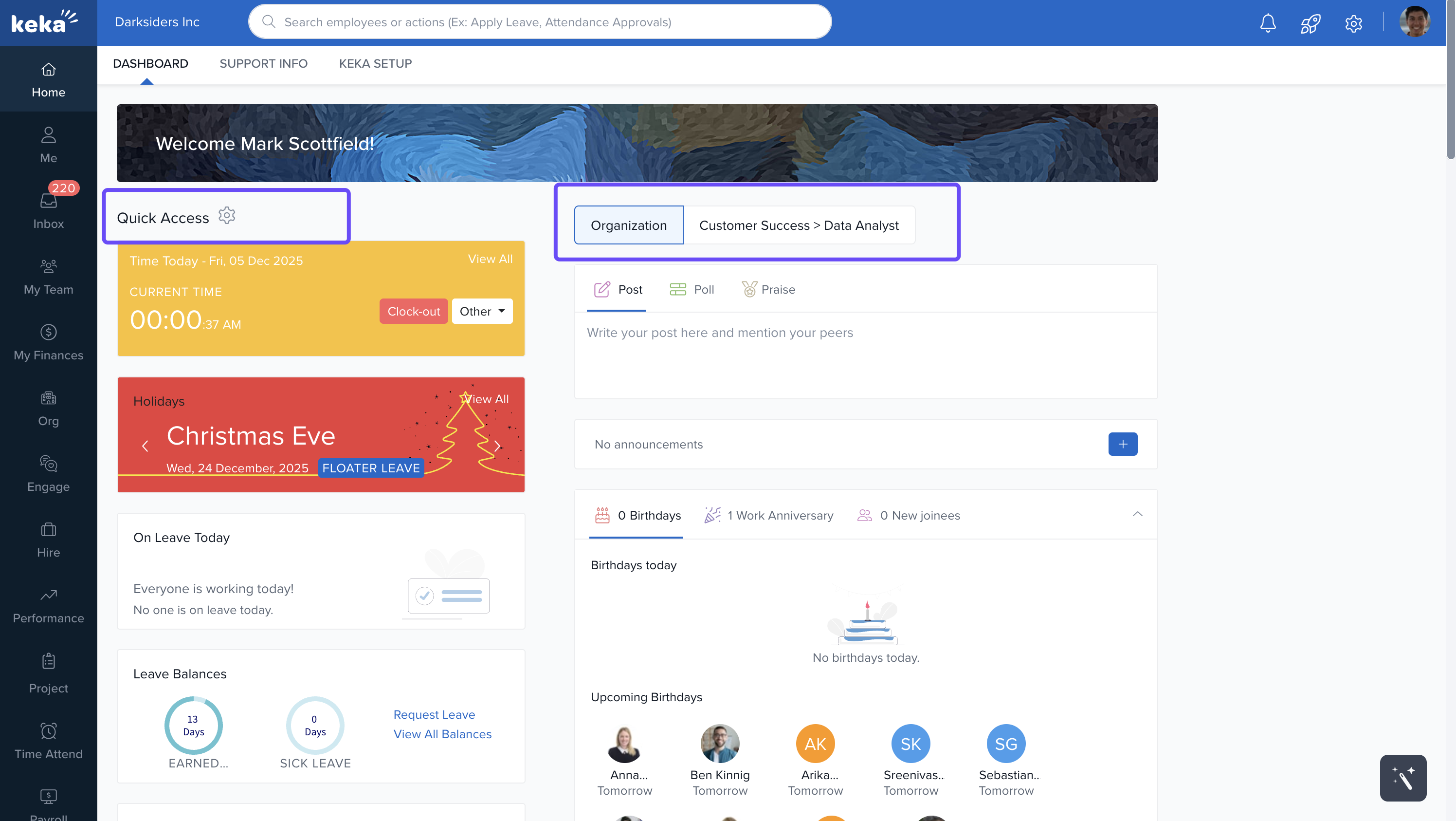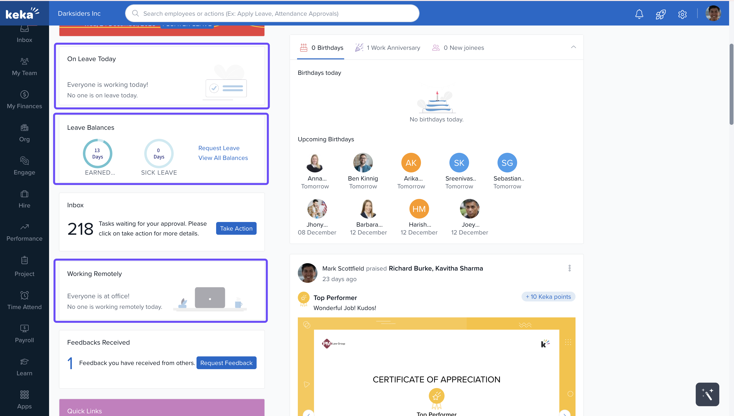 The Keka dashboard is your personalised workspace that appears when you log in. It provides easy access to the tools and information you need most, using visual widgets and interactive elements.