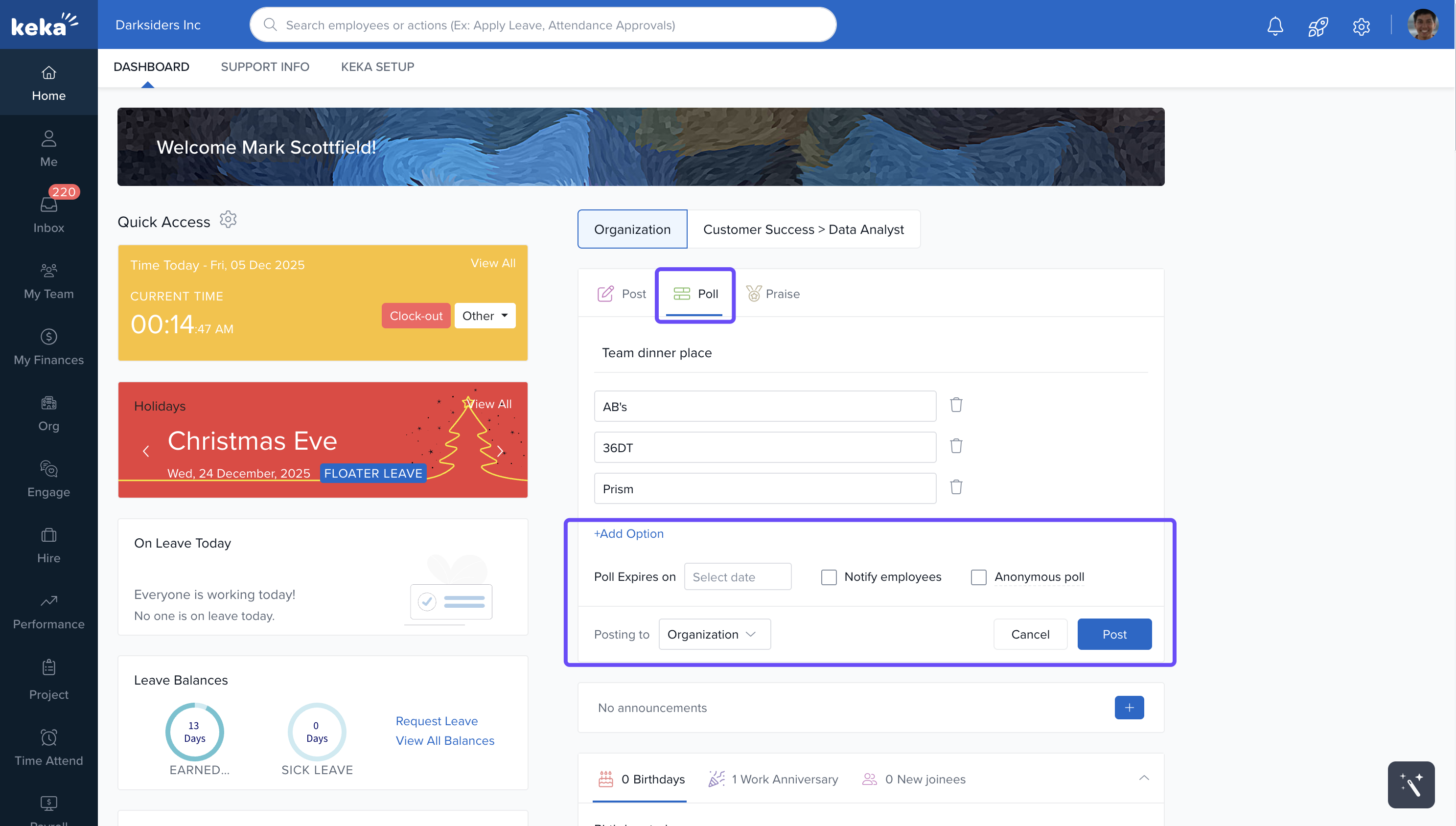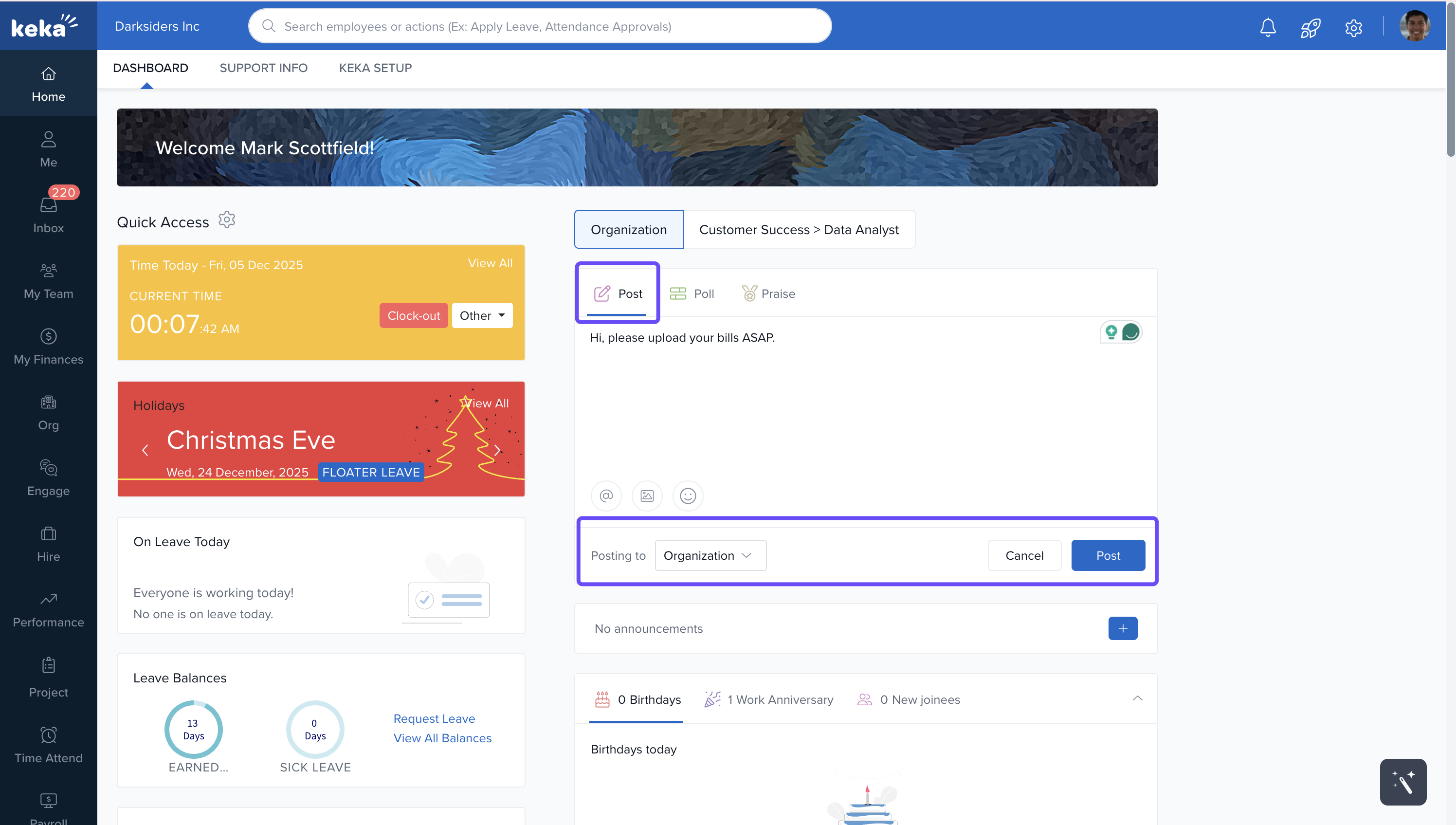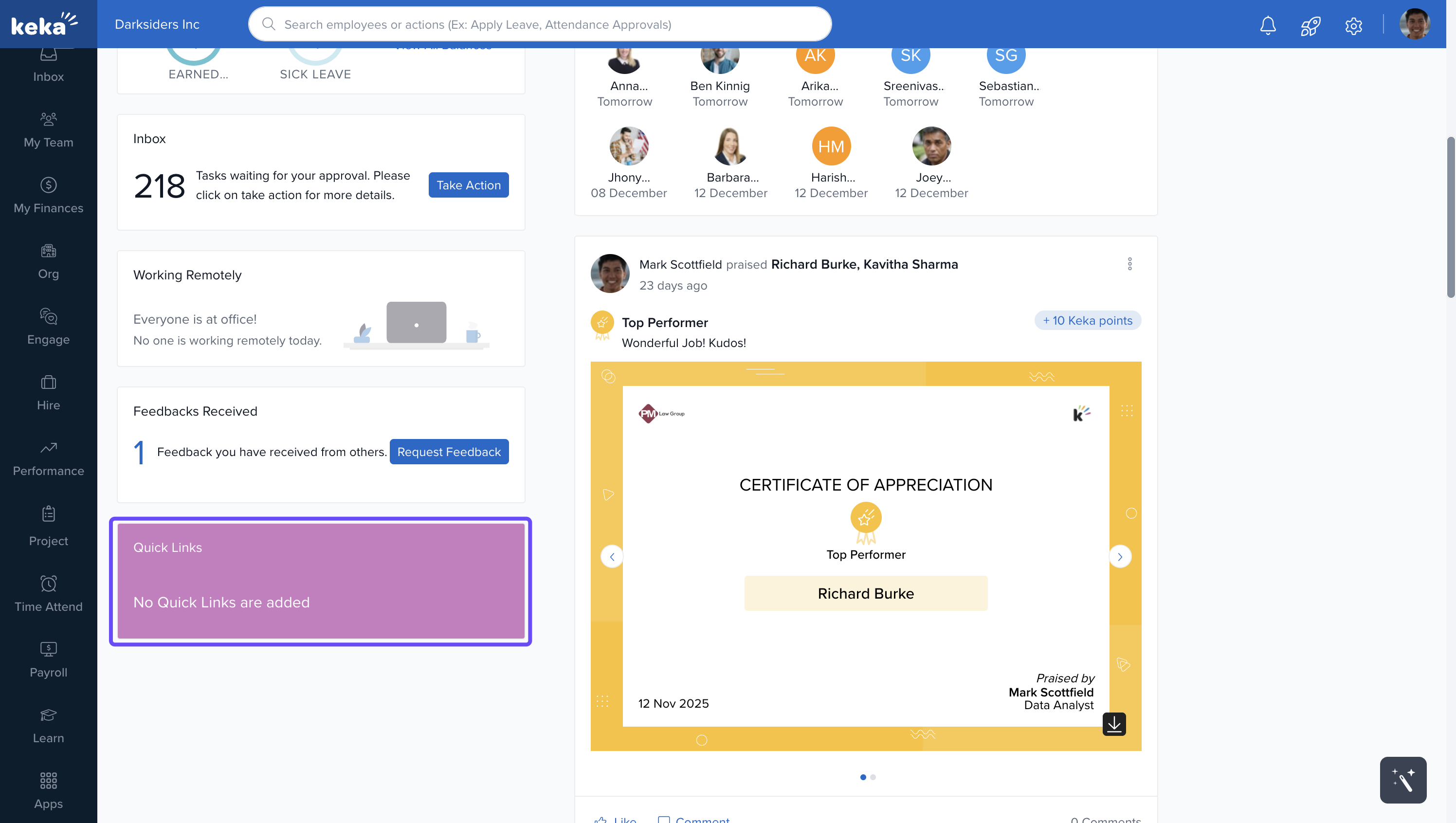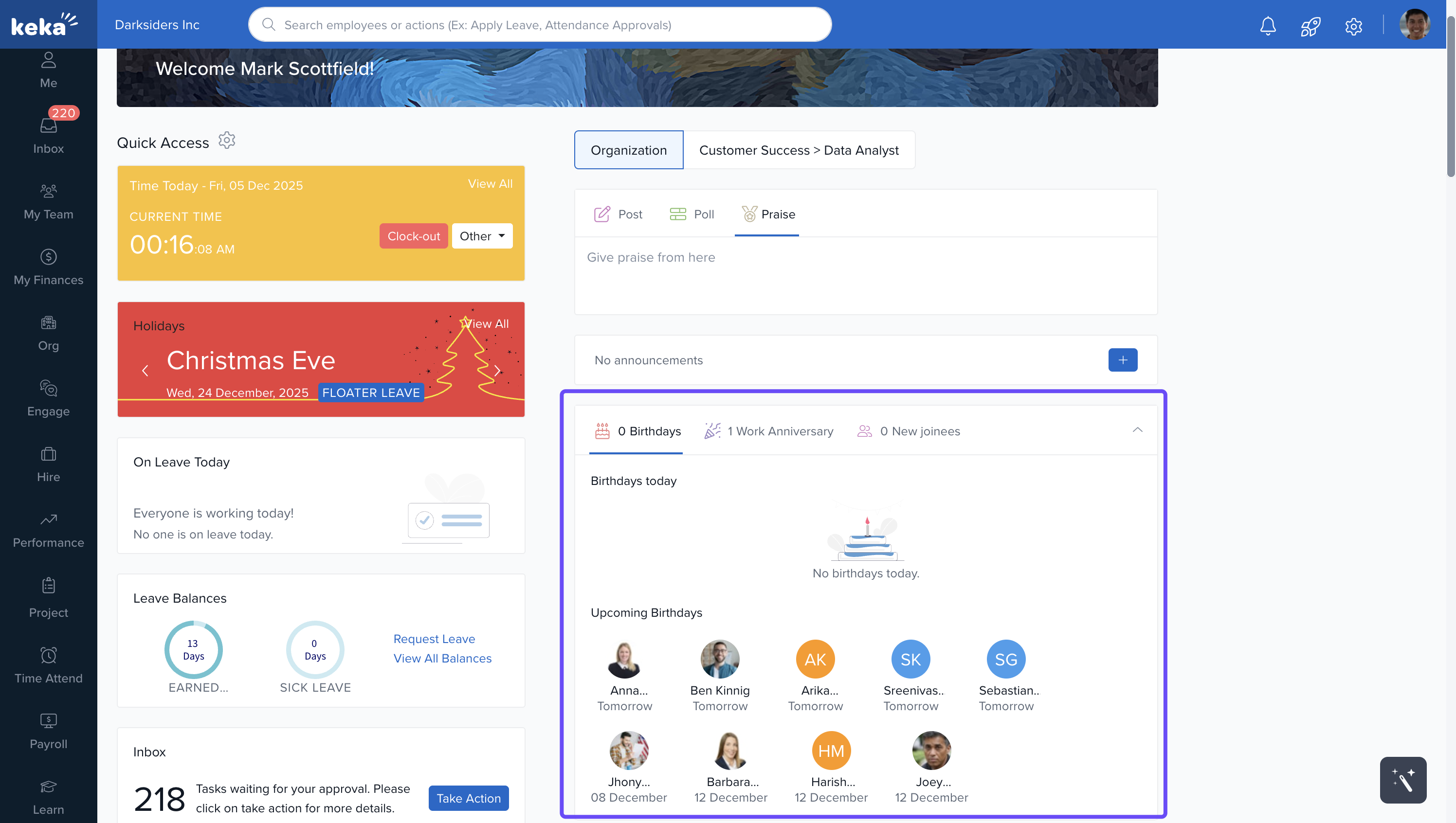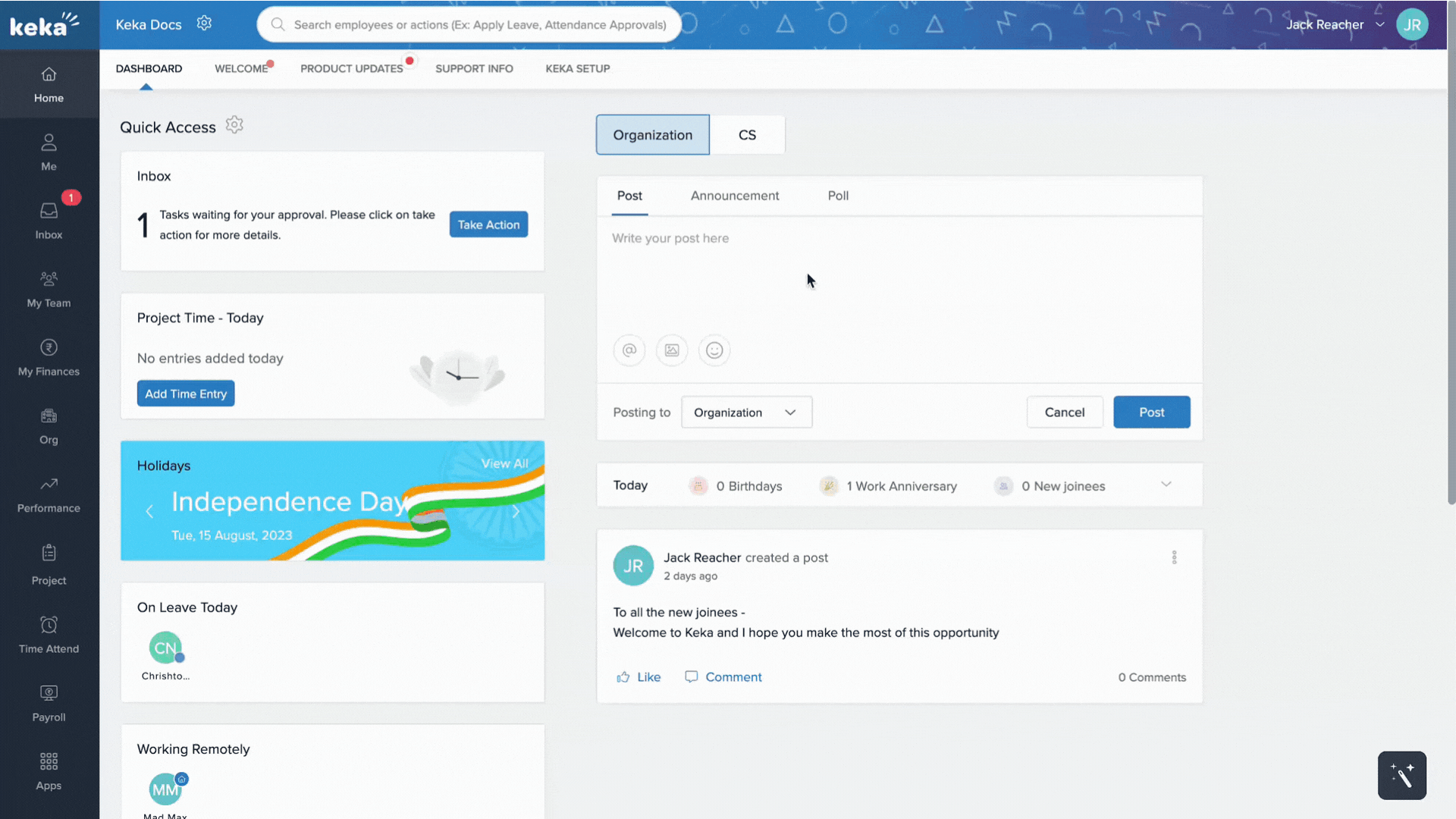 The Keka dashboard is your personalised workspace that appears when you log in. It provides easy access to the tools and information you need most, using visual widgets and interactive elements.