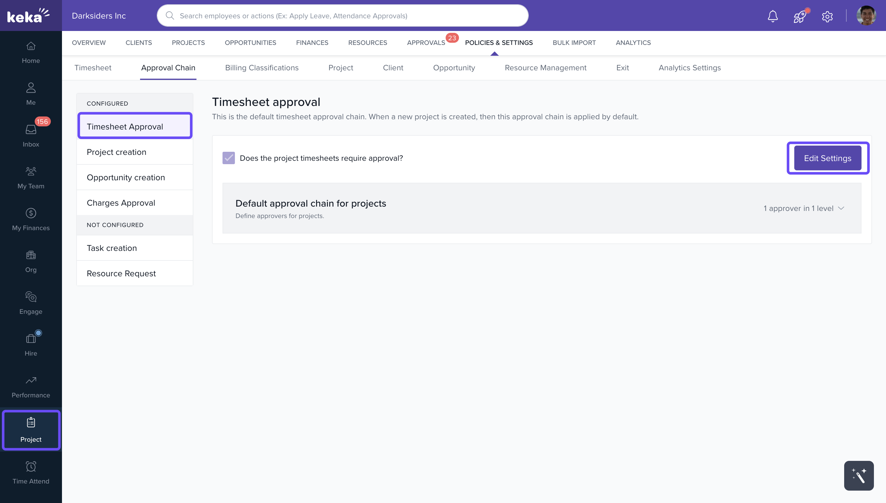 To maintain billing accuracy and prevent invoicing issues, project timesheets often need approval from project leads before they’re finalized. You can customize this process in Keka PSA by enabling or disabling timesheet approvals and defining multi-level approval chains tailored to your project needs.
