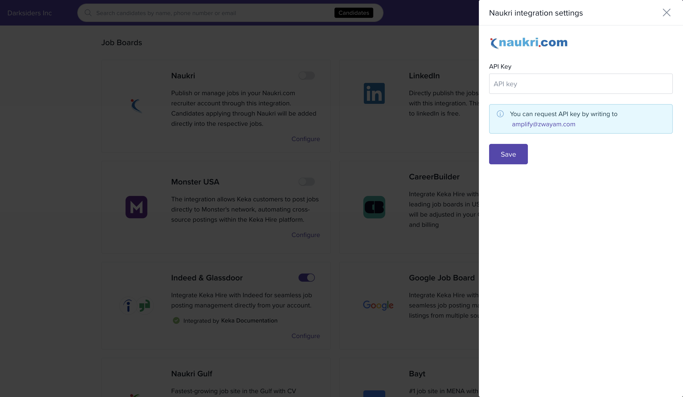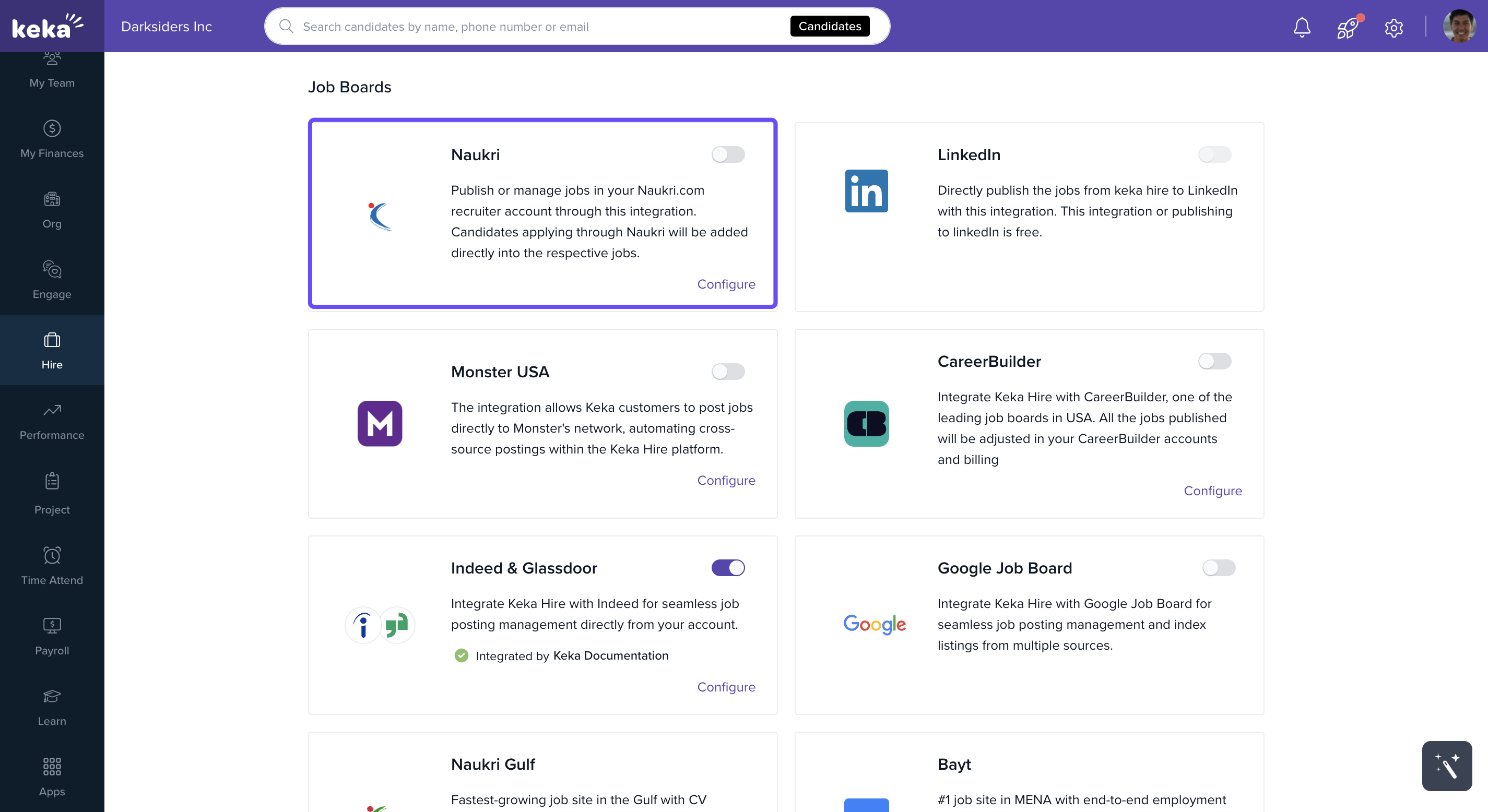 Once integrated, you can publish jobs directly from Keka Hire to Naukri, and applications submitted through Naukri will automatically sync with your respective jobs in Keka Hire.