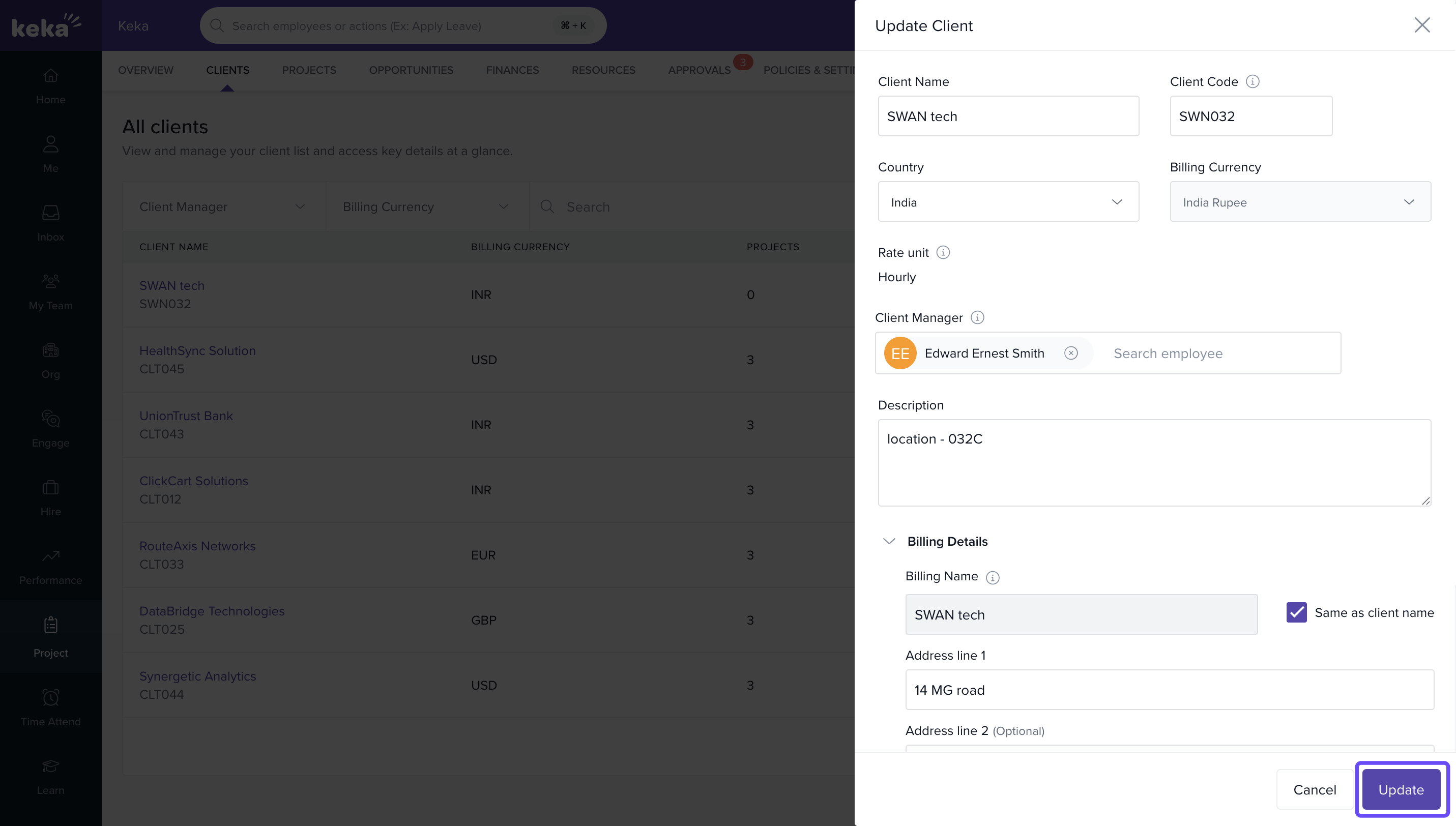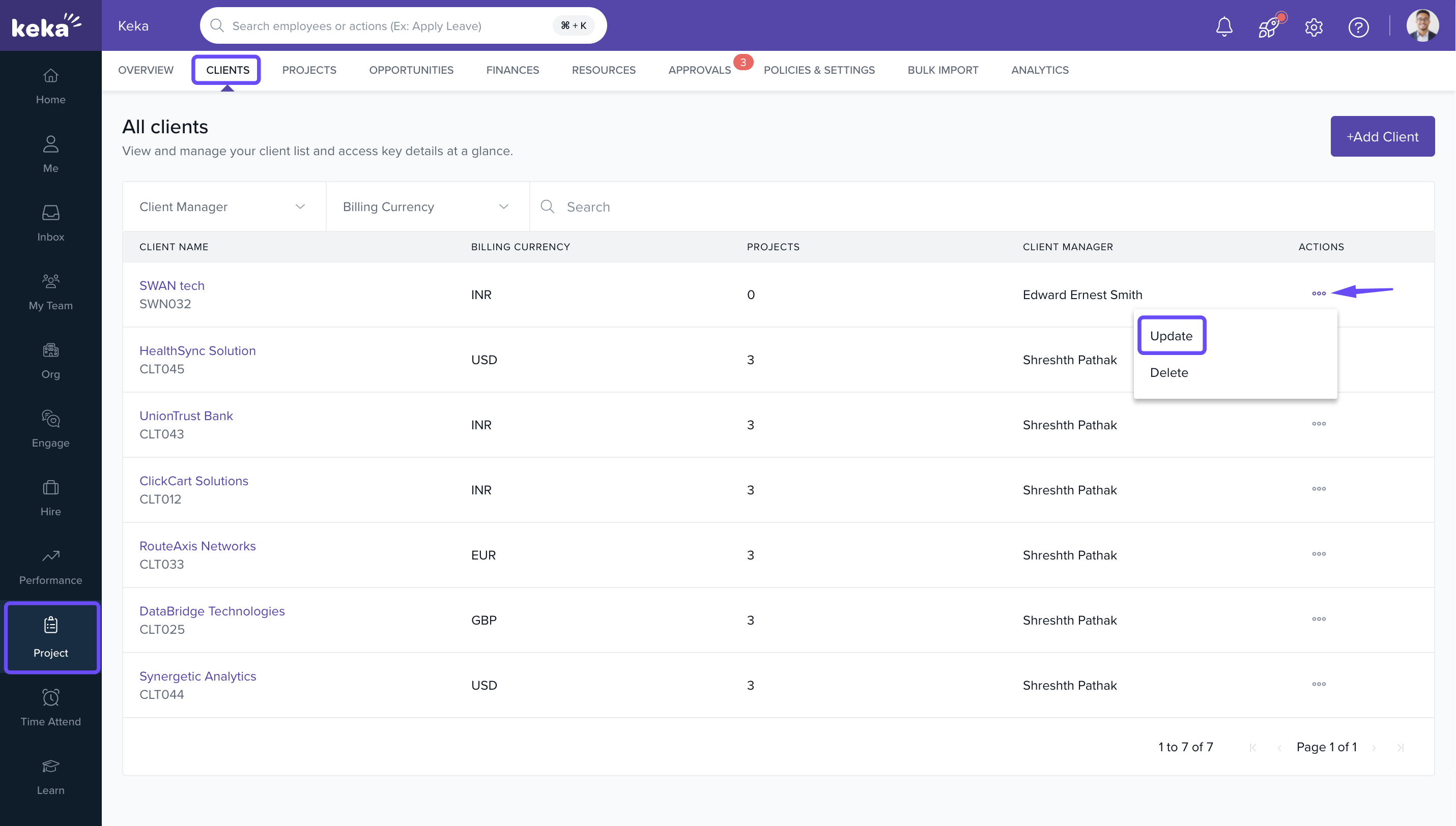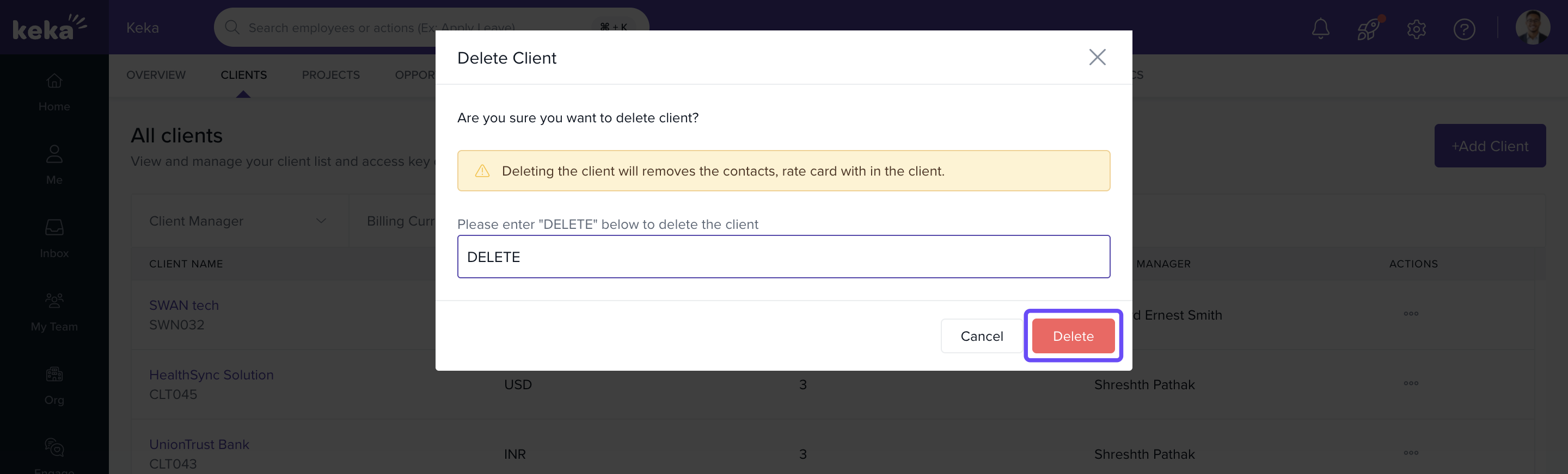Managing client records in Keka PSA is essential for keeping your project and billing data organized. This article explains how administrators can edit or delete client information. Editing allows updates to client details, while deletion removes inactive or incorrect entries, provided there are no active dependencies such as ongoing projects.