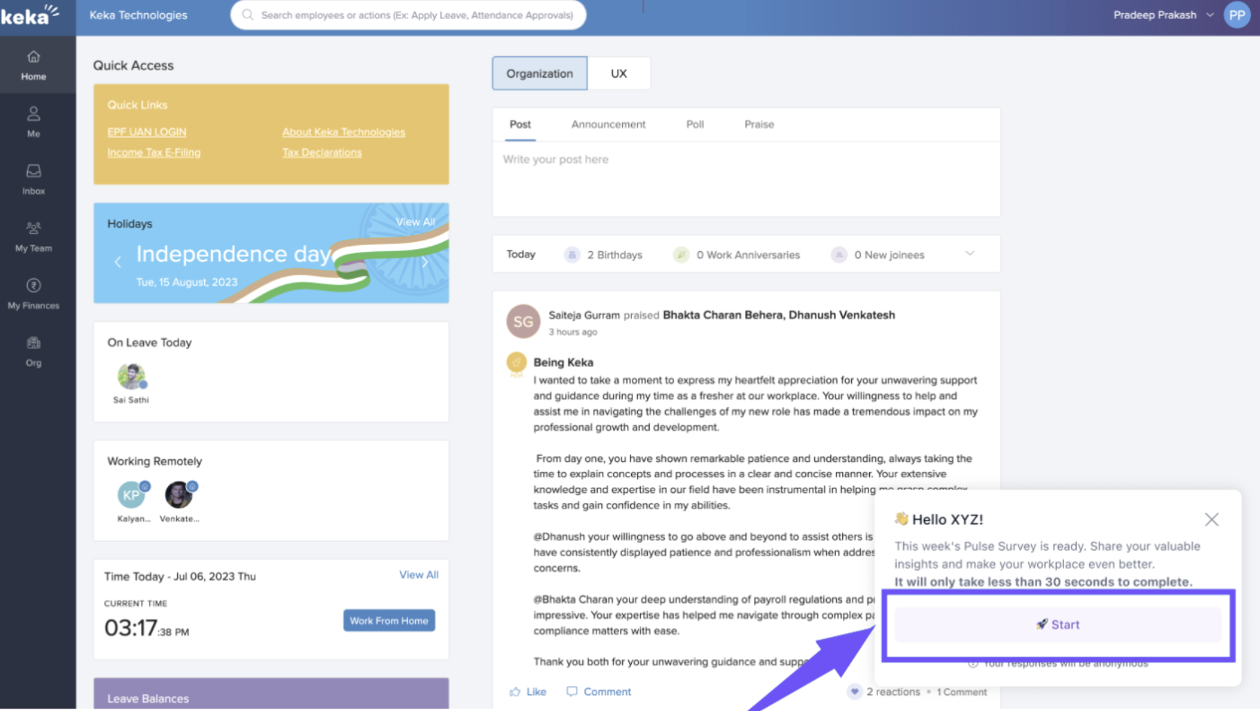 Every week, when employees log in to their Keka portal, they'll see a prompt on their dashboard with a short set of five questions.