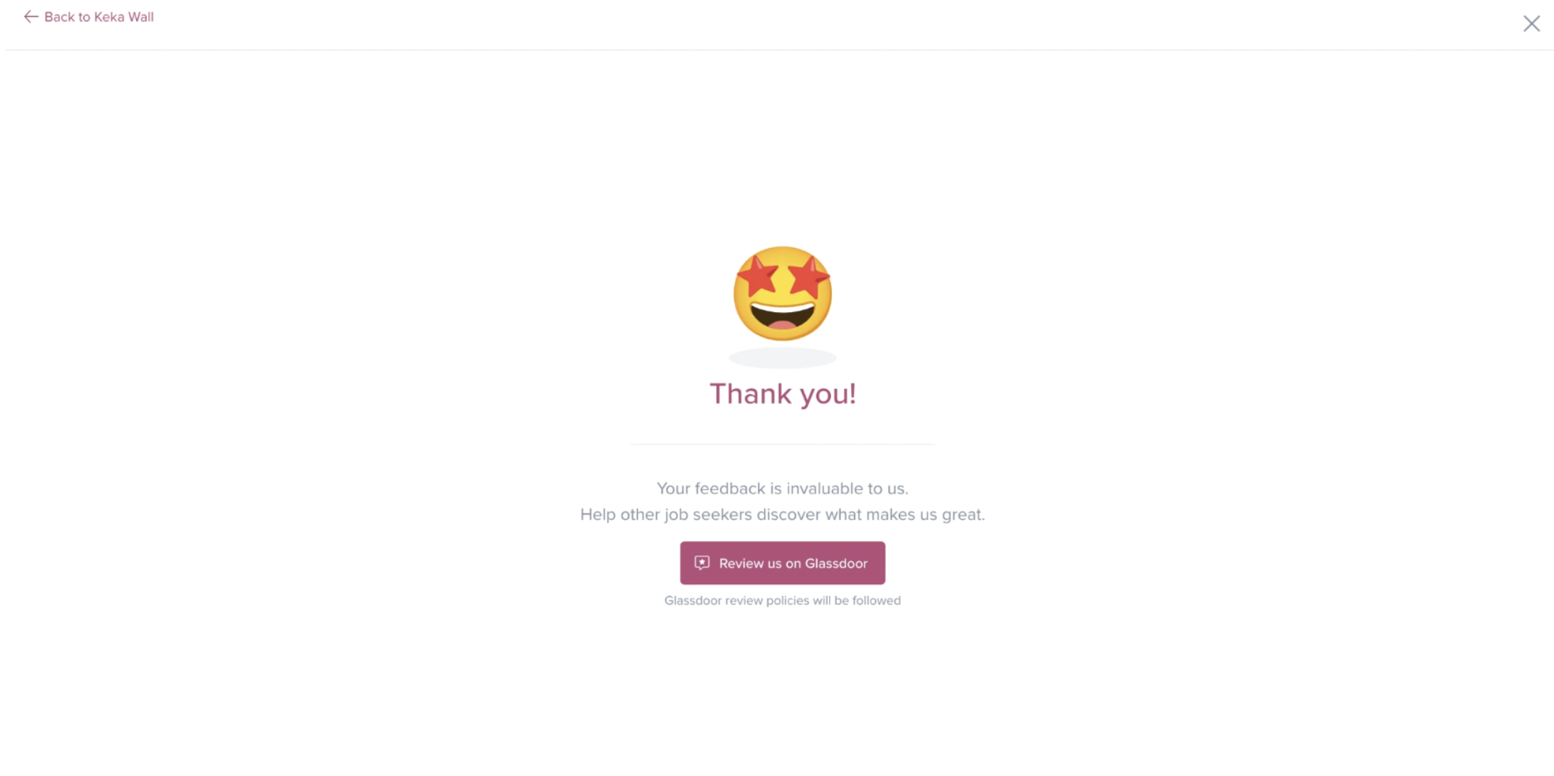 After you’ve completed submitting your Pulse responses, you may also see an option to “Review us on Glassdoor.” This prompt appears only when your overall feedback is positive—typically above an 80% satisfaction level.
