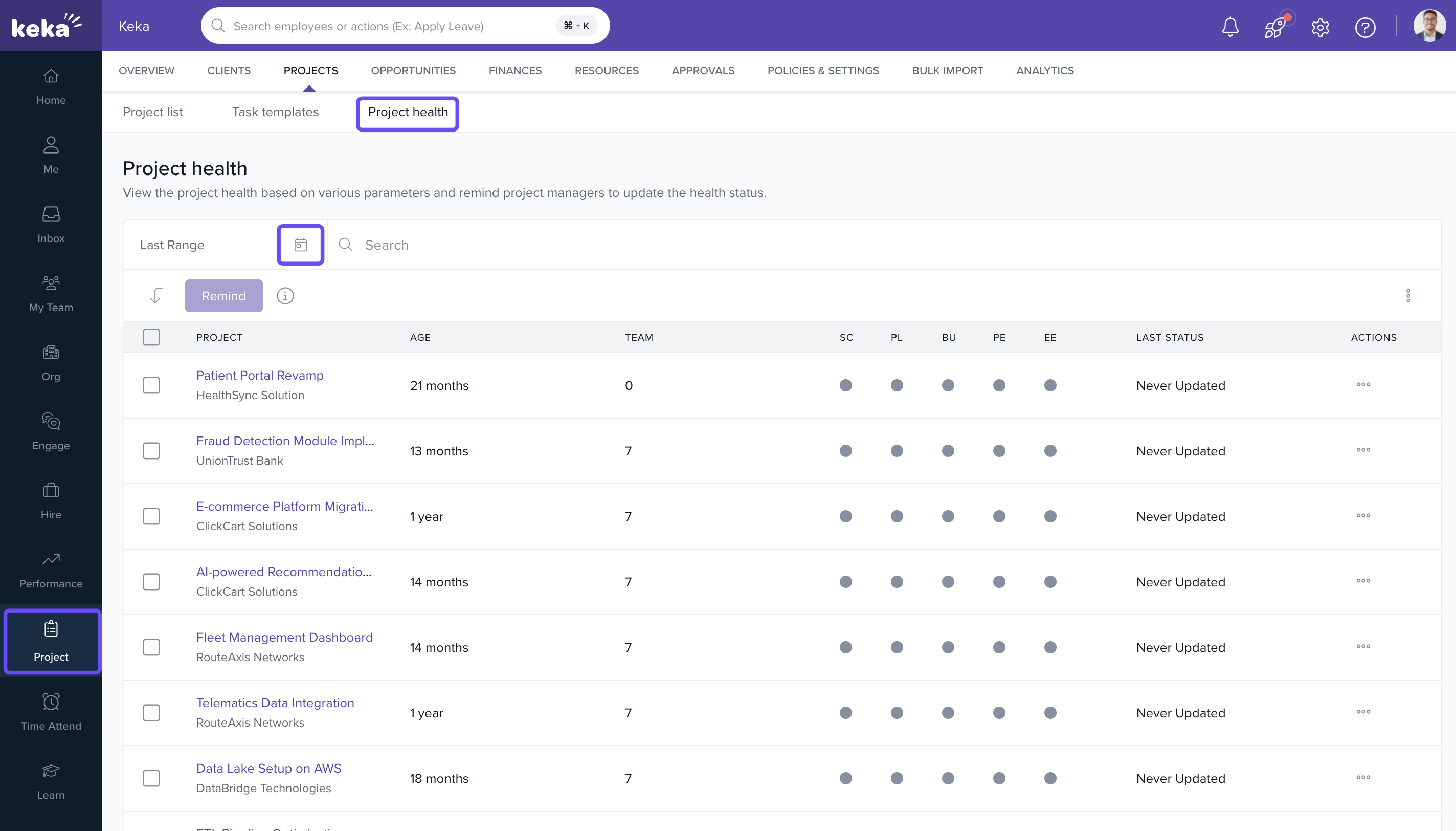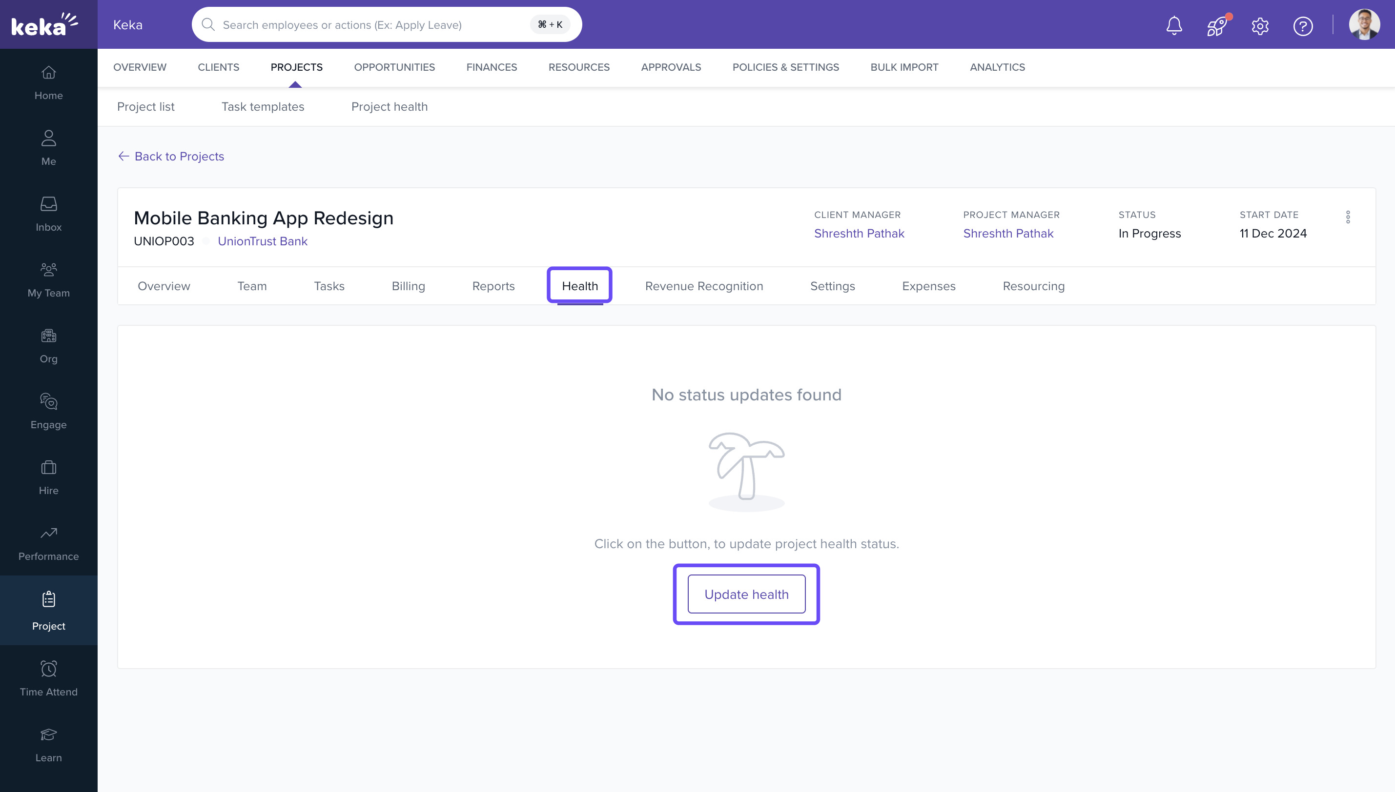Efficient tracking of project health is key to proactive project management. In Keka PSA, you can update the health status of projects. This ensures real-time visibility into project progress and helps teams take timely corrective actions. Additionally, reminders can be sent to project managers to prompt updates, supporting transparency and accountability.