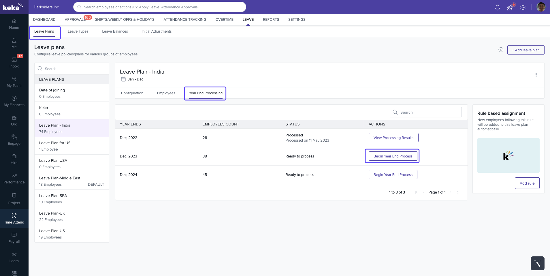 Year-end is a critical time to reconcile leave balances before the new year begins. With Keka’s Year-End Processing (YEP), you can manage carry-forwards, encashments, and adjustments in one place—reducing manual effort and giving employees clear leave entitlements.