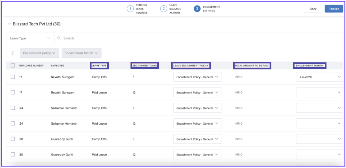 Keka auto-calculates the encashment amounts based on policy formulas, but you can manually adjust them per employee if needed.