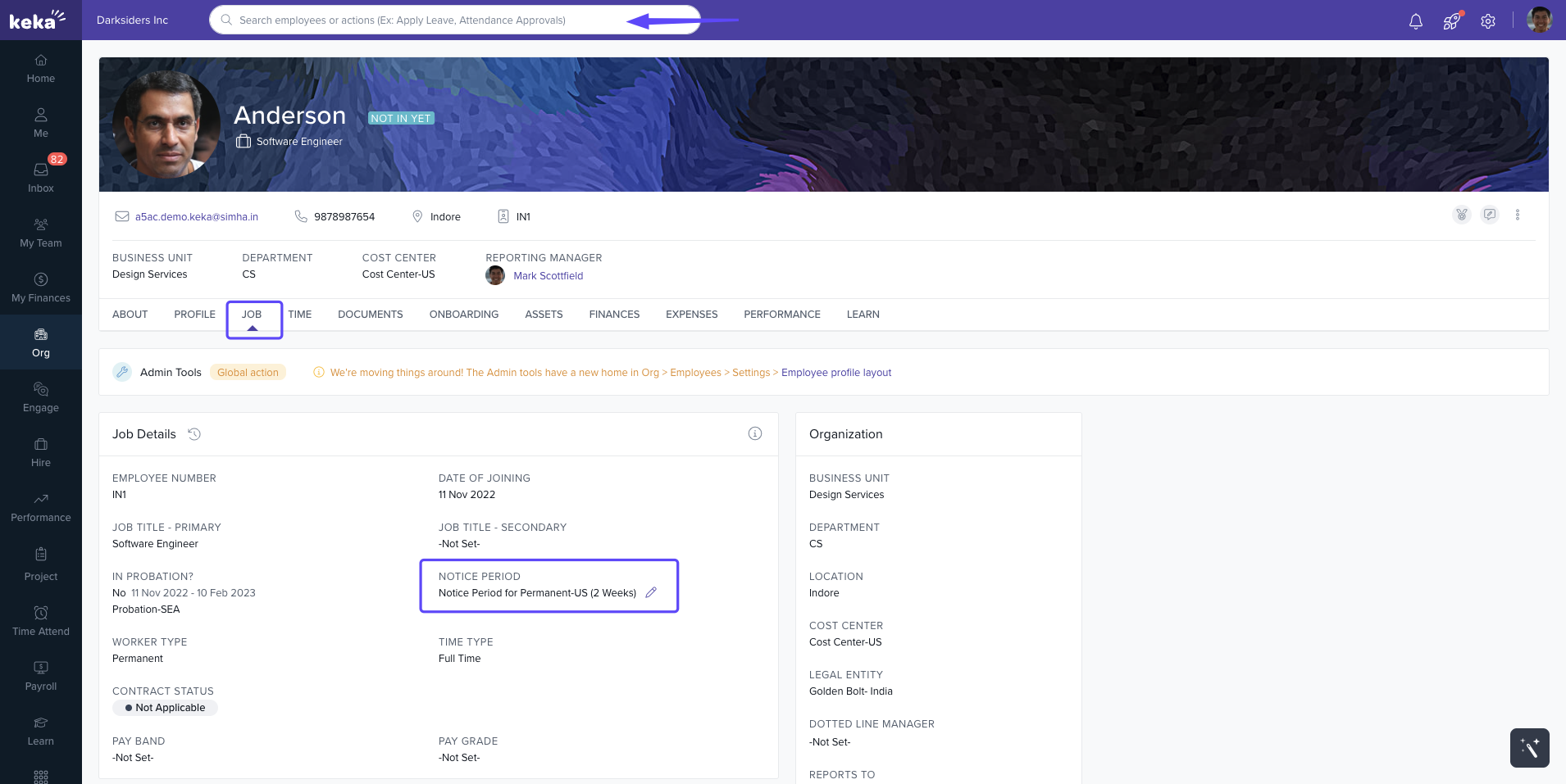 Use the Global Search Bar to search for the employee you want to assign a notice period to.