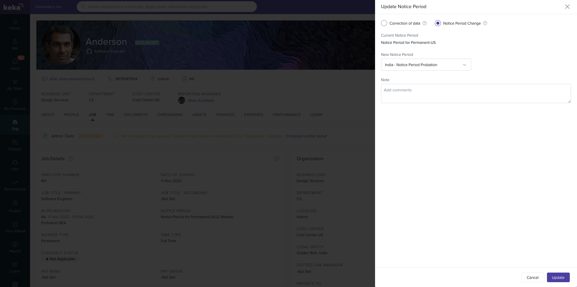 Choose the relevant notice period policy for the employee and click Update to save the changes.