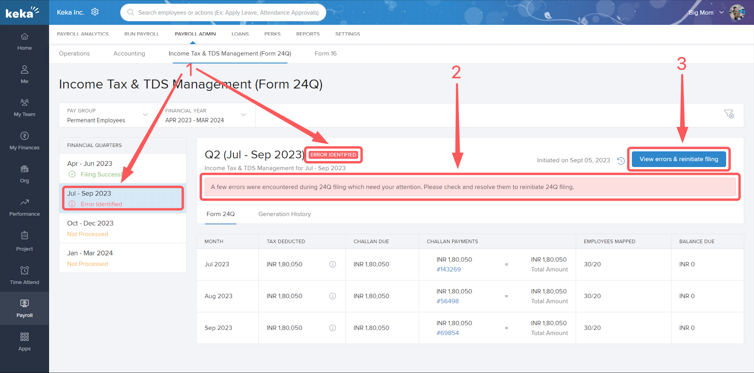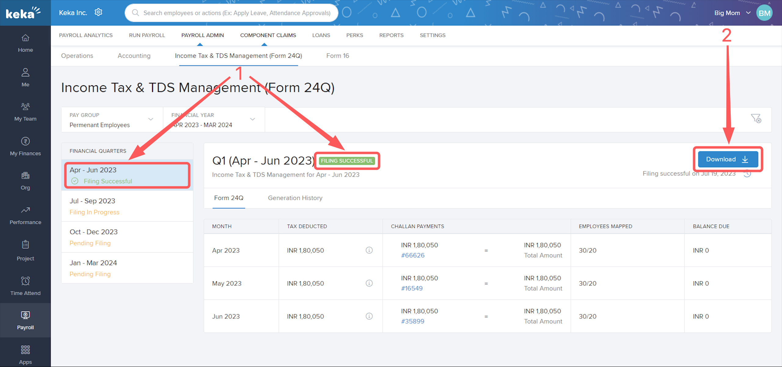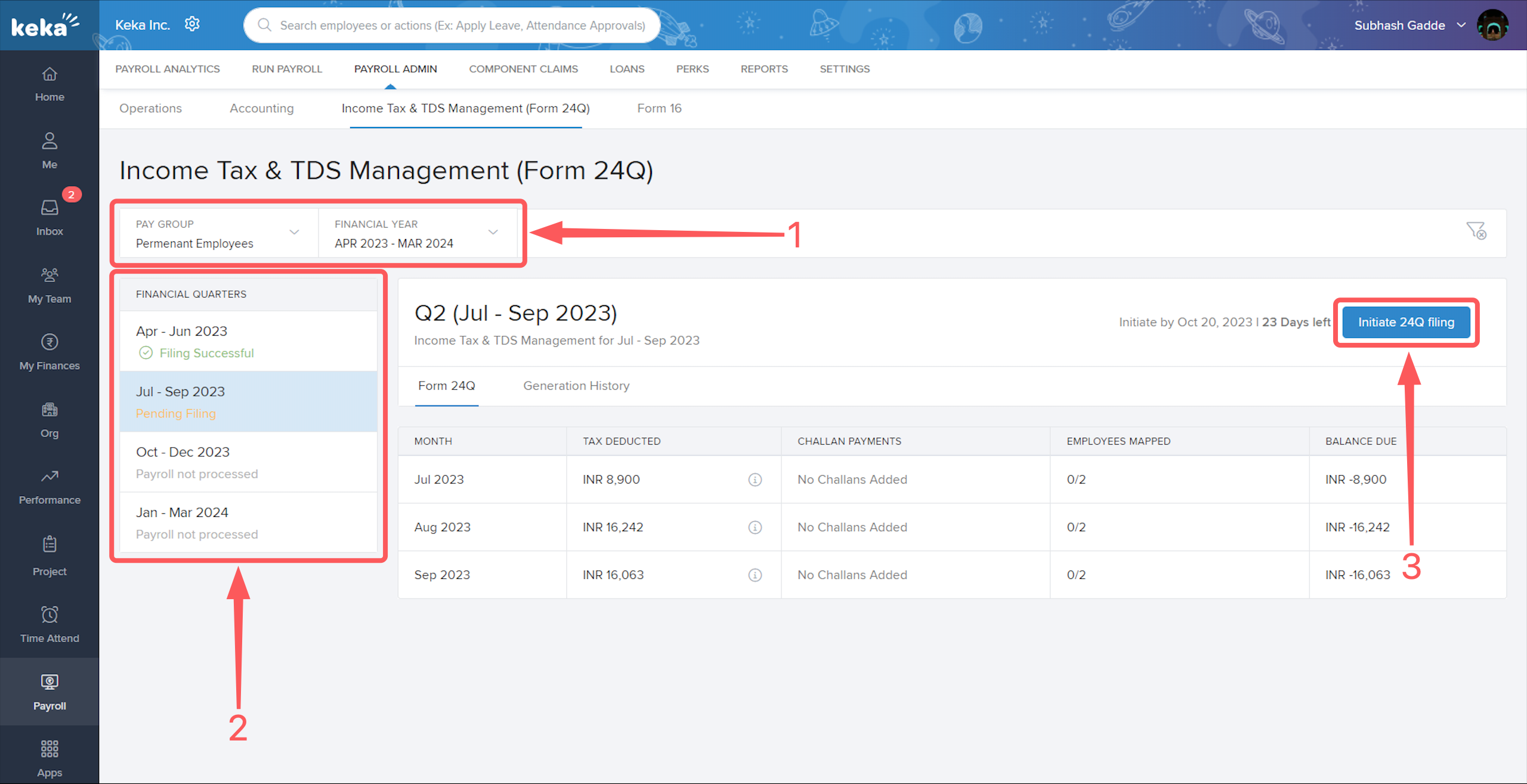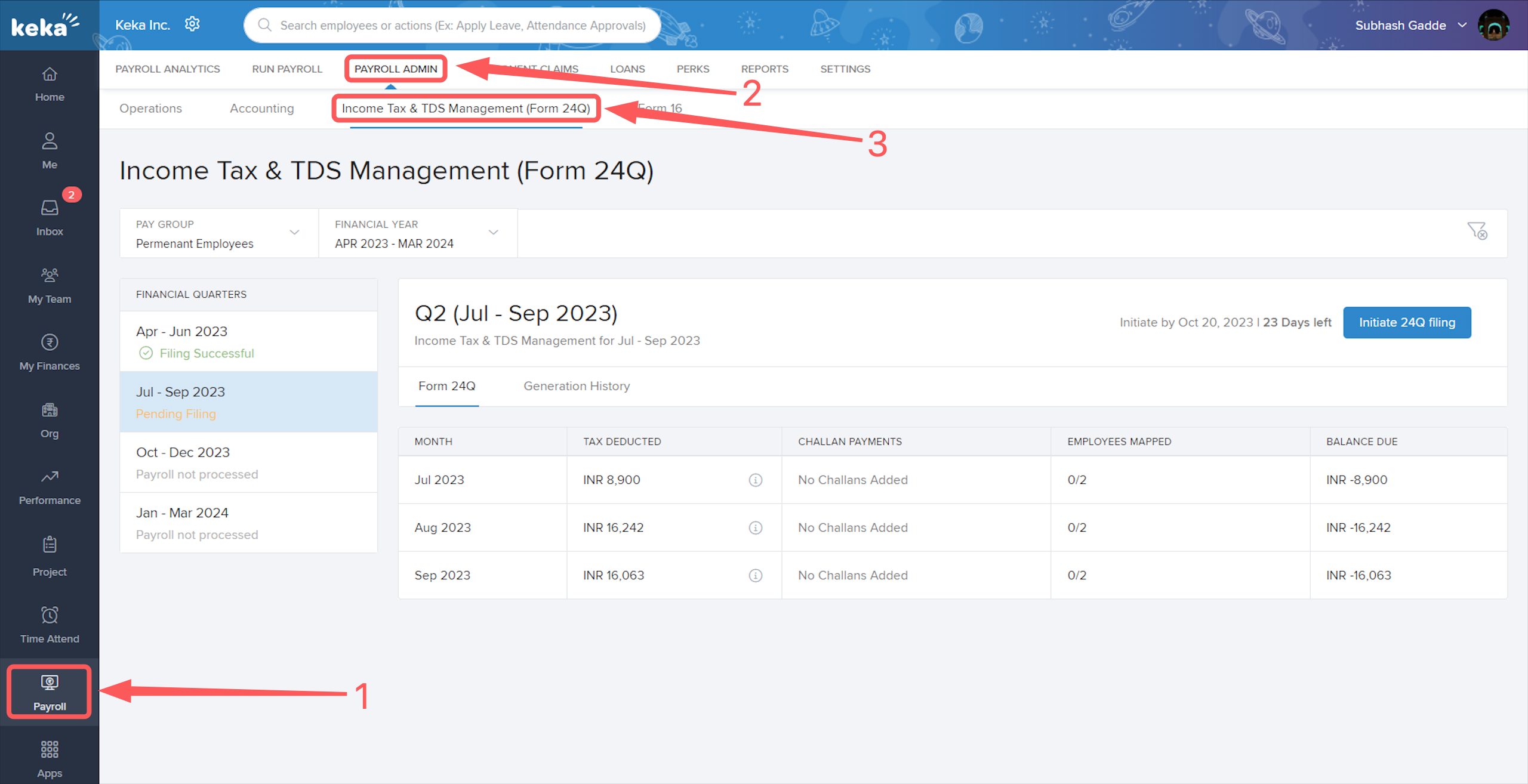 Go to the Payroll (1) section, click on Payroll Admin (2), then select Income Tax & TDS Management (Form 24Q) (3).