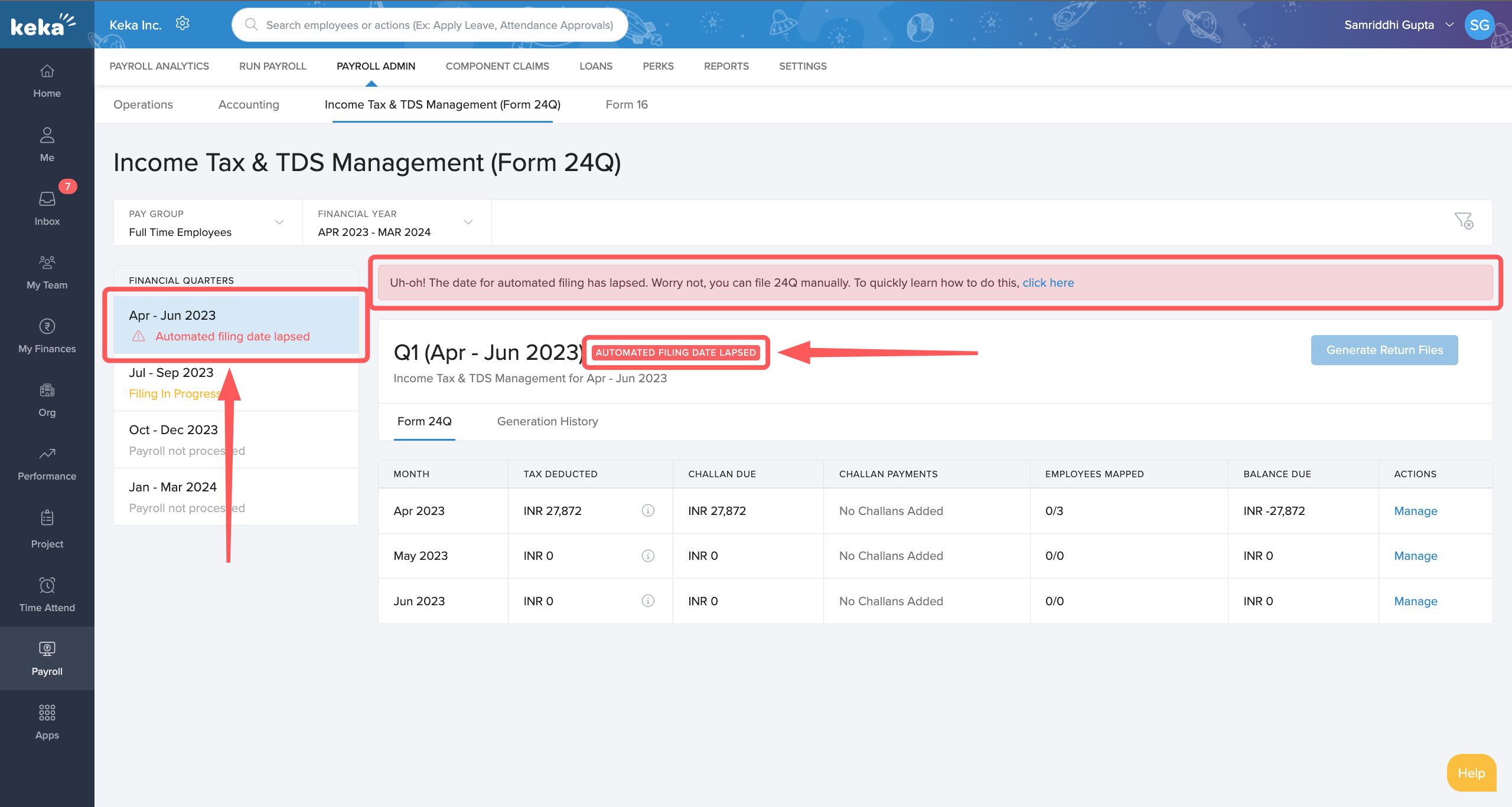 There might be scenarios where the due date for initiating 24Q filing lapses, in such cases, you will see a notification for that particular financial quarter stating Automated Filing Date Lapsed along with a notice asking you to manually file your 24Q for that respective quarter.