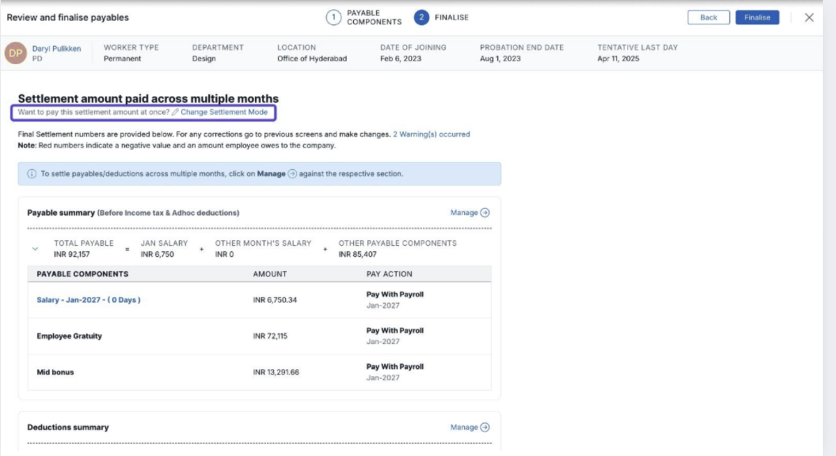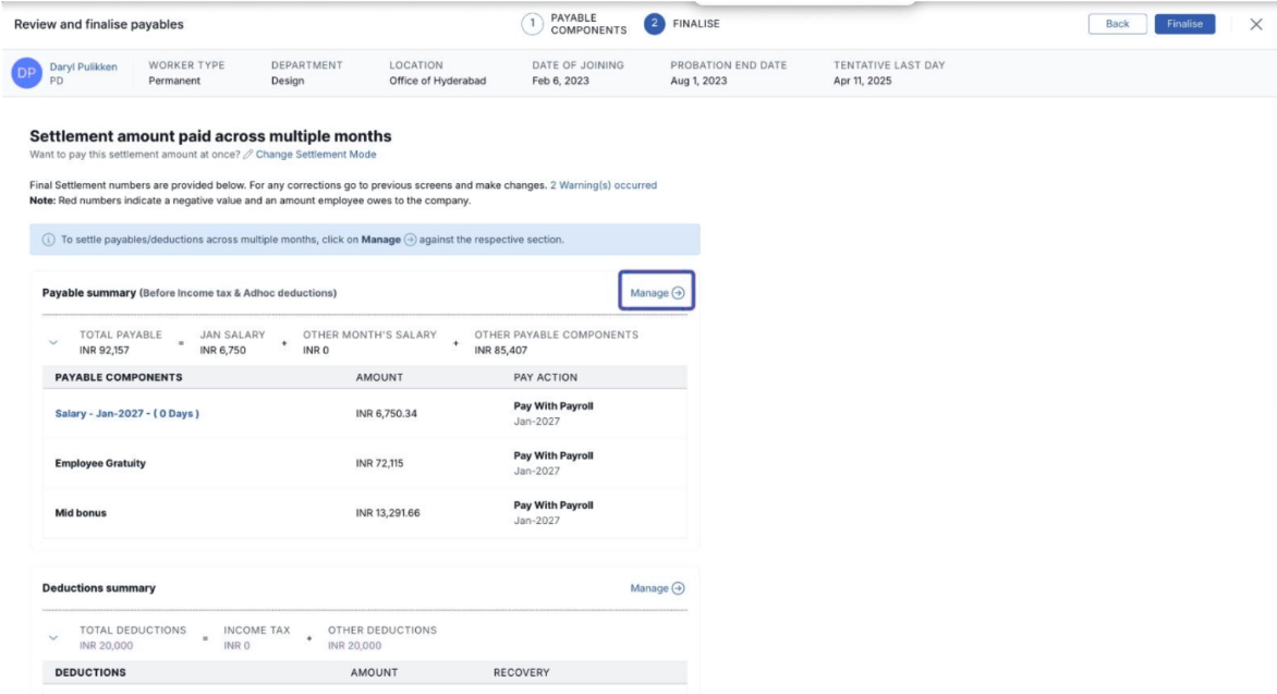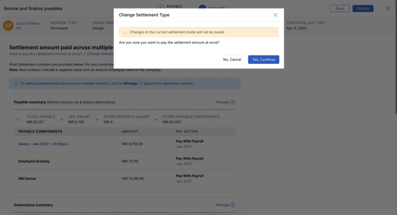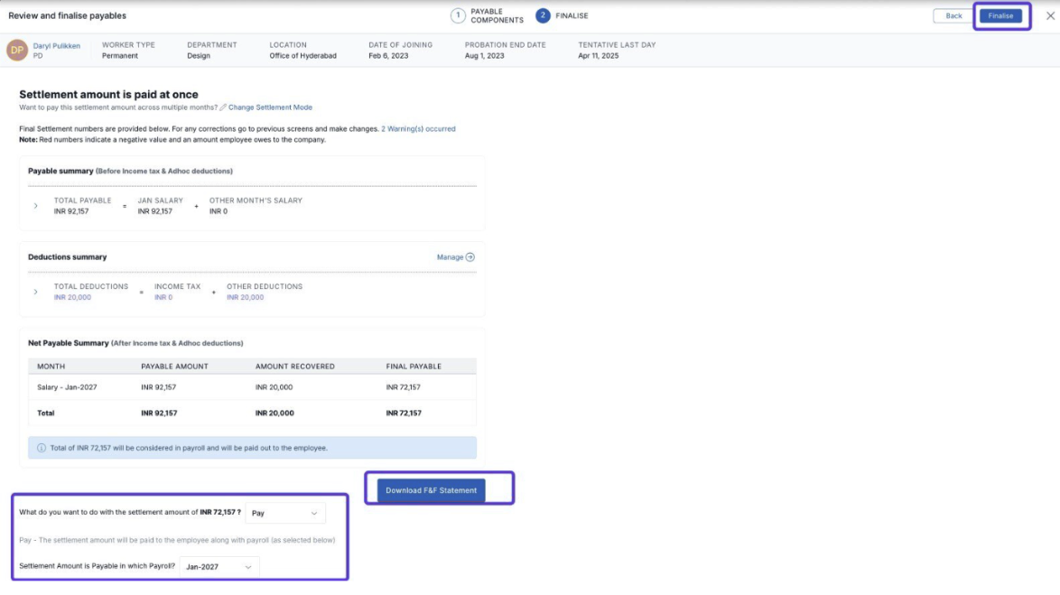 - For a detailed understanding of the Full and Final Settlement (F&F) process, please follow this guide before proceeding with the settlement.