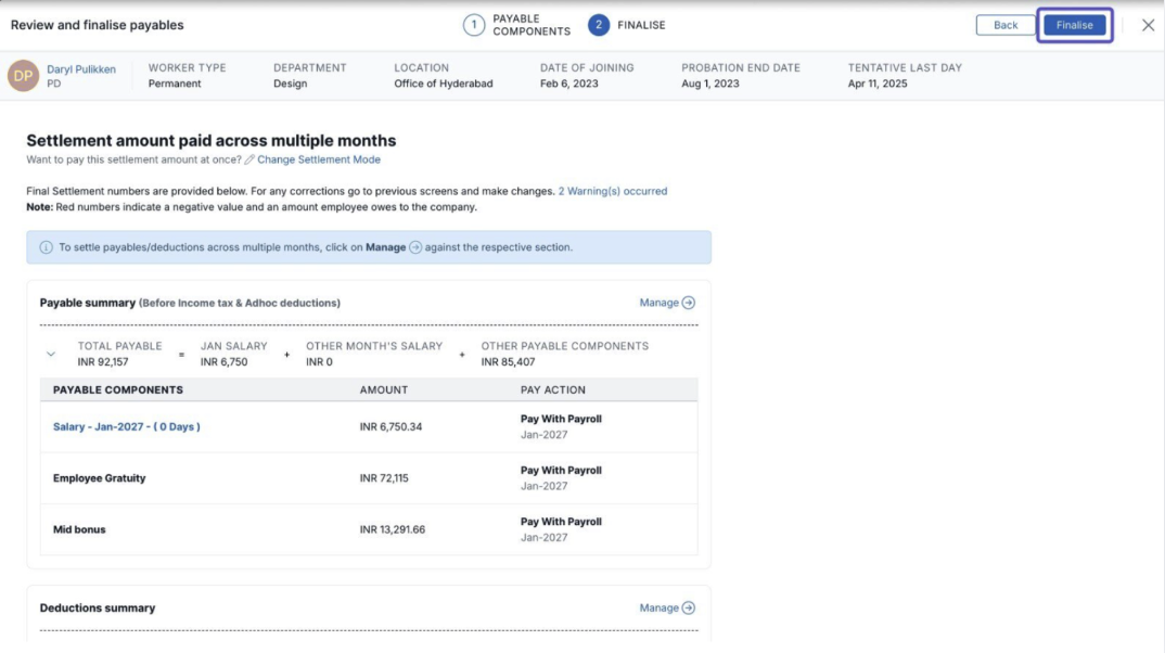 Tip: You can return to the F&F section later to modify any details or change the settlement month after finalisation.