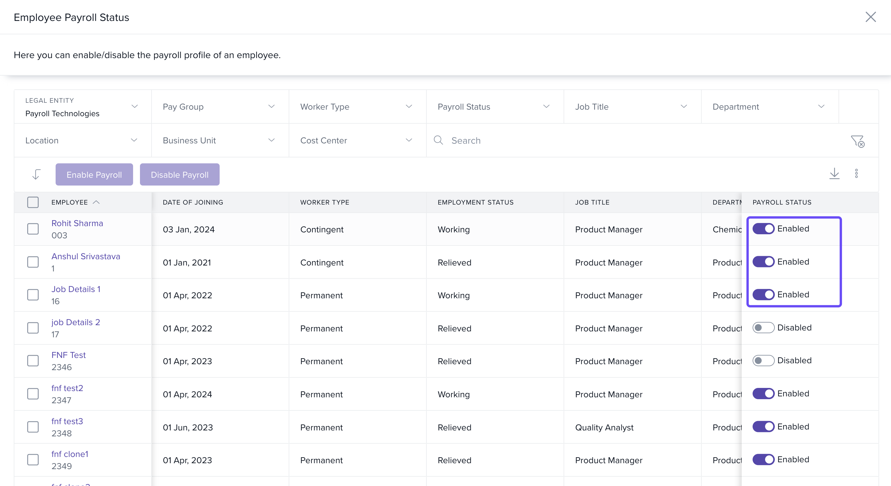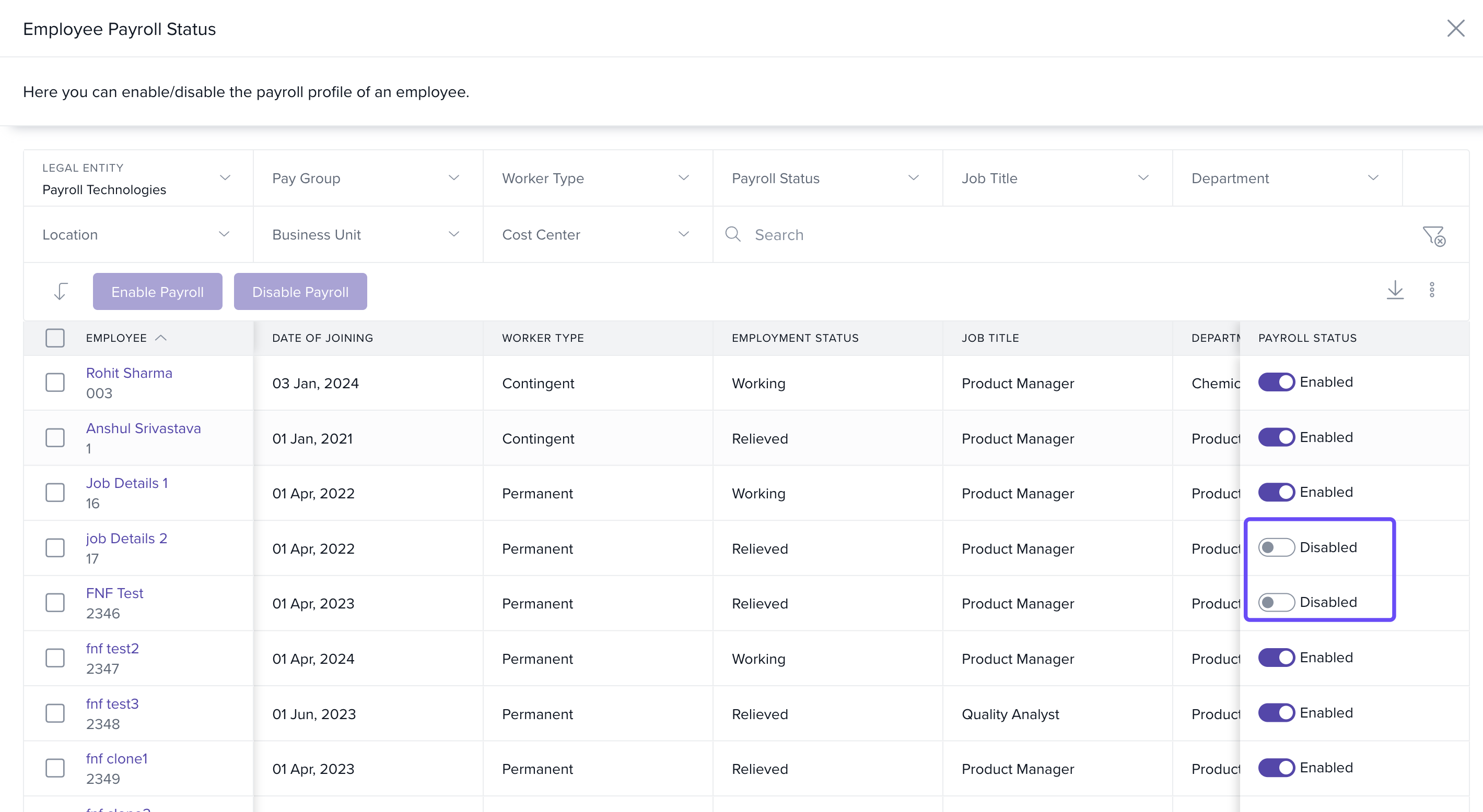 Find the employee and toggle Payroll Status from Enabled → Disabled.