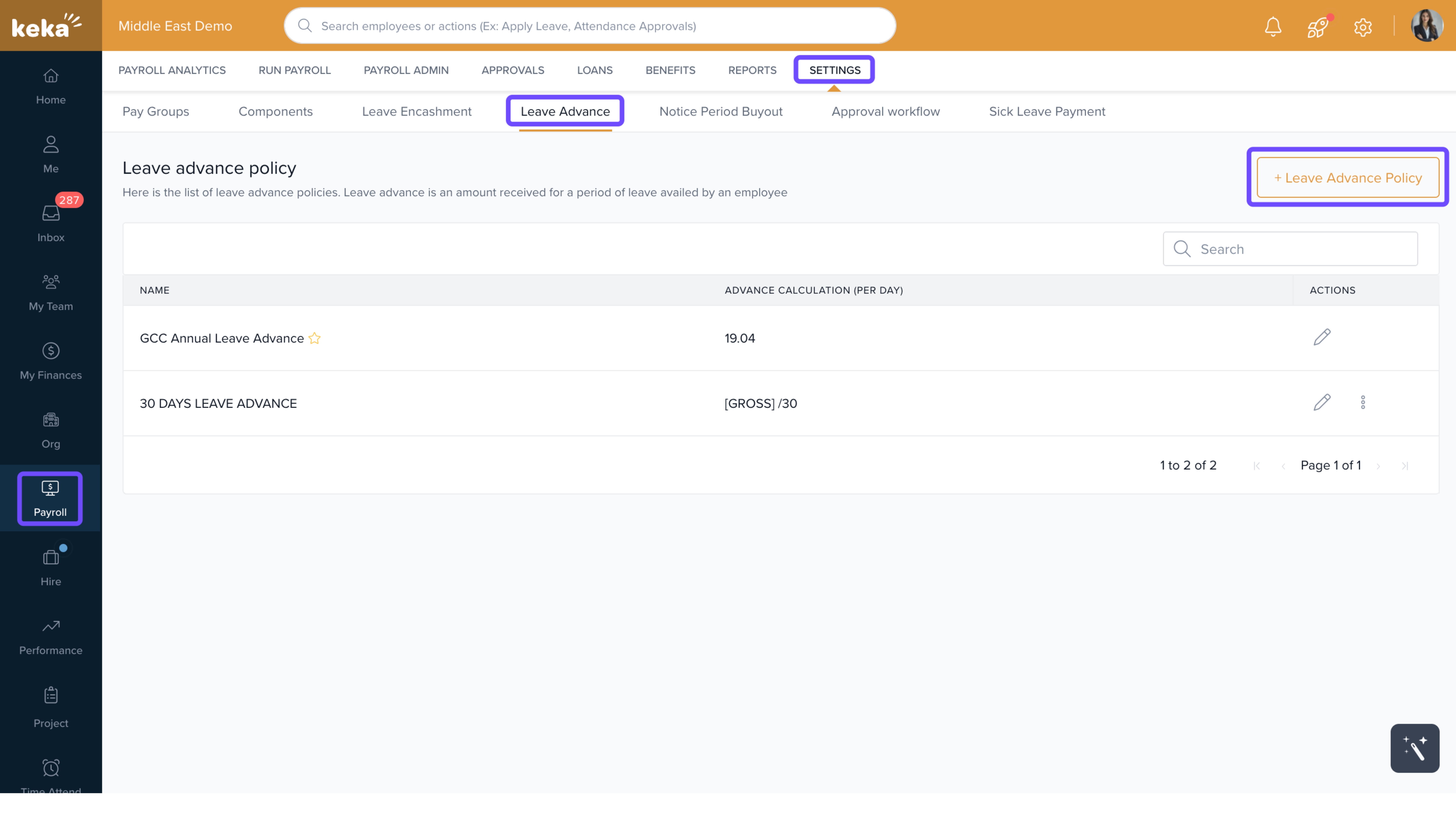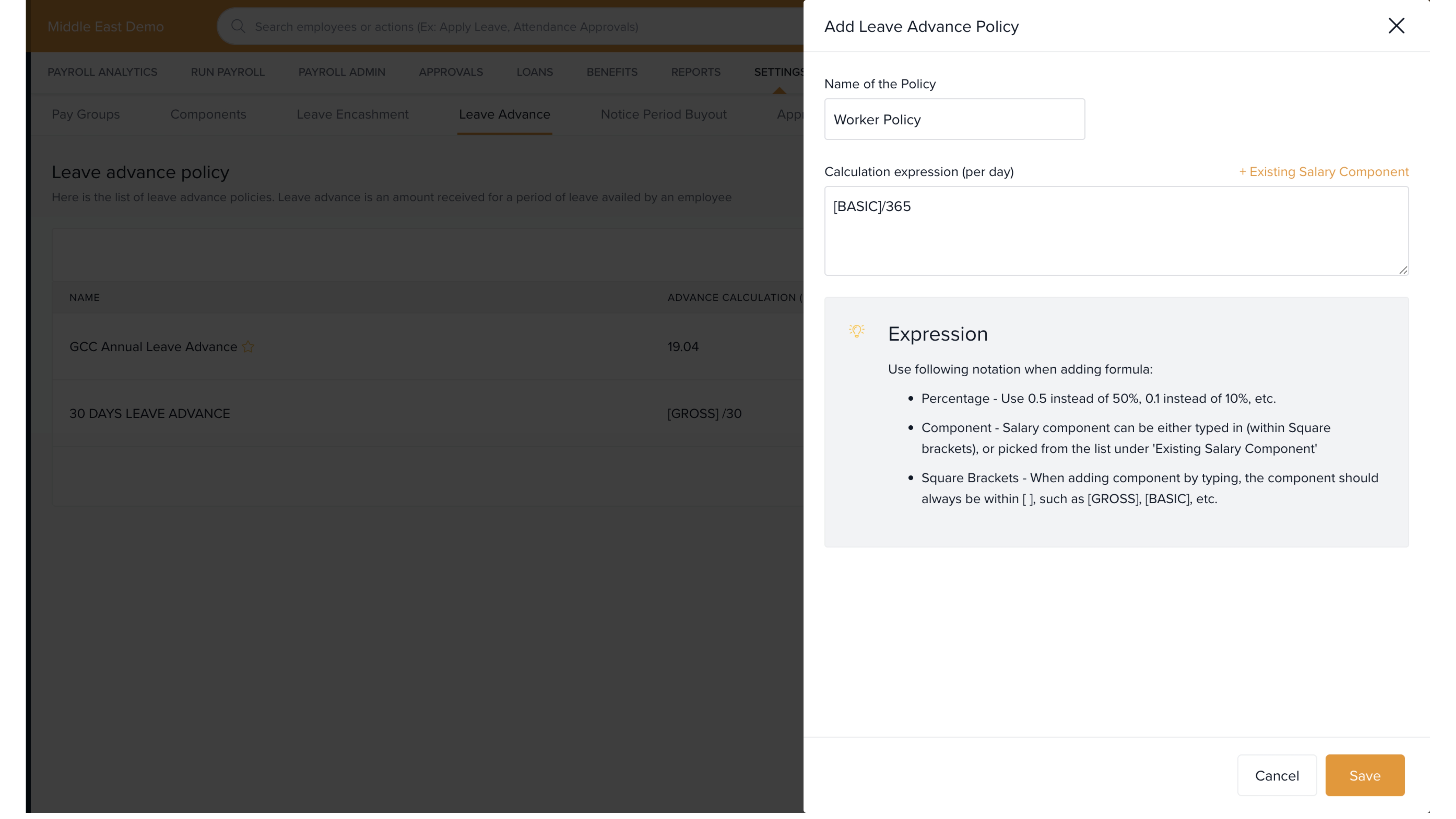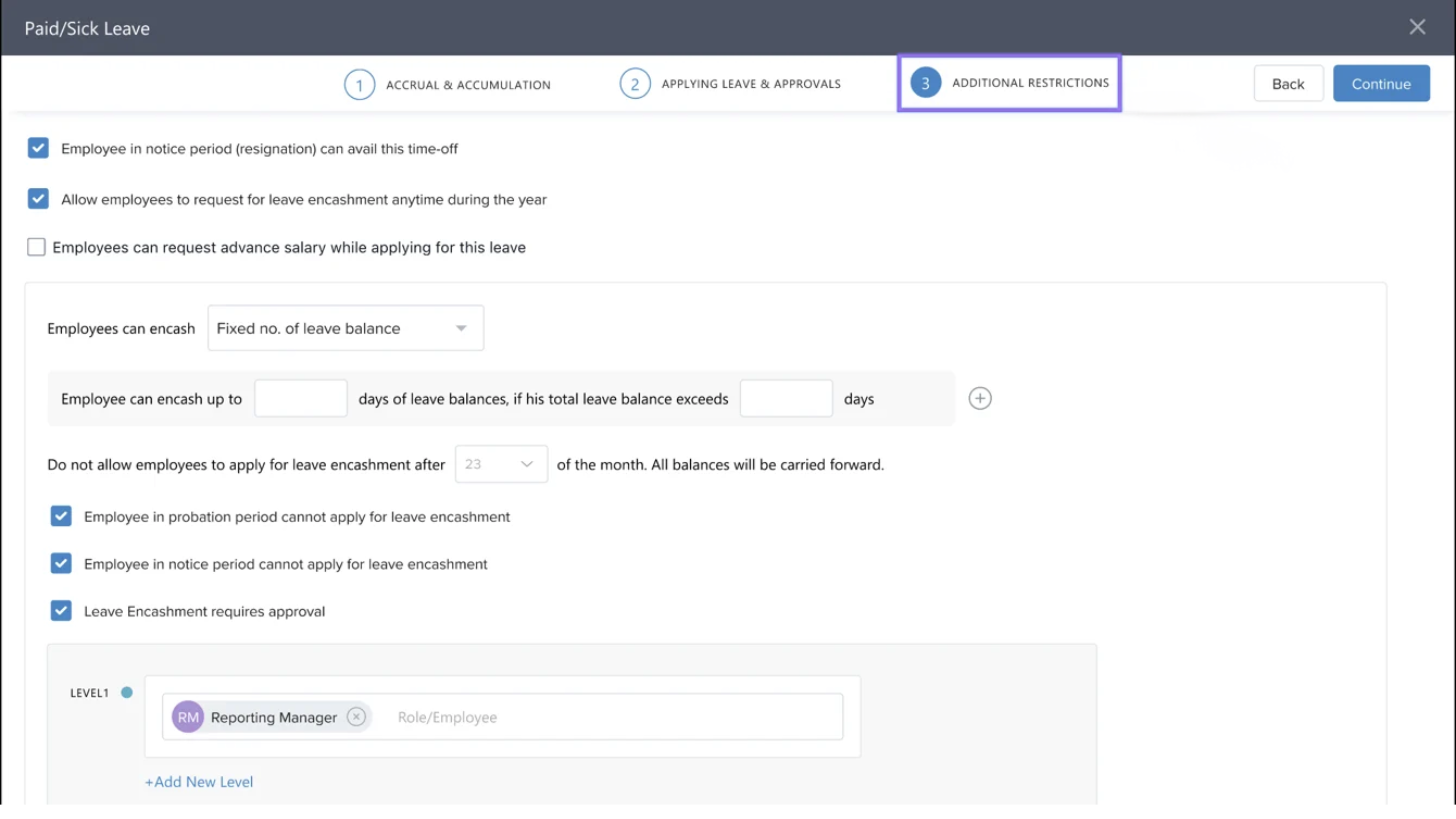 Once eligible leave types are set, create a policy that defines how the leave advance is calculated.