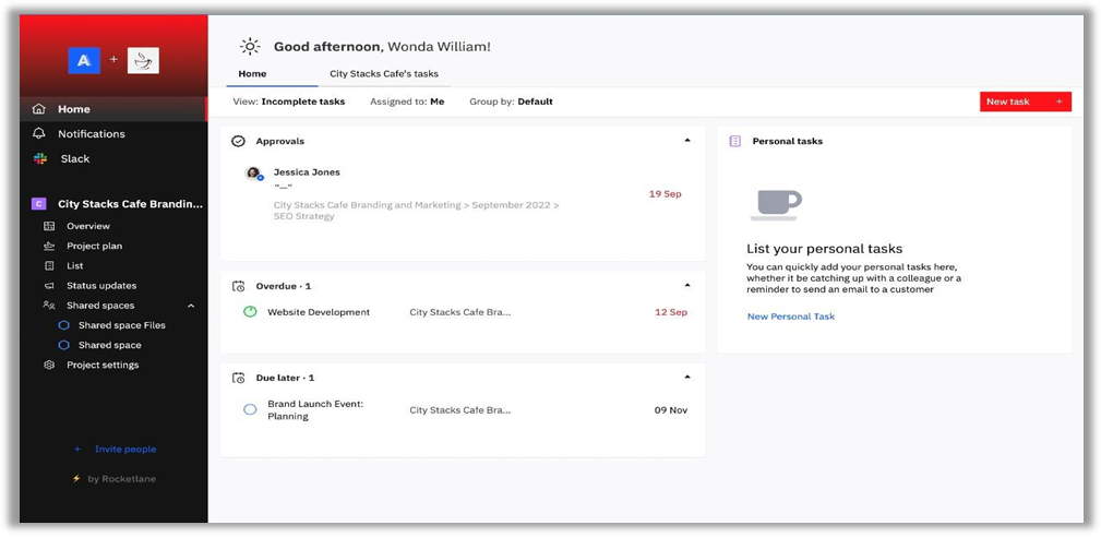 The Home page provides an overview of the tasks and approvals for the project that you have been invited to.