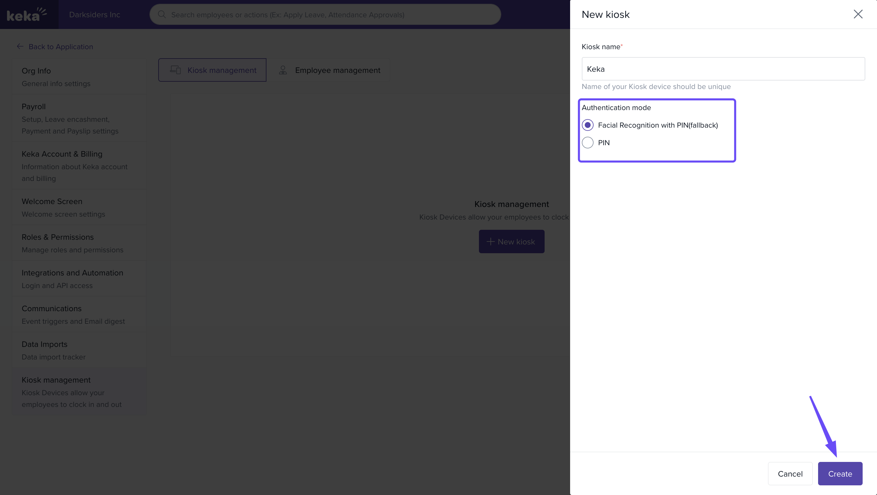 Keka allows you to set up Kiosks for tracking employee attendance using Facial Recognition or PIN-based authentication.