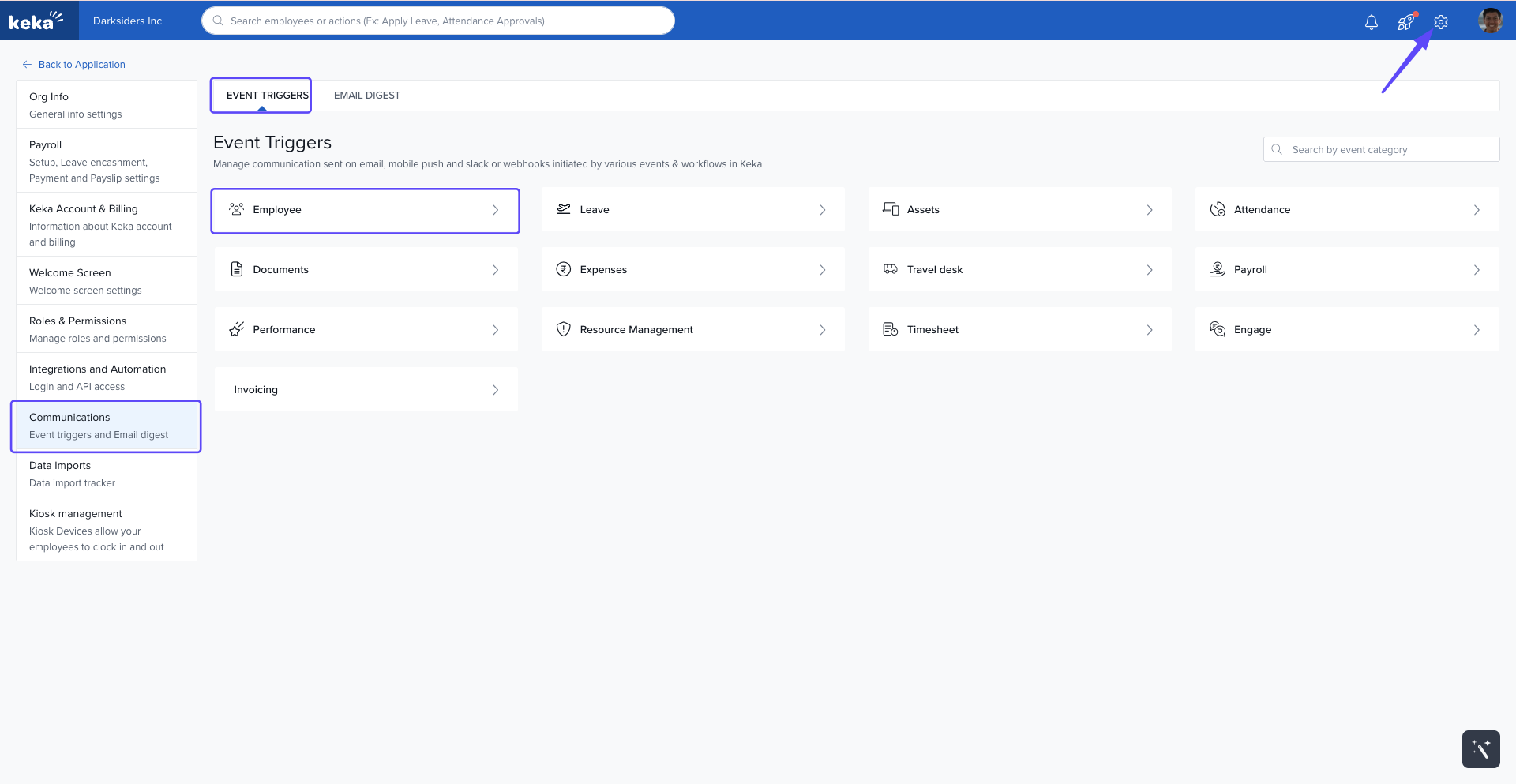 Look for the Event Triggers option and click on the Employee Tab to access the trigger settings.