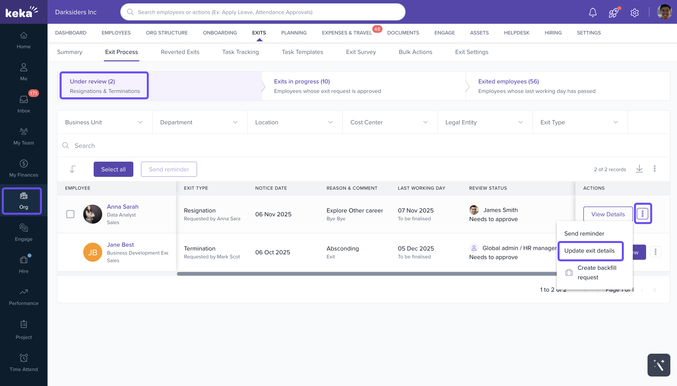 - Go to either the Under Review or Exits in Progress section based on the employee’s resignation status.