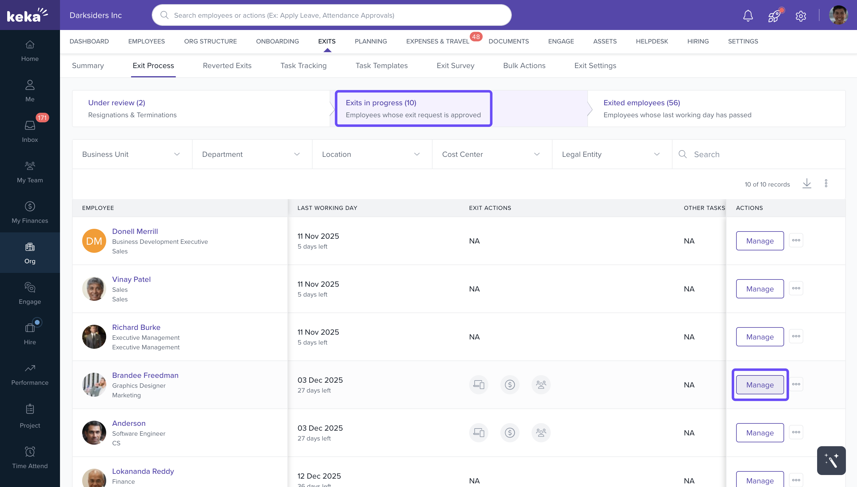 - In the Exits in Progress section, click on the Manage button for the respective employee.