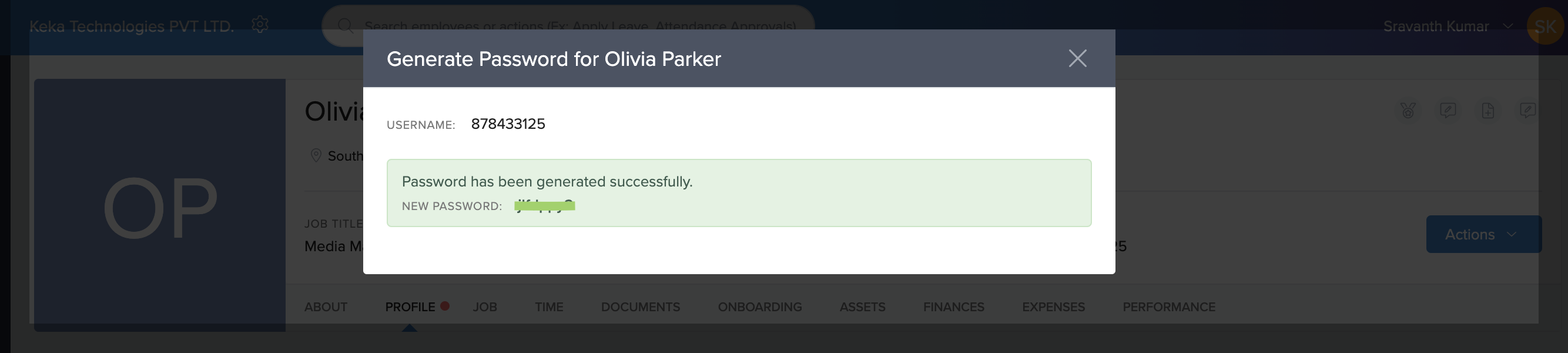 The username and password will be displayed, and the admin can share this with the employee for login.