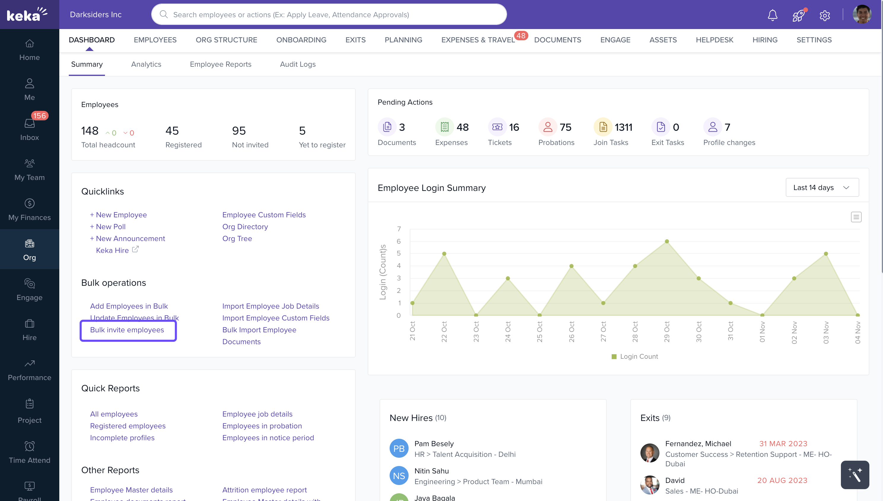 Navigate to Org → Dashboard → Summary → Quicklinks → Bulk Operations → Bulk Invite Employees.