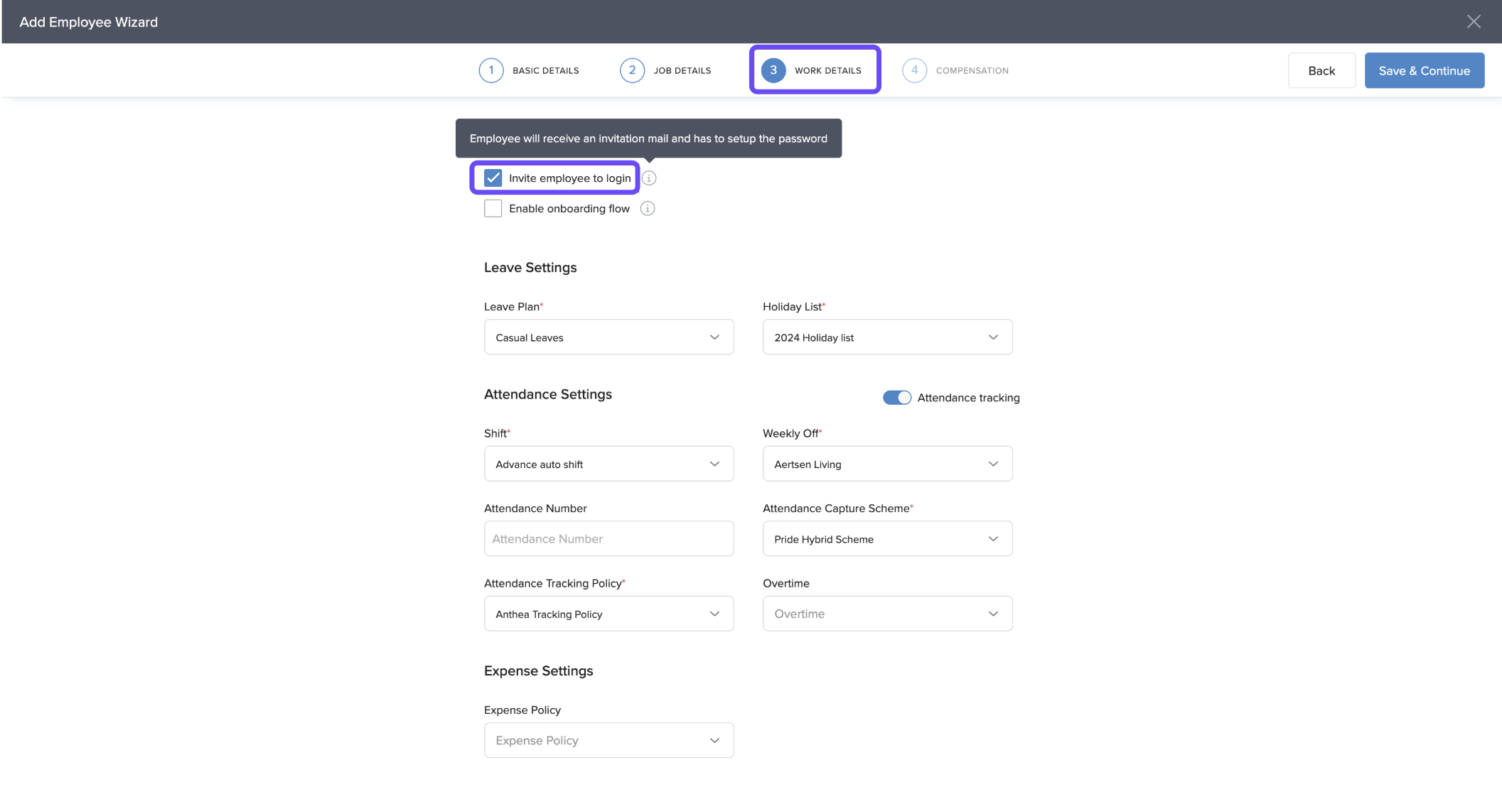 Check the option "Invite employee to login" to send an invitation email.