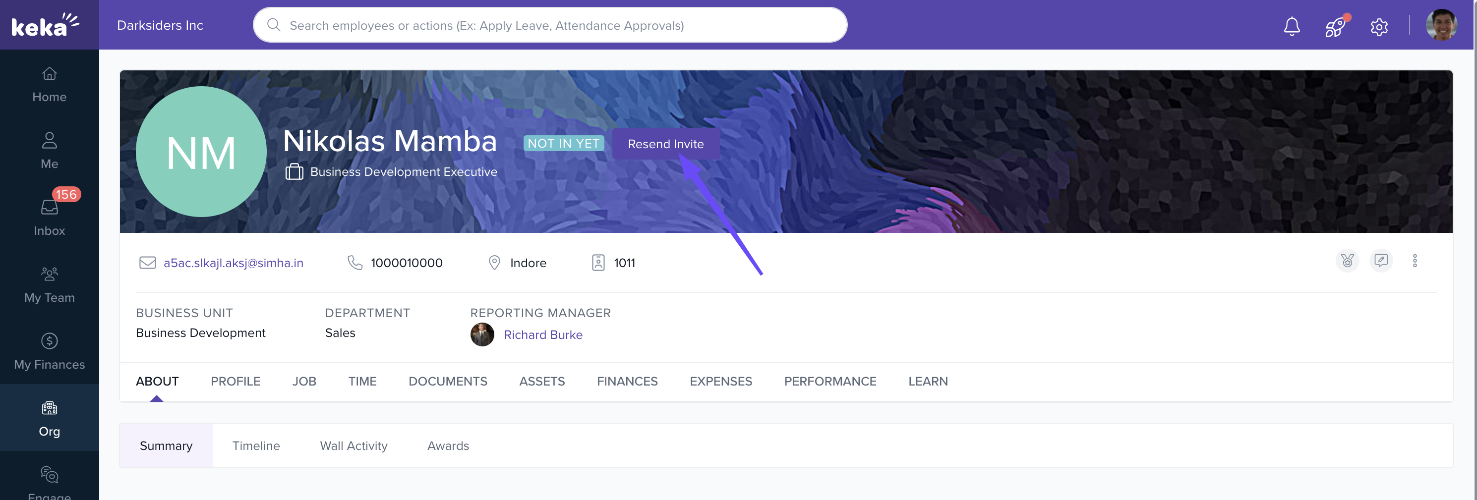 Note: The "Invite" option is only available if the work email is added in the Basic Details.