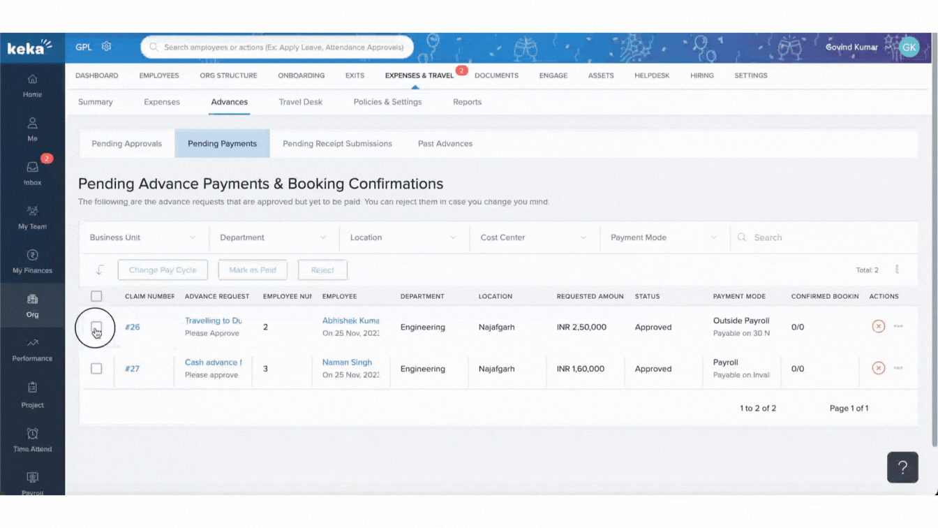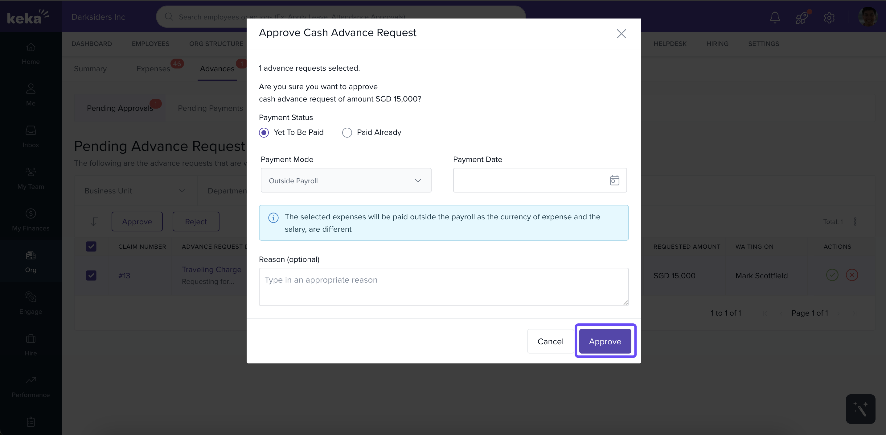 - Approving opens a pop-up to set payment status—Yet to be Paid or Paid Already—and select payment mode: Inside or Outside Keka Payroll. Inside payroll items will auto-integrate with payroll.