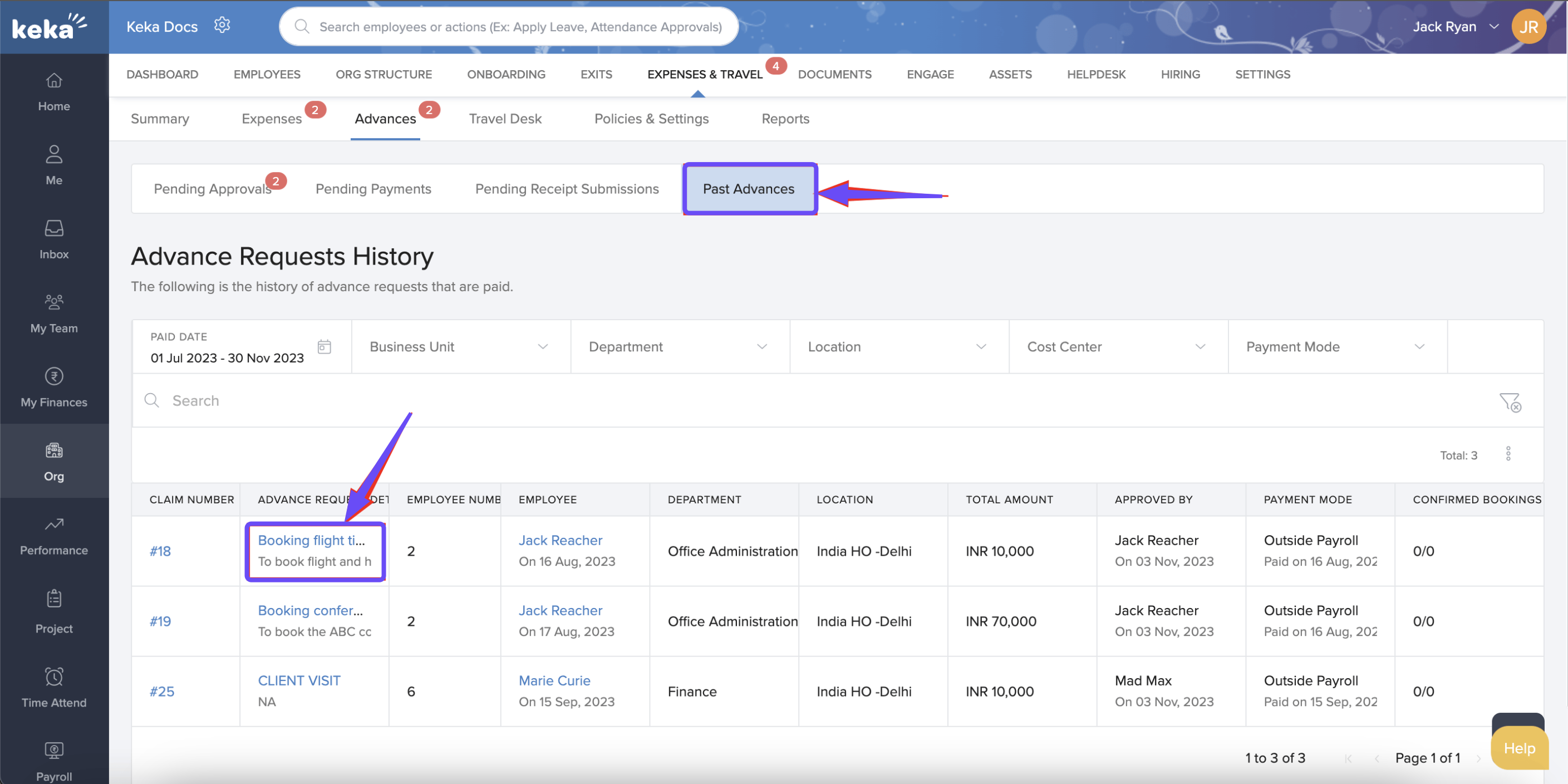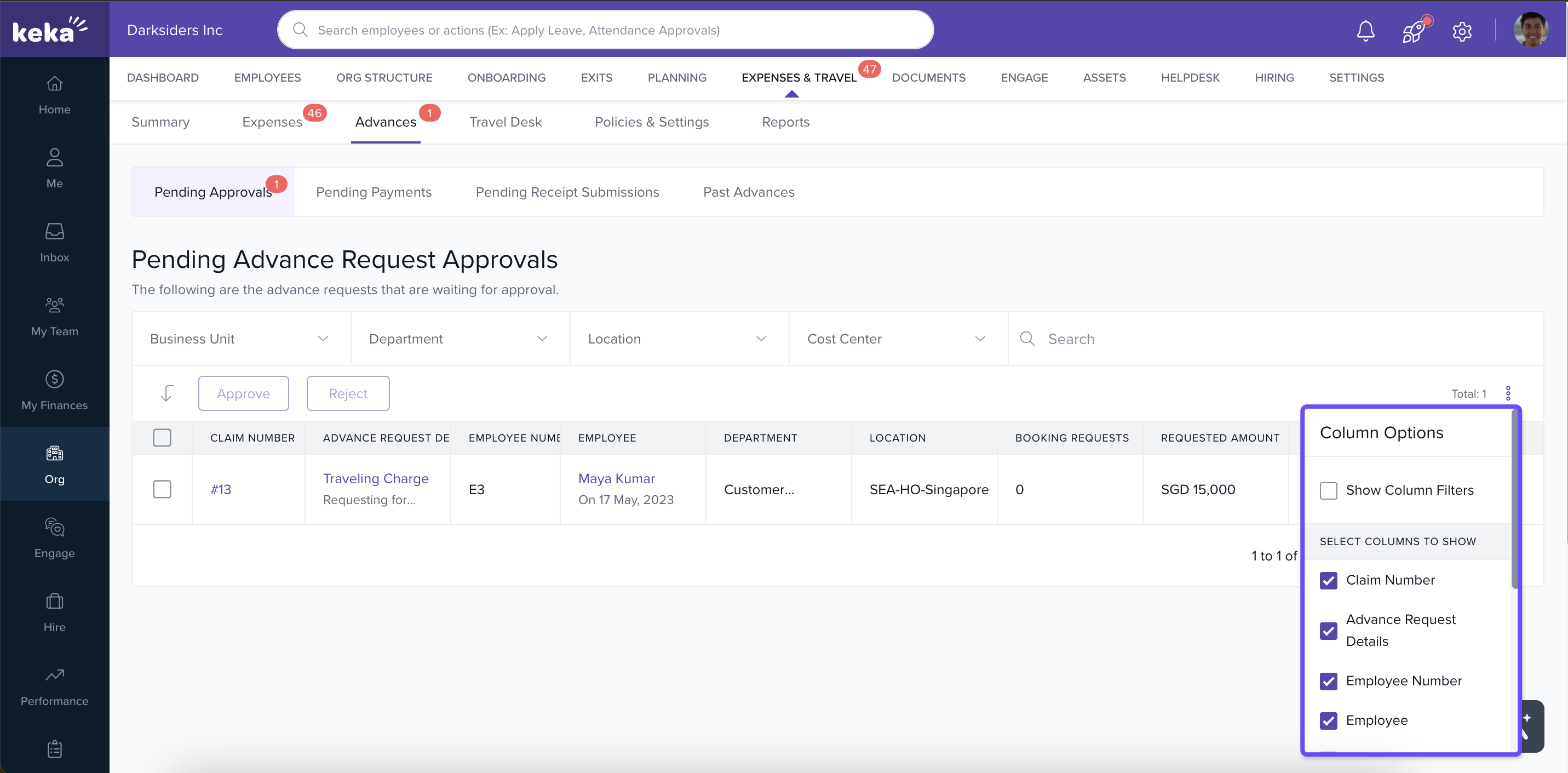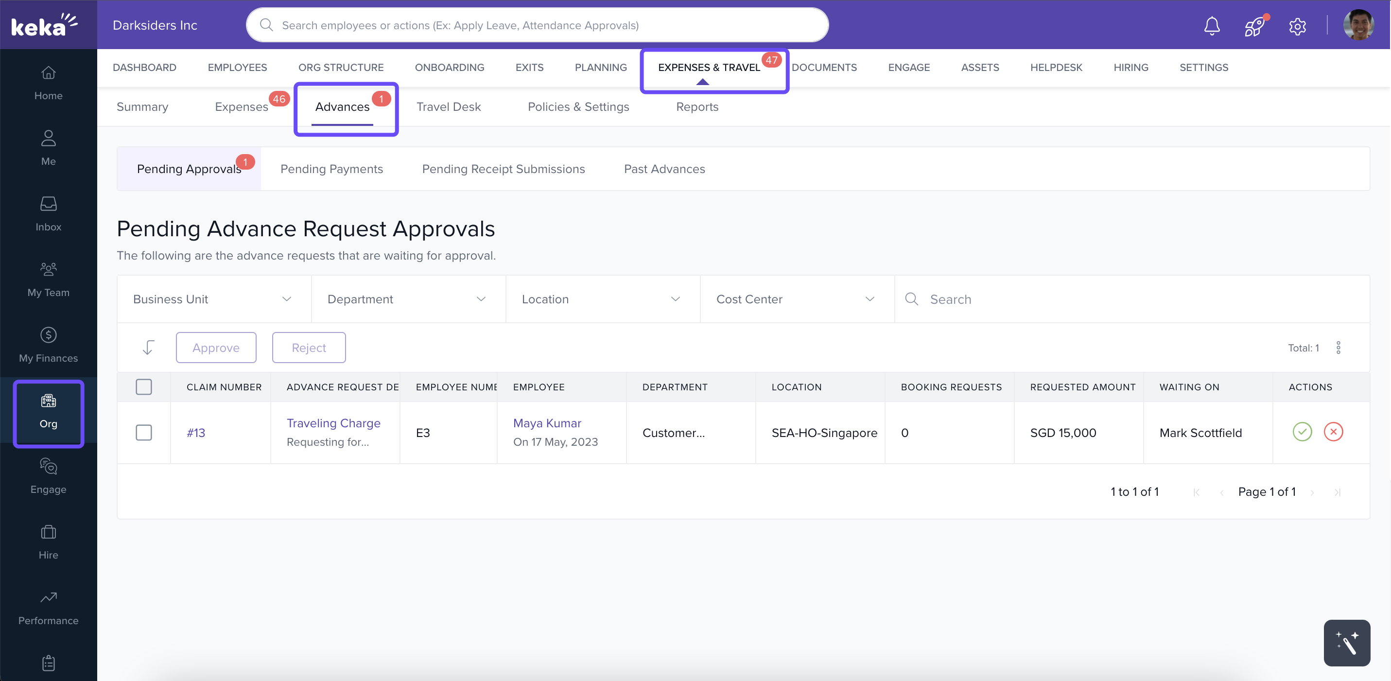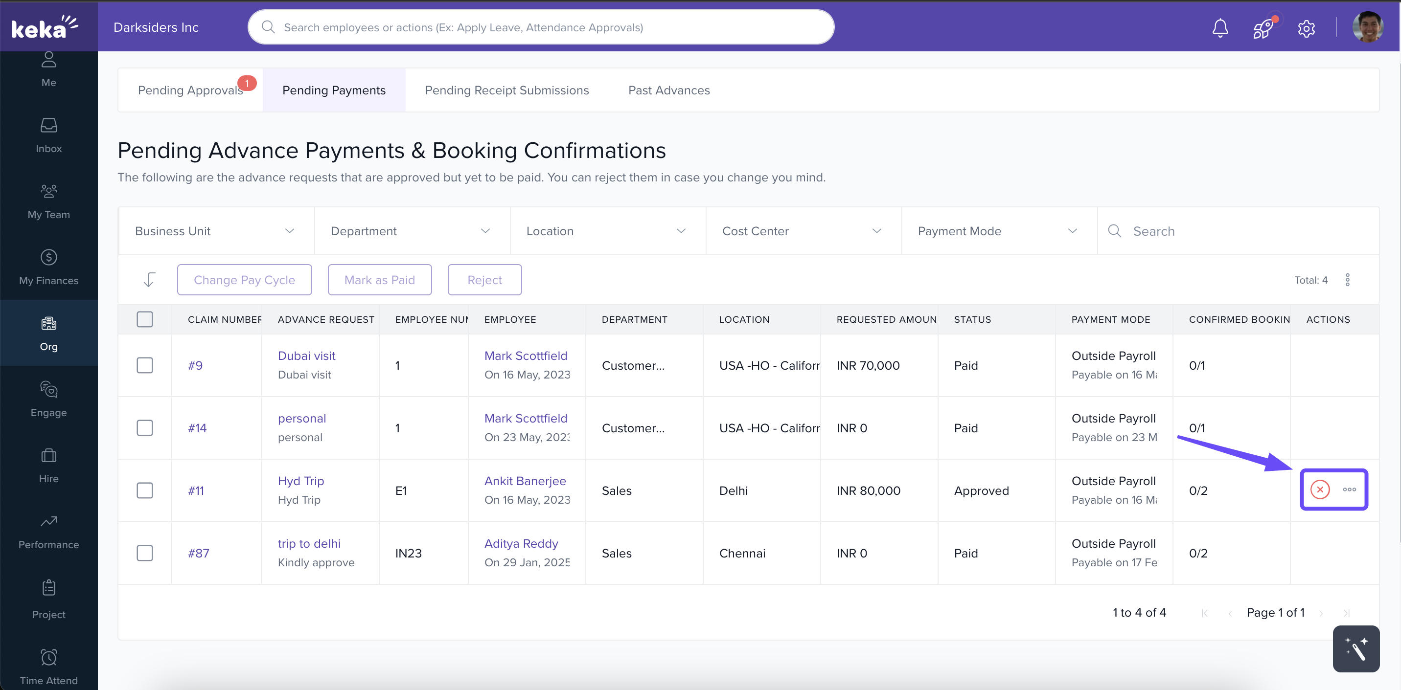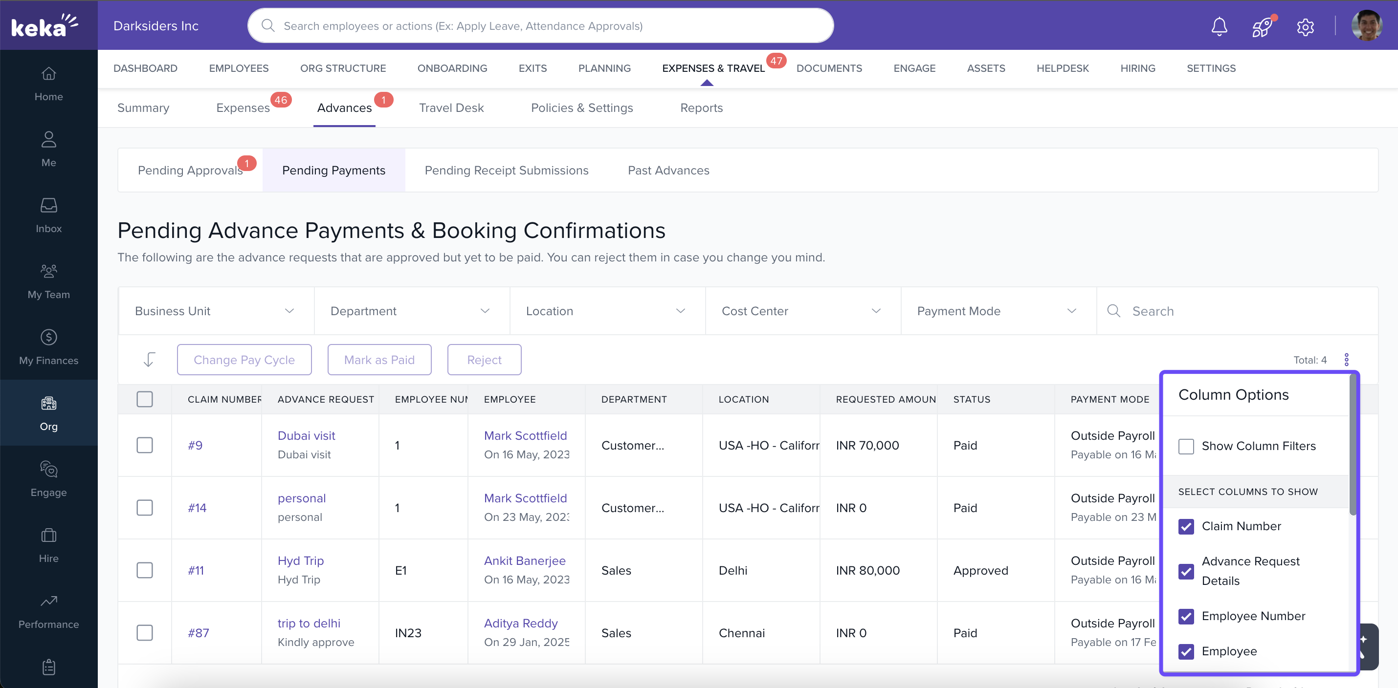 The Advances tab in Keka streamlines how organizations manage advance requests—whether for cash or travel. It lets admins monitor approvals, oversee payments, track pending receipts, and review past advances all in one place.