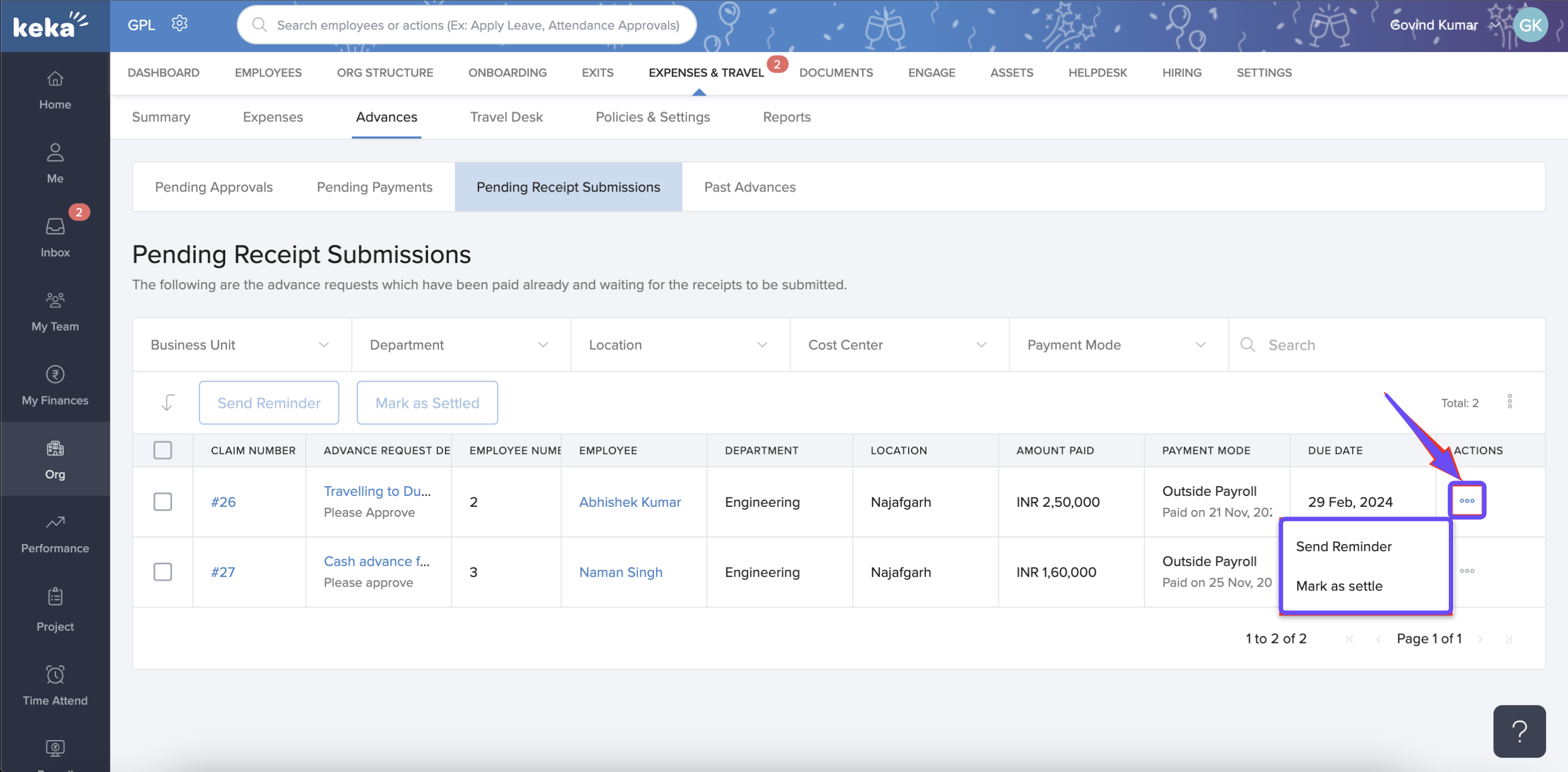 Use the three-dot menu to Send Reminder to employees or Mark as Settled once receipts are received. Bulk actions work here too.
