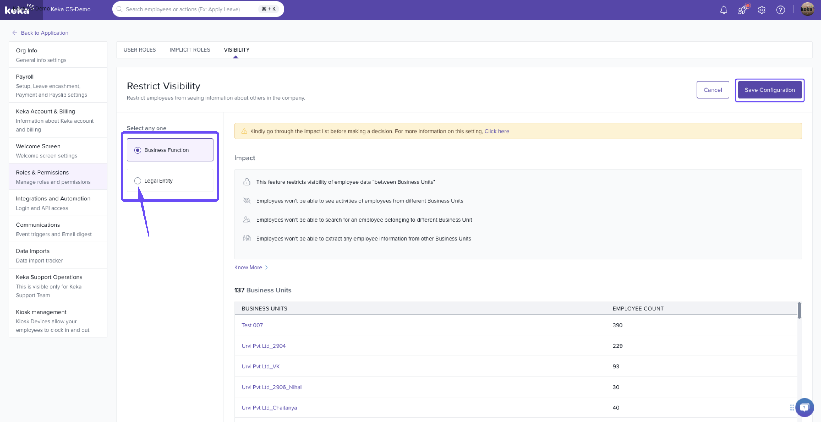- Employees from 1 Legal Entity/Business Unit won’t be able to see employees from other Legal Entity /Business Unit