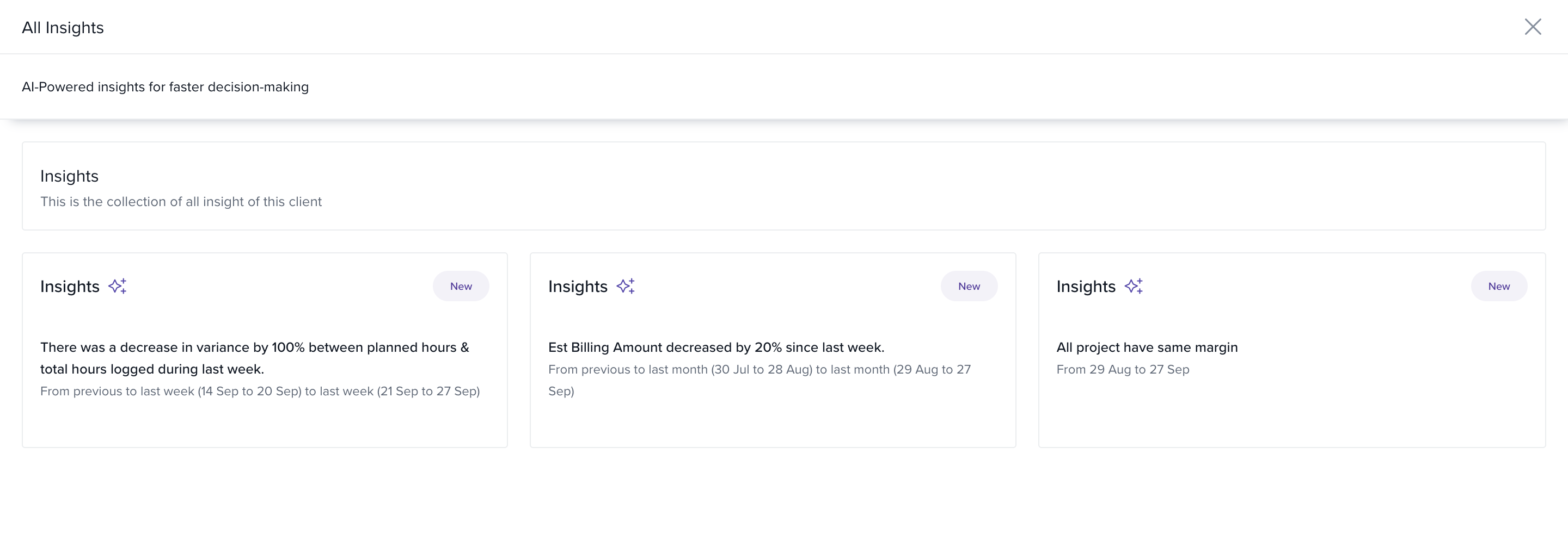 - Insights are automatically generated using live project and client data in real time.
