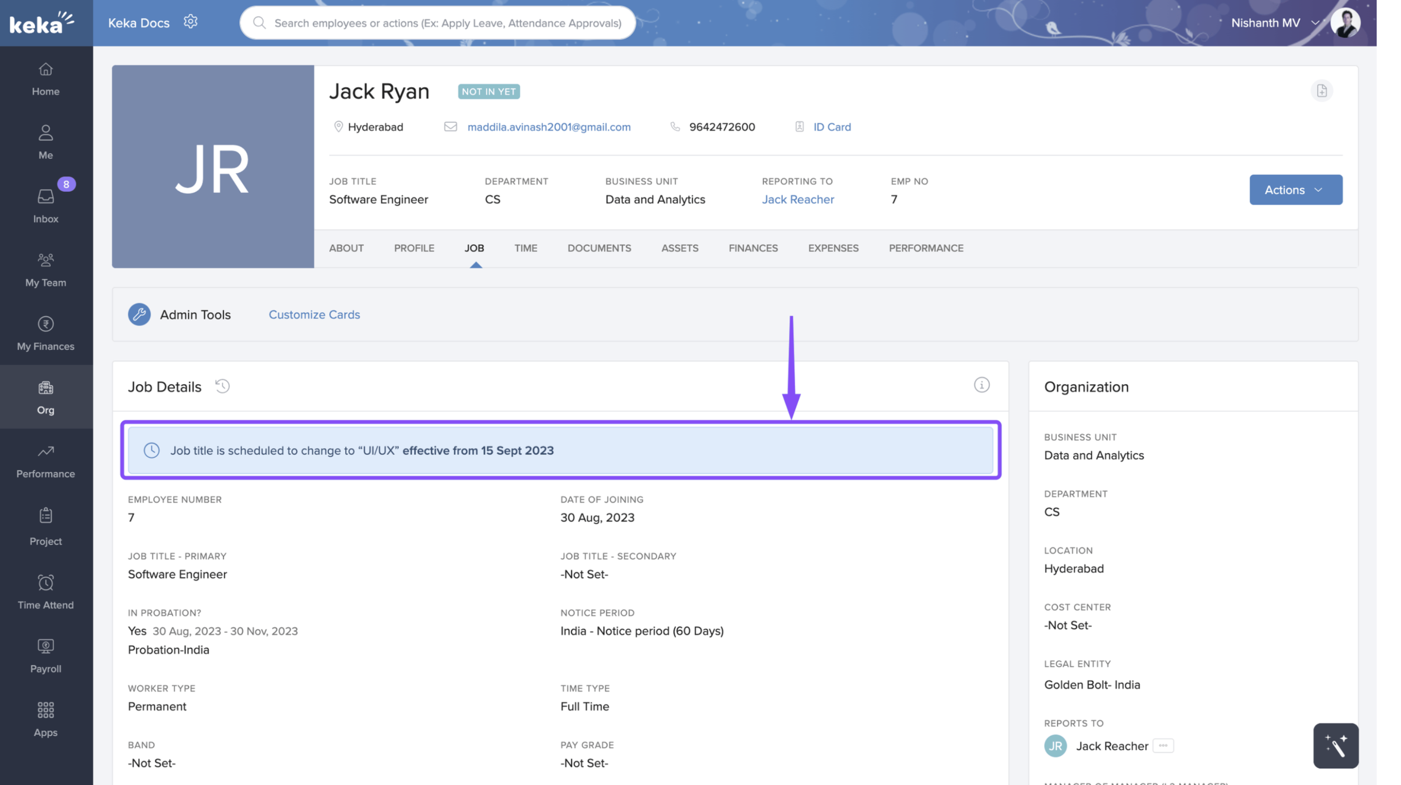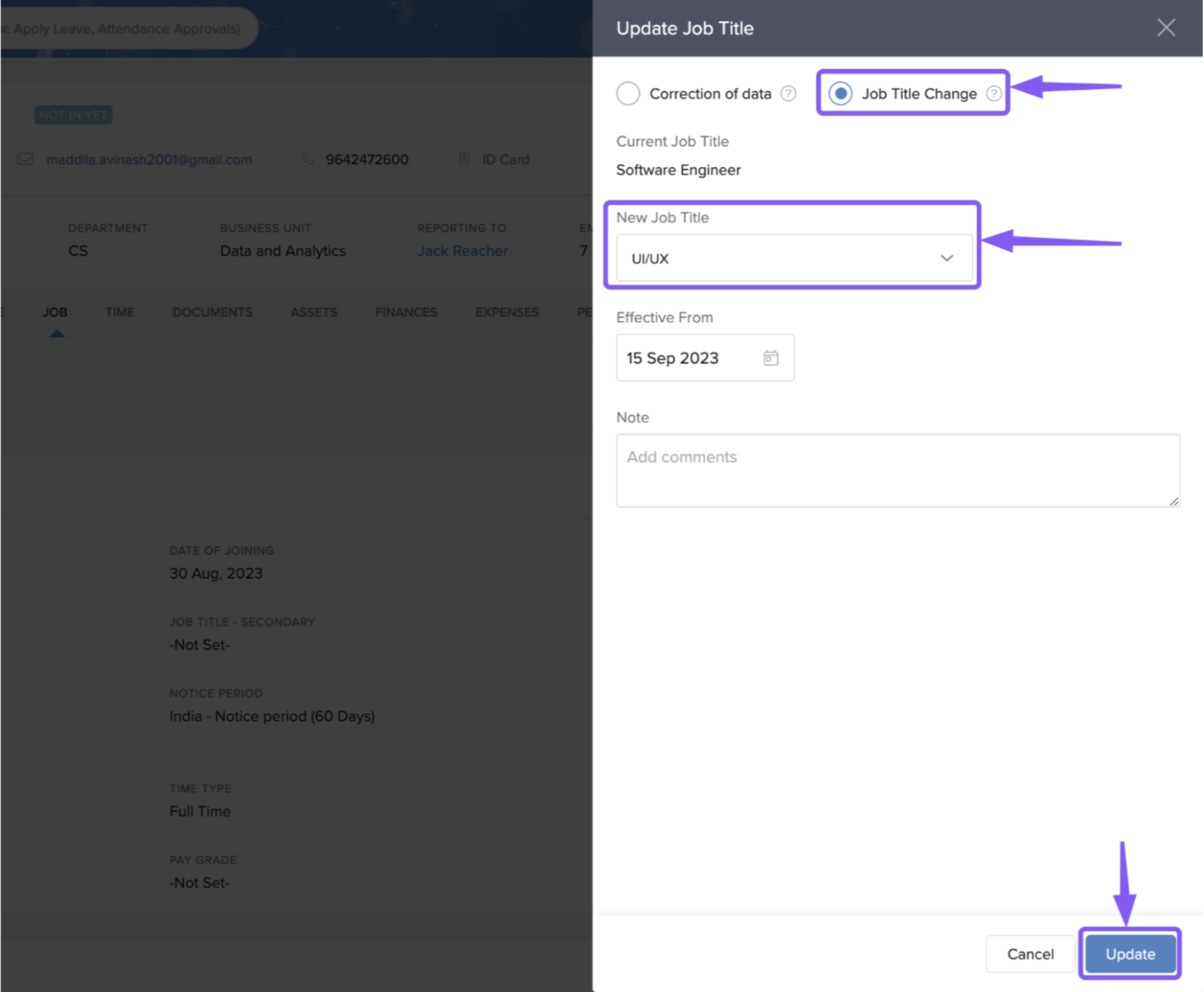 - The new job title and effective date will be displayed in the employee's Job Details section.