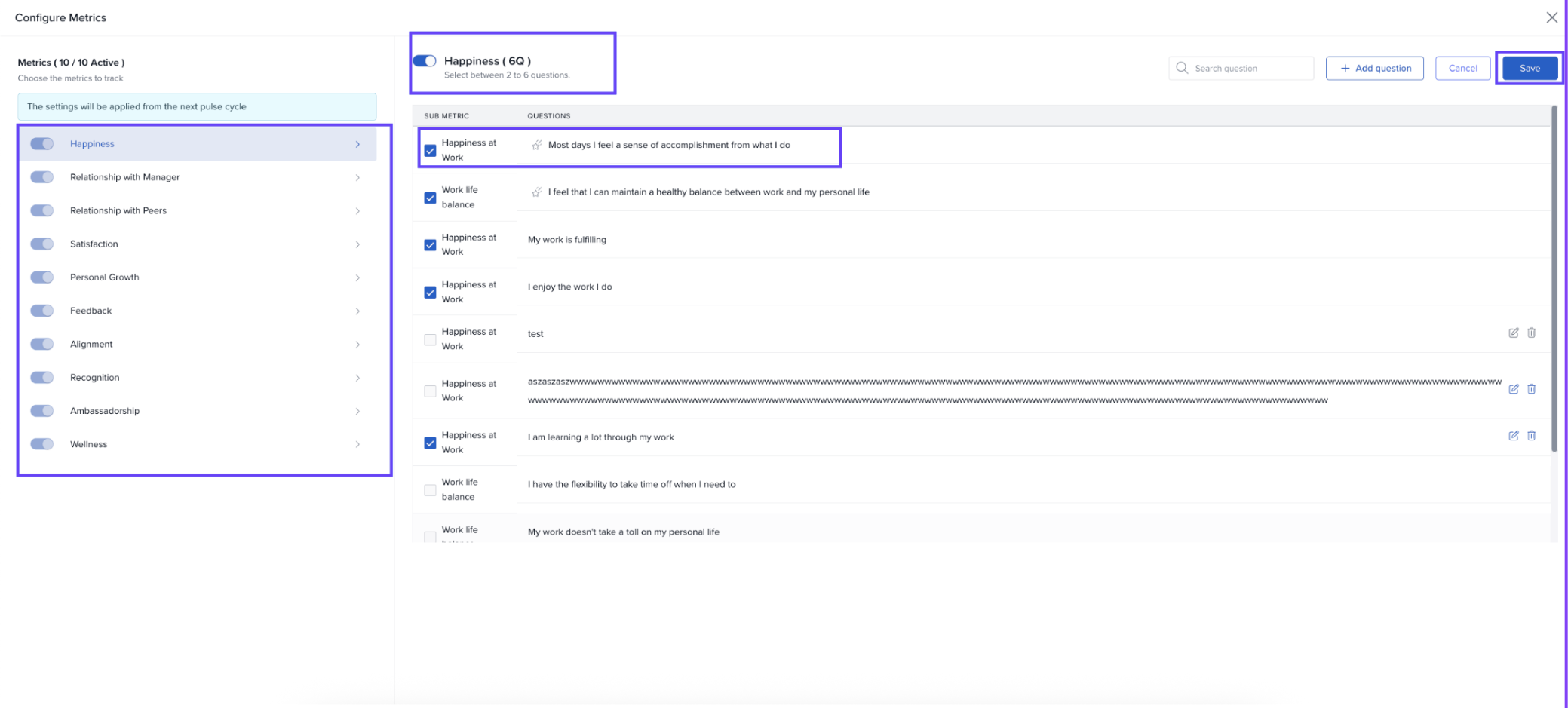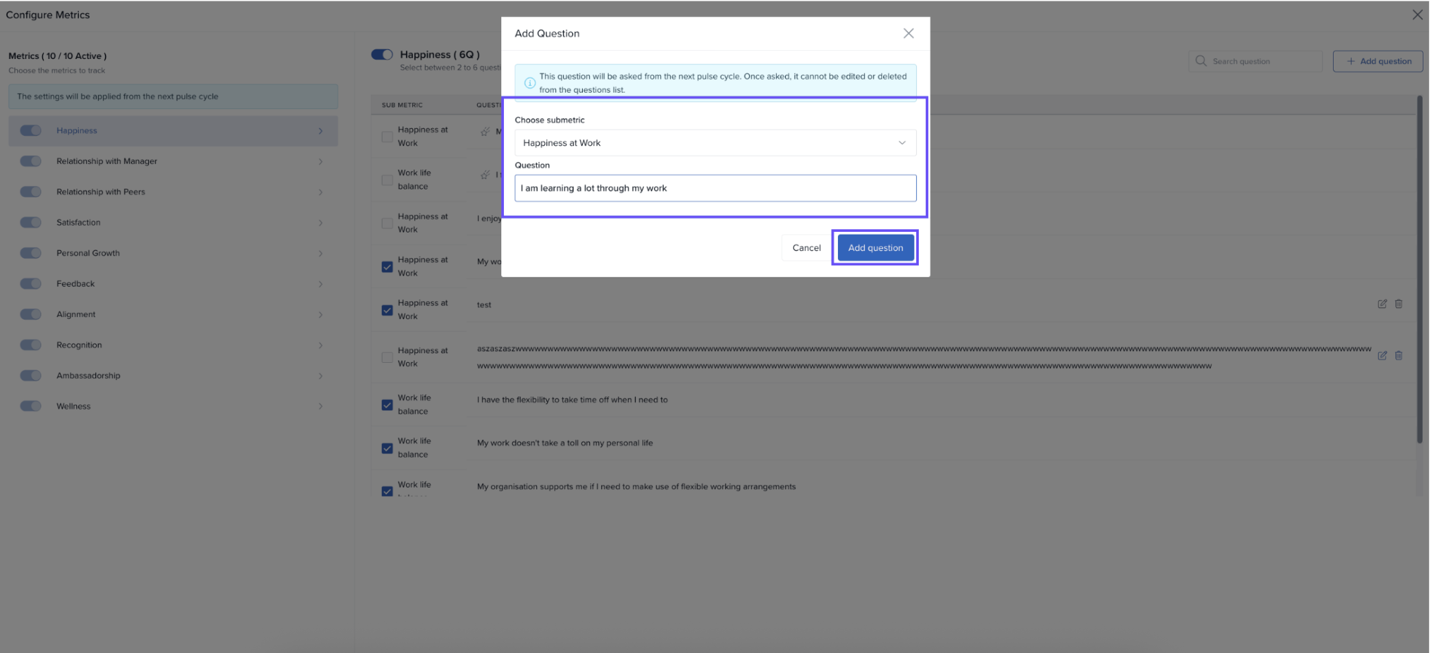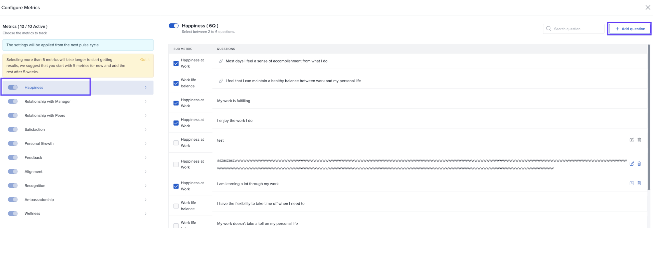 Customisable Questions: Within each metric, you can now choose up to five questions, offering more targeted feedback while reducing survey fatigue.