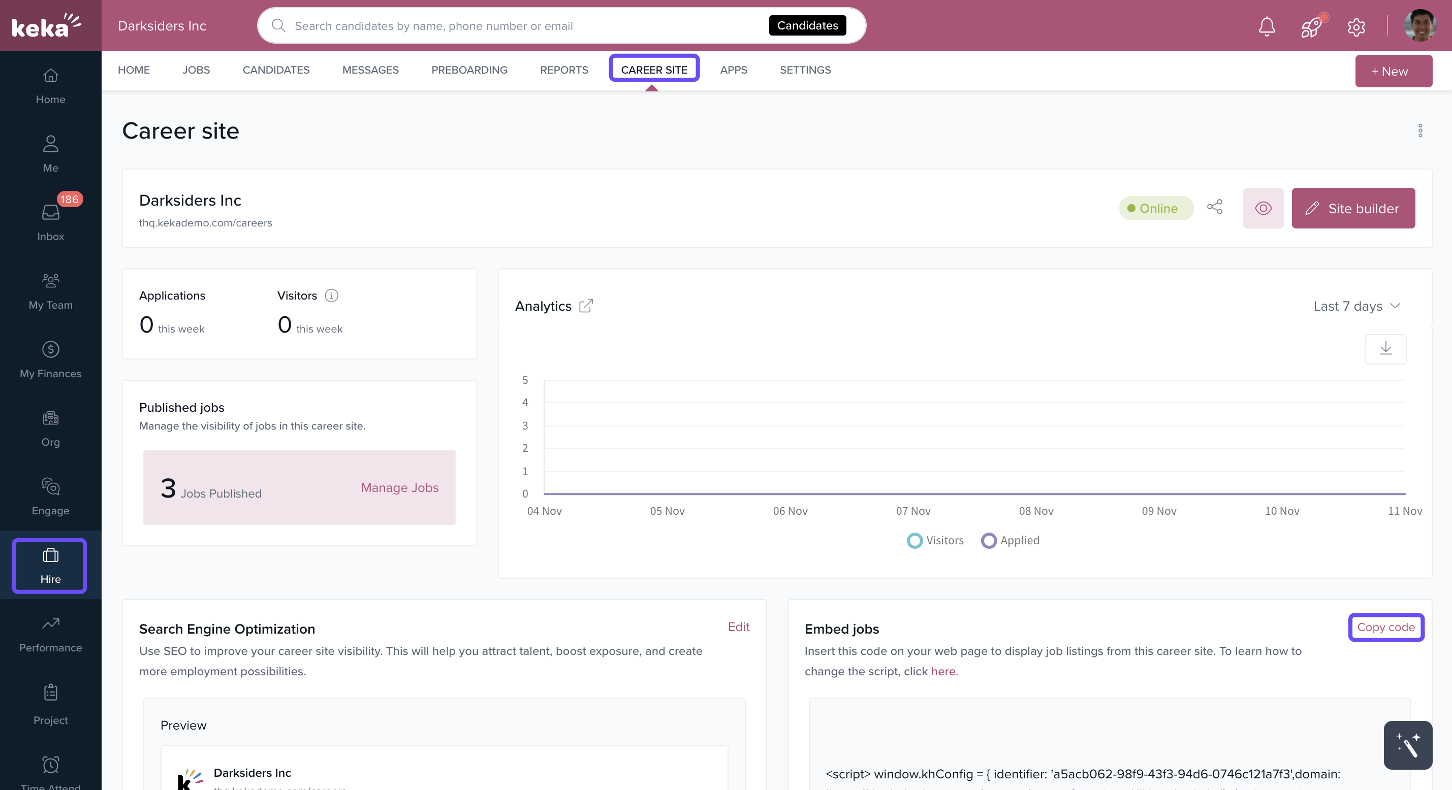 On the Career Site dashboard, you’ll see a summary of your published jobs, visitors, applications, and analytics.