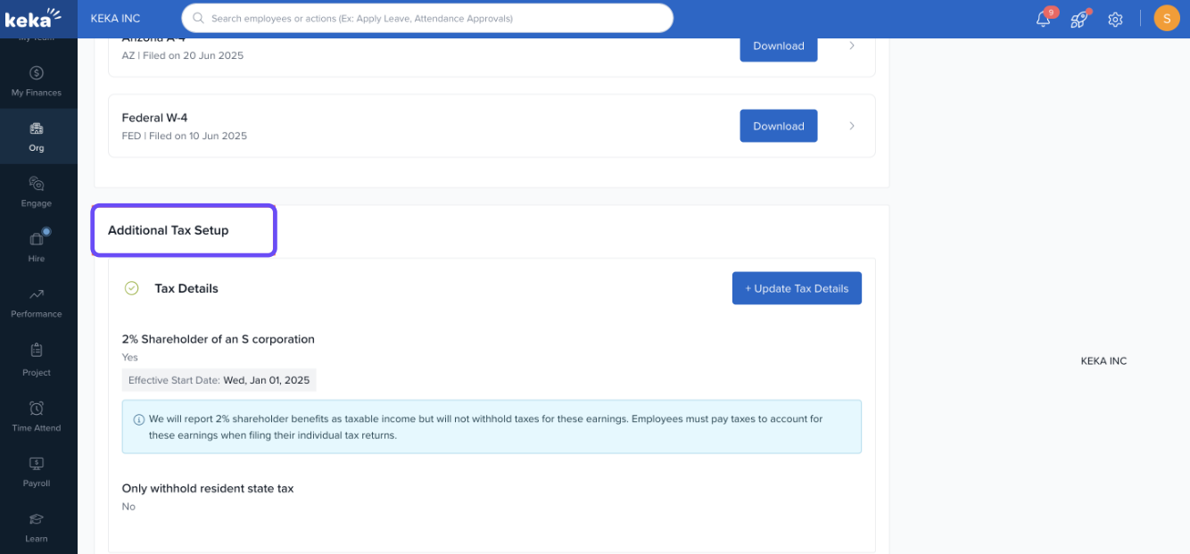 While these earnings will be included in the employee’s W-2, no taxes will be withheld by Keka. The employee must handle tax payments when filing their personal returns.
