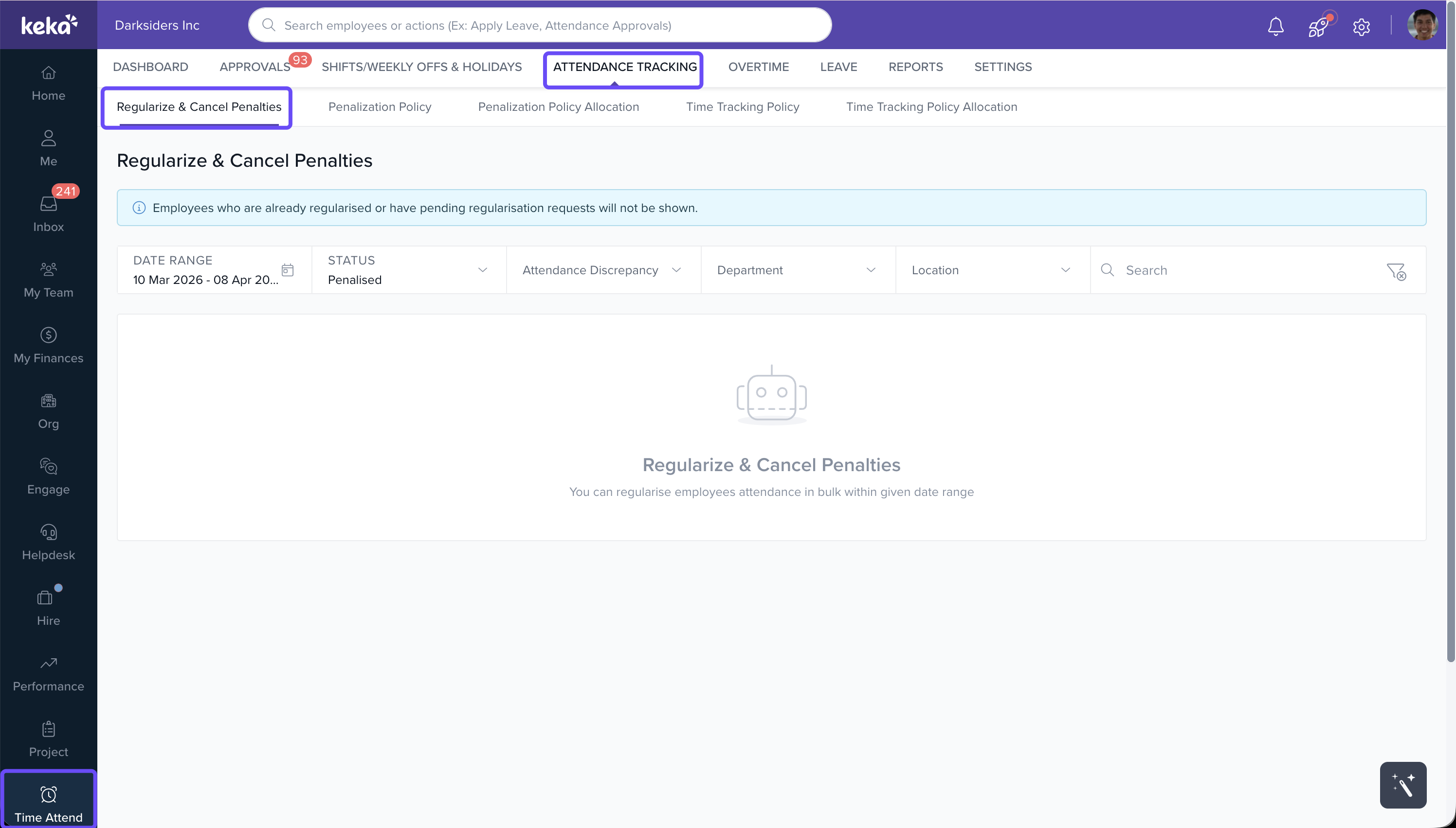 Keka HRMS provides the Regularize & Cancel Penalties workflow to help HR managers and team leaders review attendance penalties for multiple employees in one place. This is useful when attendance discrepancies occur across teams due to technical glitches, mass updates, or policy changes.
