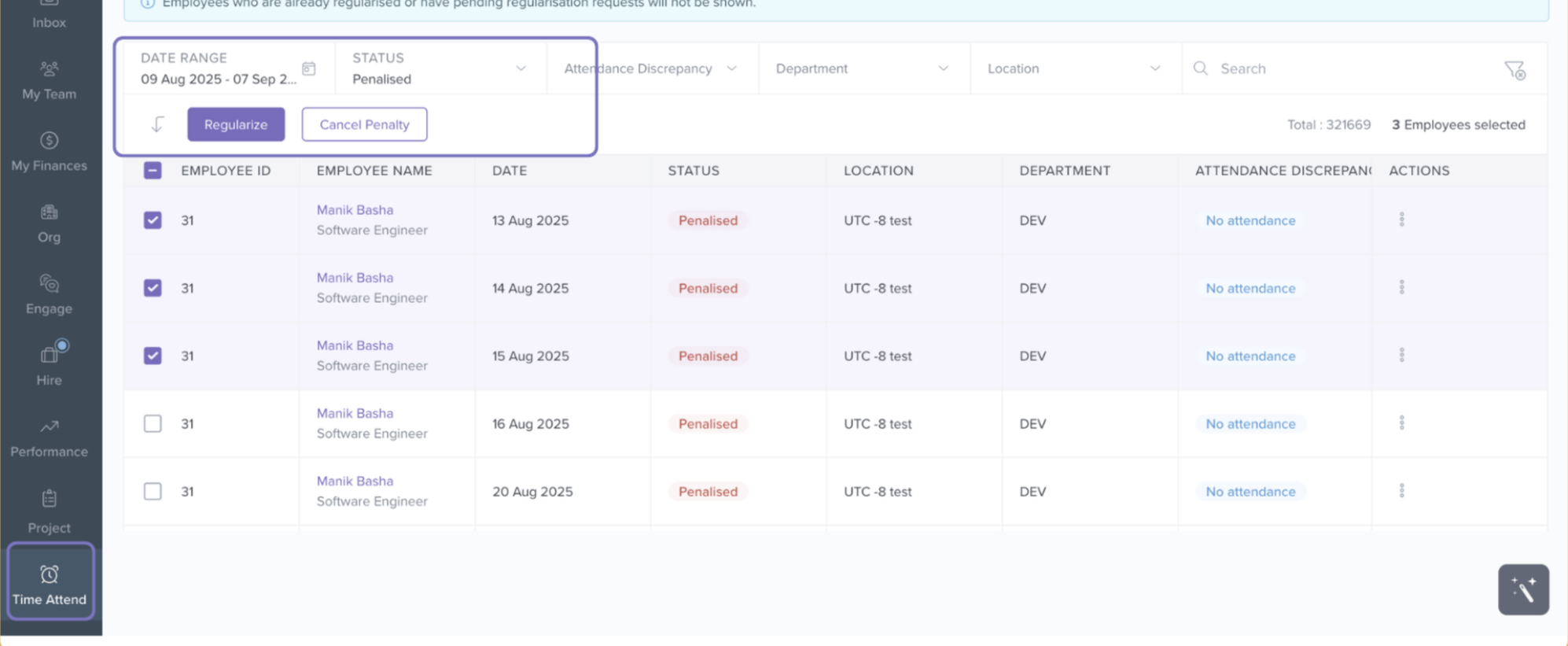 Instead of reviewing penalised records one by one, you can regularise attendance or cancel penalties in bulk—saving time and keeping attendance records accurate.