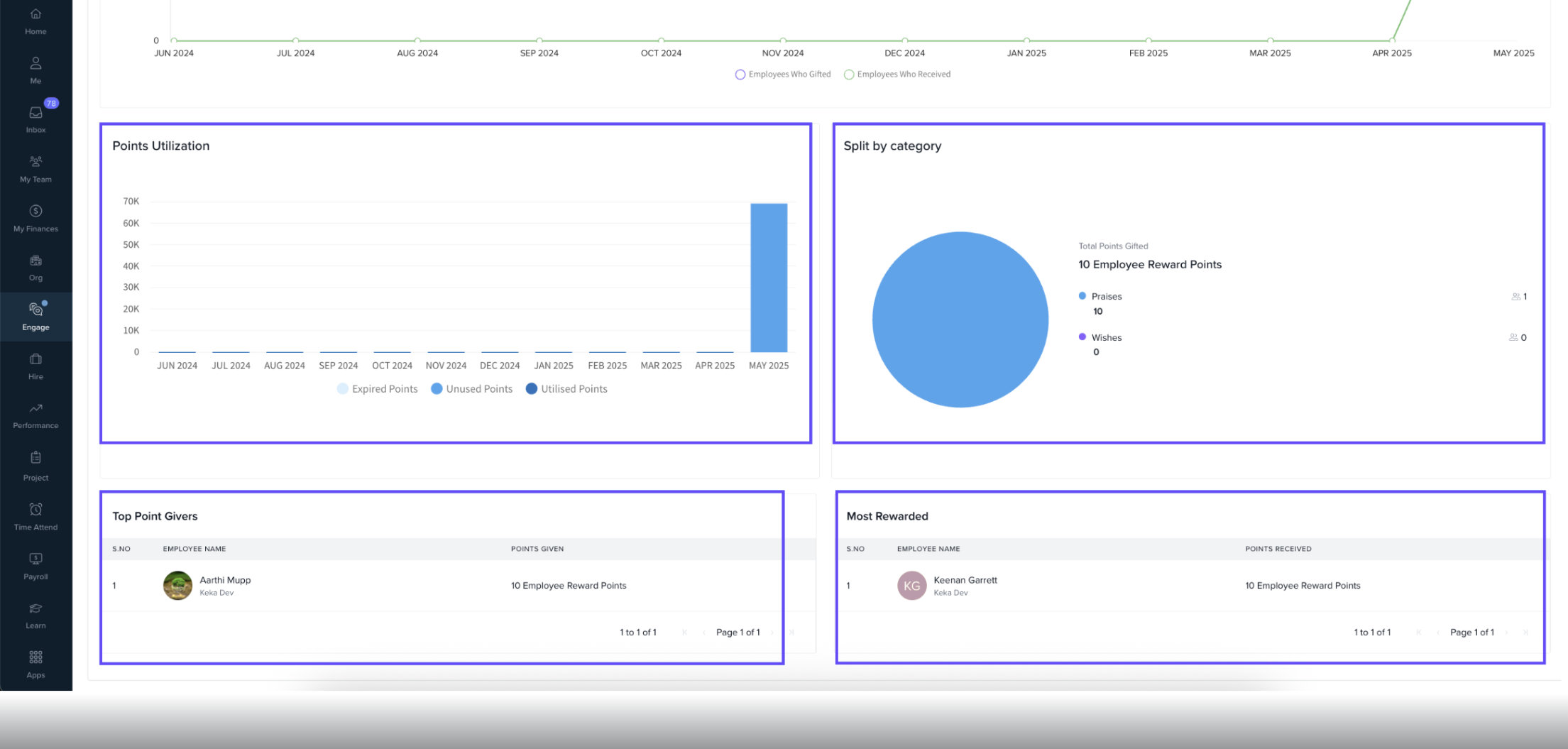 Top Point Givers & Most Rewarded: Shows who gave and received the most rewards.
