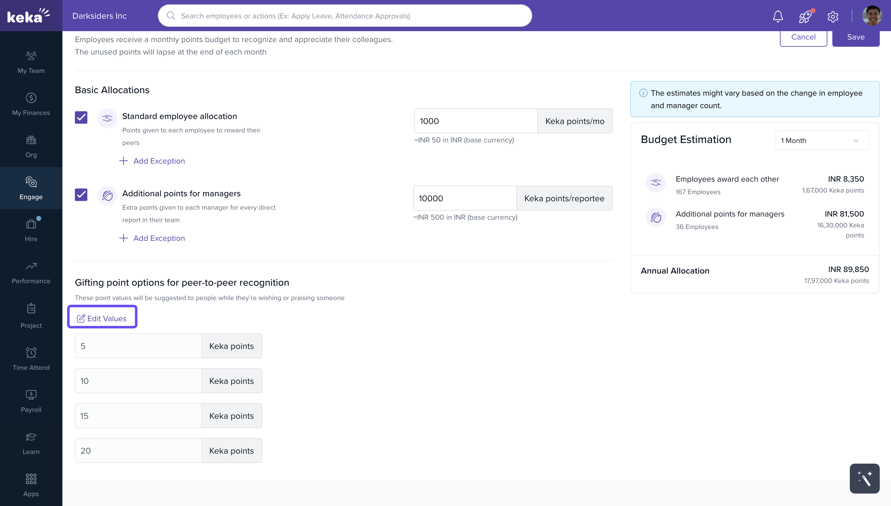 Set how many points employees and managers can gift each month: