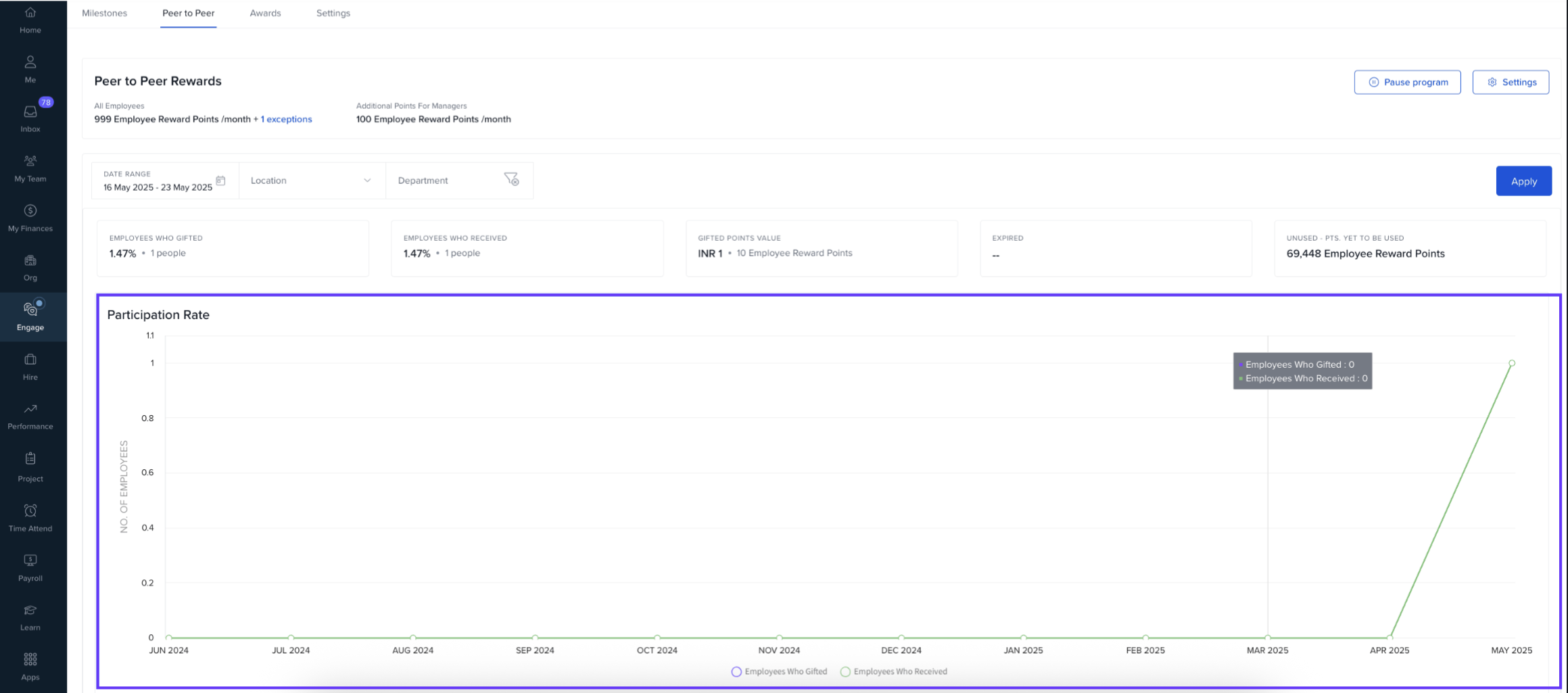 Participation Rate: Measures engagement by tracking how many employees gifted or received points.