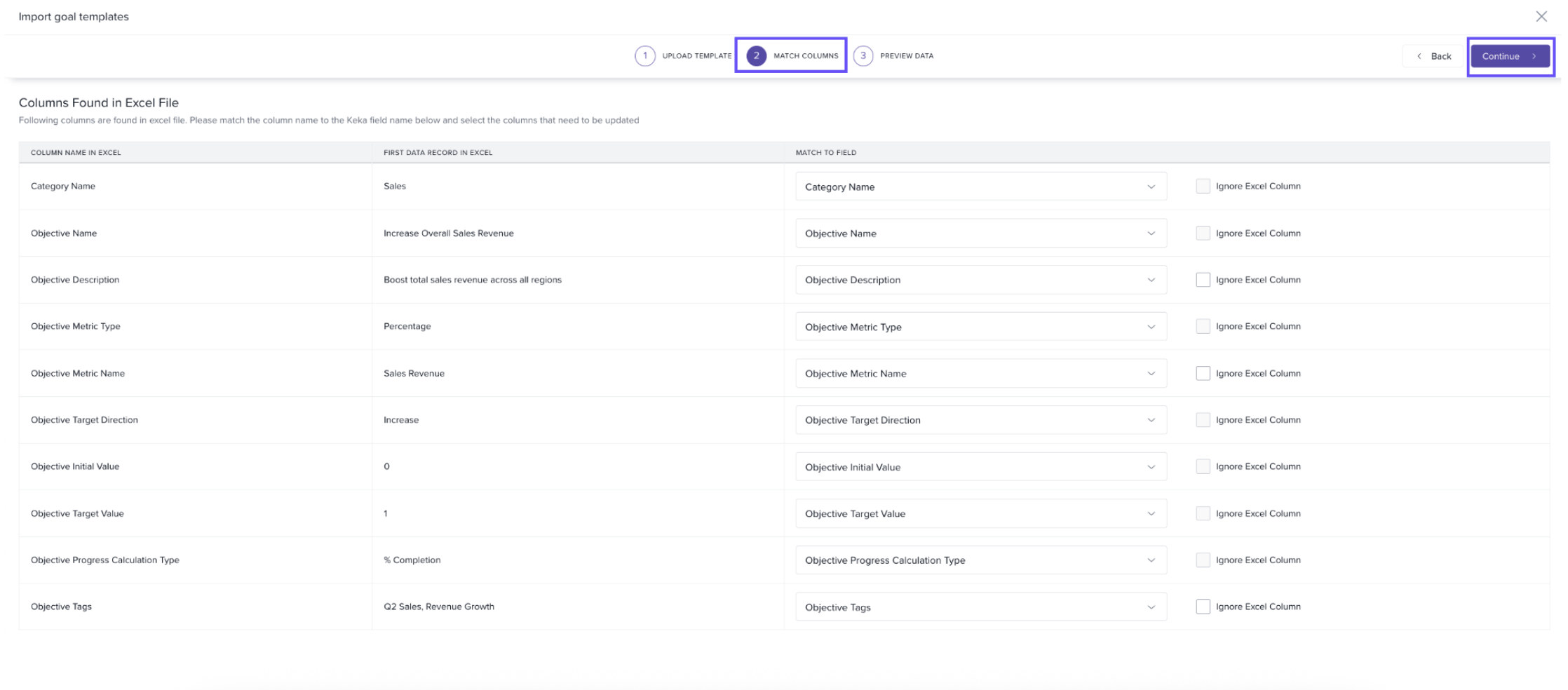 Then proceed to match the columns to ensure fields from your Excel sheet map correctly with Keka fields and click on Continue once done.